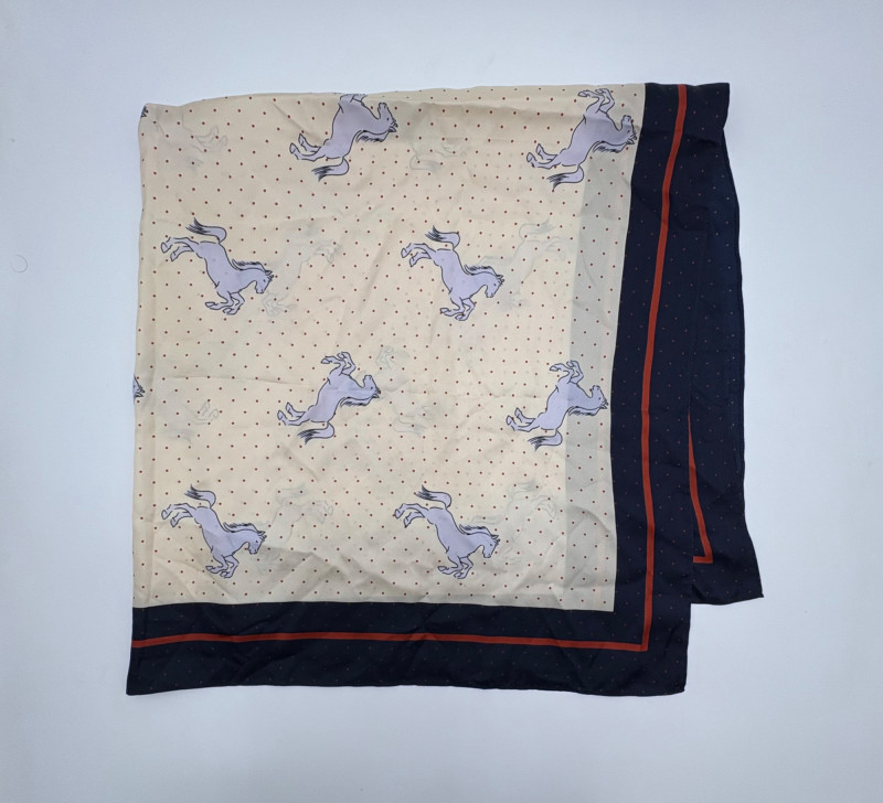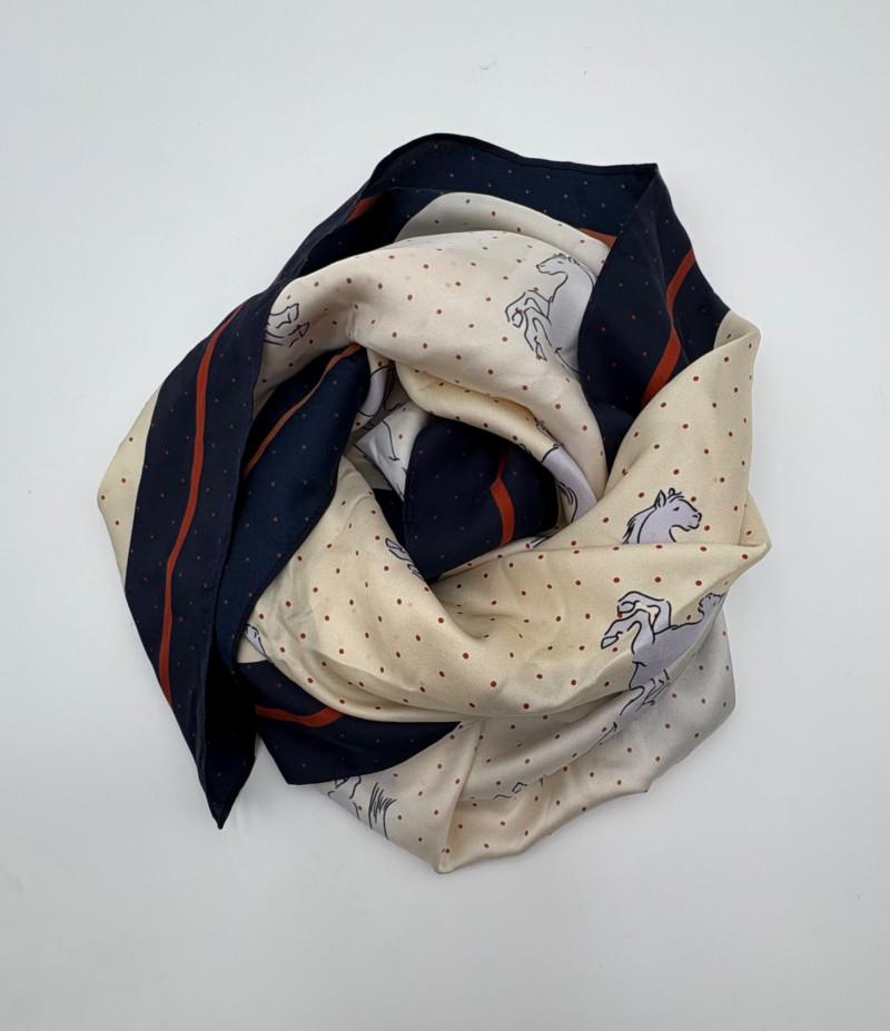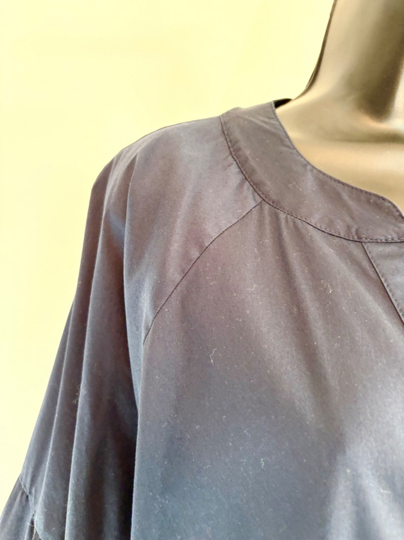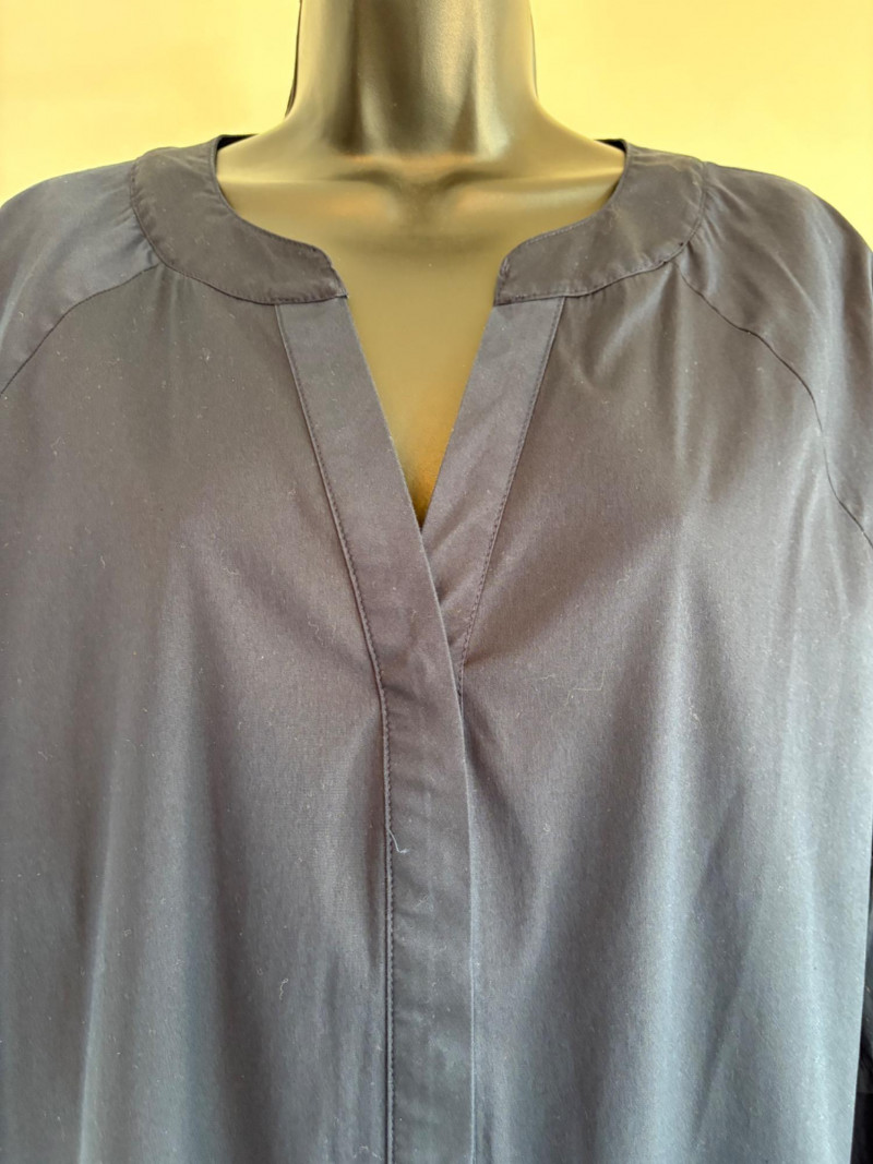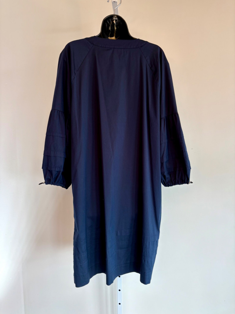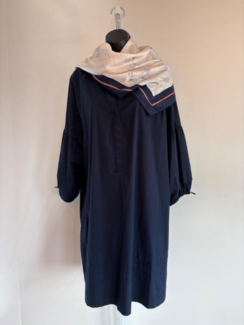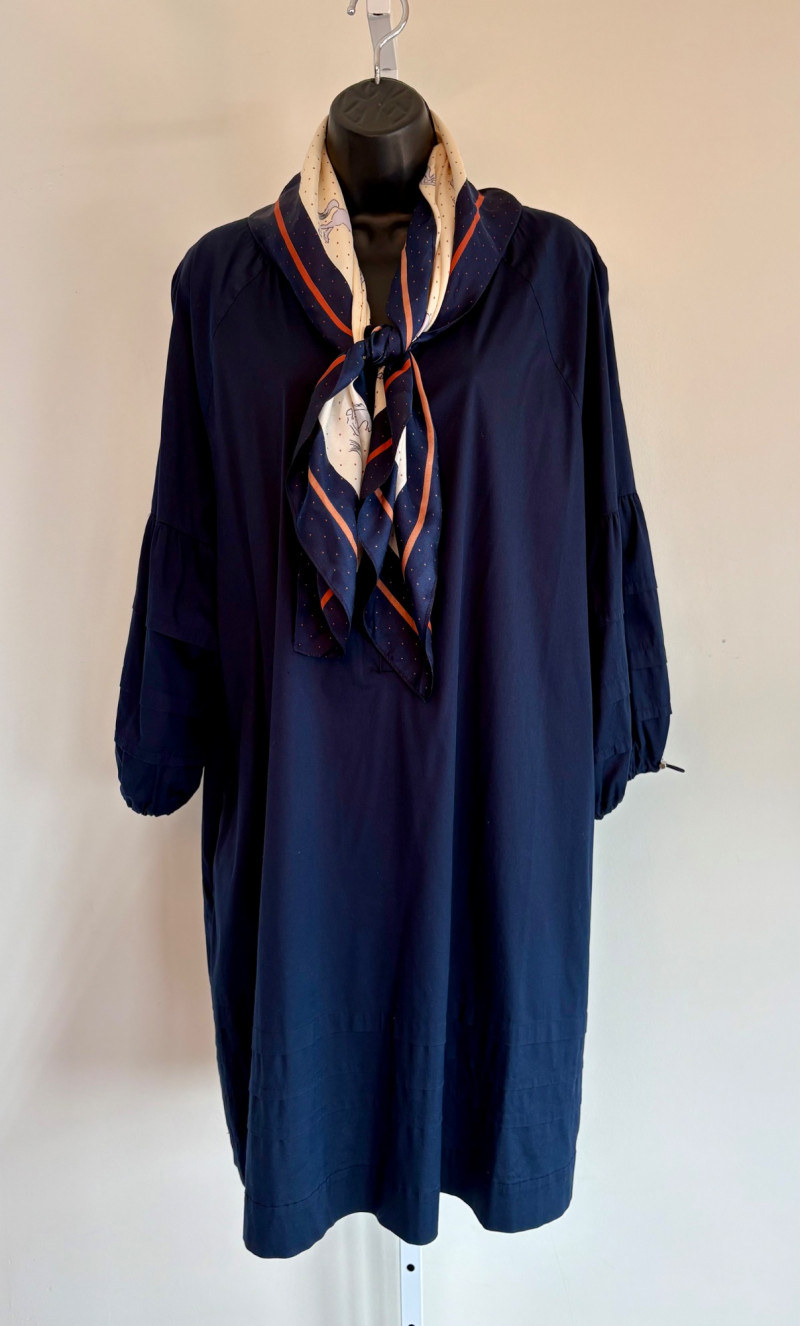 This wonderfully versatile dress from Chico's could go from a day at the beach with sandals to a night out with heels and dressy jewelry. Deep navy blue poplin dress has tunic-style front with banded collar, hidden button placket, and raglan sleeve construction. Unique lower sleeves are gathered at the elbow with decorative pleat bands and drawstrings/toggles at wrists. The same band design is repeated along the hemline. Cotton/nylon/spandex blend. Measures 23.5" pit to pit and 37.5" from back neckline to hem. Size tag says 3. Paired with traditional horse image scarf in navy blue, rust, and cream. Measures approximately 34' x 34". No maker or fabric tag, but feels like silk.