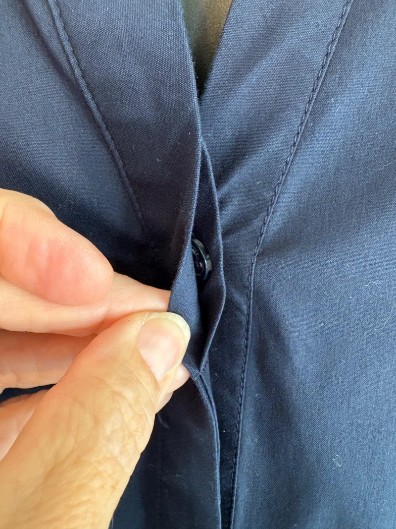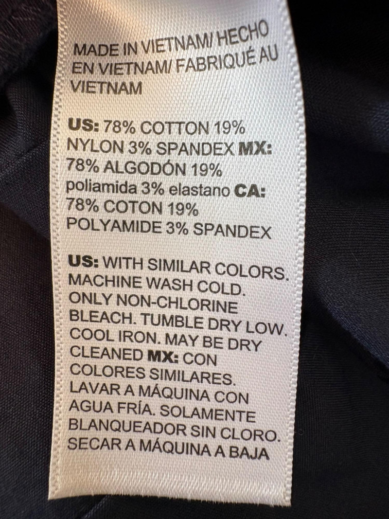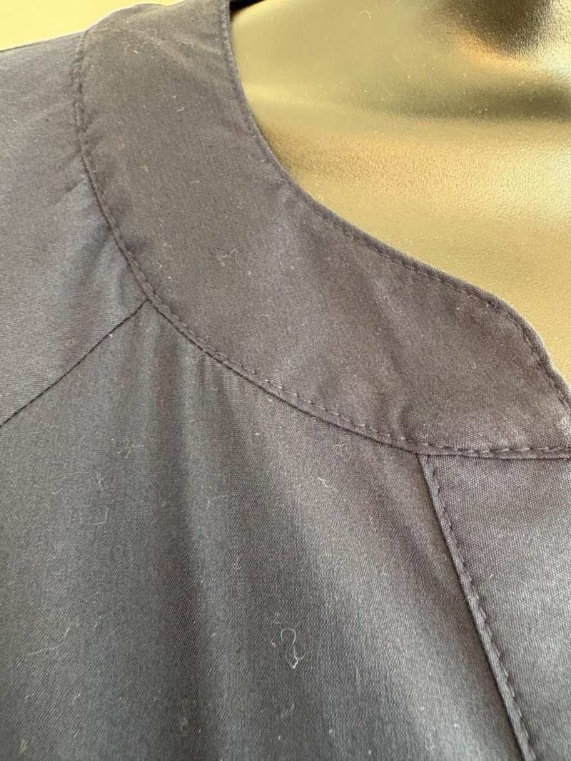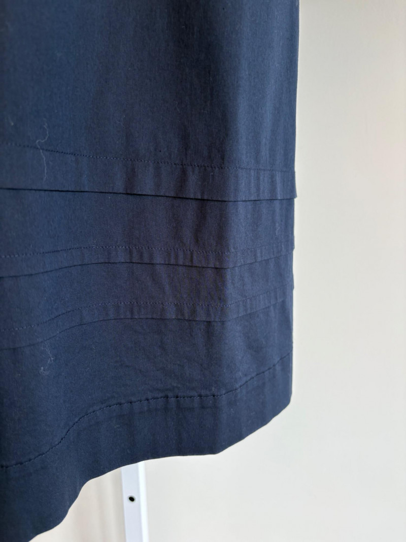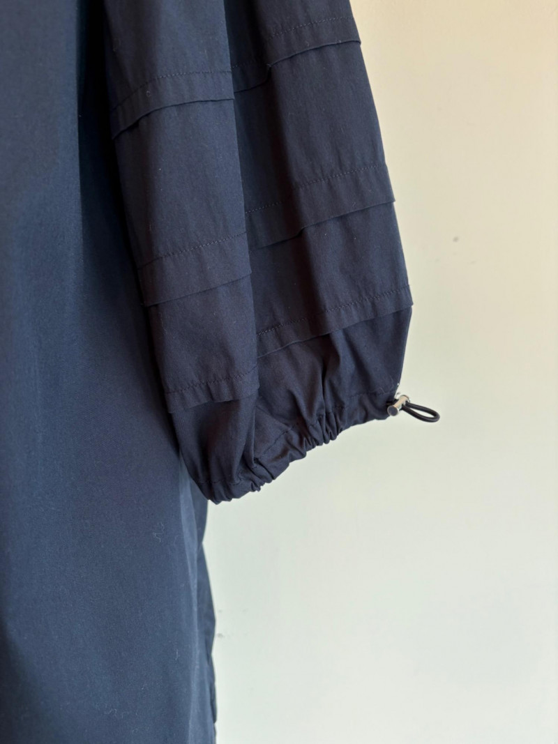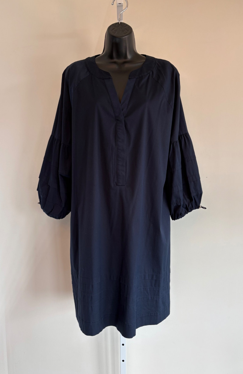 This wonderfully versatile dress from Chico's could go from a day at the beach with sandals to a night out with heels and dressy jewelry. Deep navy blue poplin dress has tunic-style front with banded collar, hidden button placket, and raglan sleeve construction. Unique lower sleeves are gathered at the elbow with decorative pleat bands and drawstrings/toggles at wrists. The same band design is repeated along the hemline. Cotton/nylon/spandex blend. Measures 23.5" pit to pit and 37.5" from back neckline to hem. Size tag says 3. Paired with traditional horse image scarf in navy blue, rust, and cream. Measures approximately 34' x 34". No maker or fabric tag, but feels like silk.