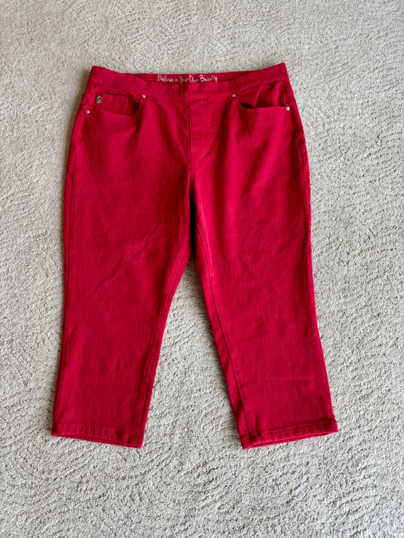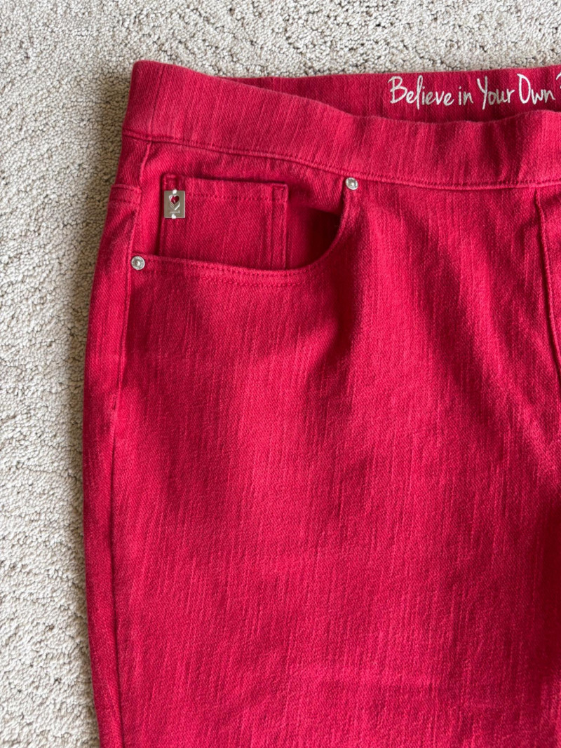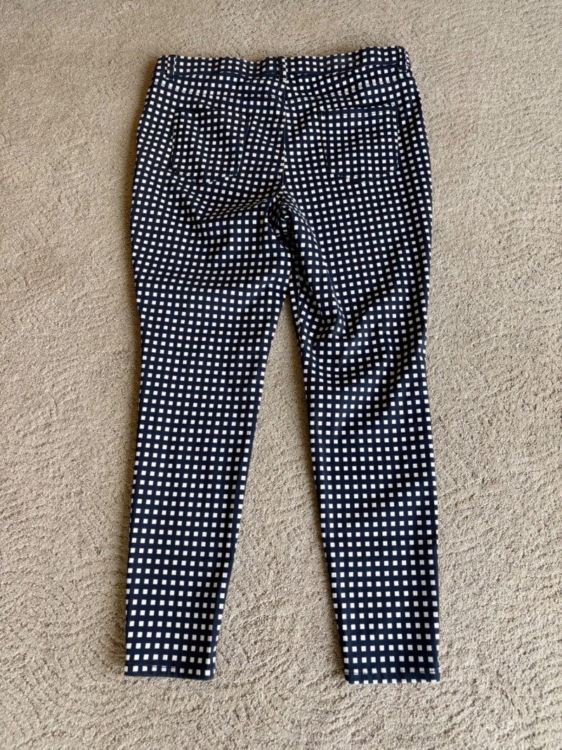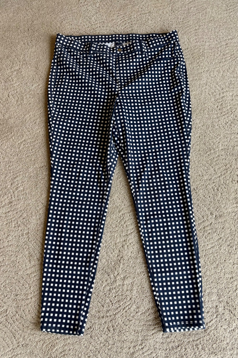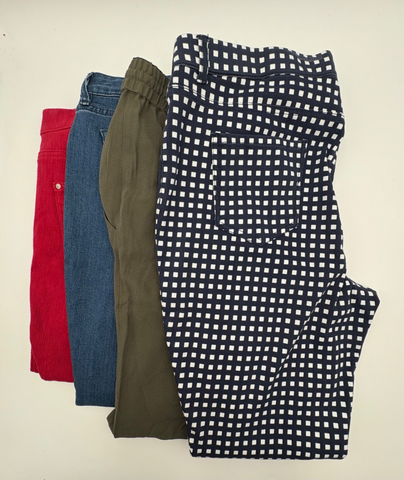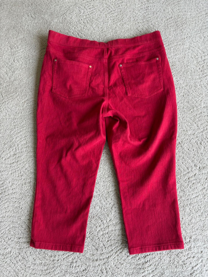 4 pairs of pants in silk & stretch for comfort. All measure 18.5" side to side at waist. Belle red stretch denim pull-up cropped pants have classic 5-pocket jeans styling (faux fly). Cotton/spandex blend. Size tag says 16. Mizrahi stretch denim classic 5-pocket jeans with a bit of spandex for comfort. Cotton/polyester/viscose/elastane blend Size tag says 16. Eileen Fisher green silk pants have elasticated waist with drawstring and set-in front pockets. 100% silk. Size tag says L. Note that these look terribly wrinkly in photos from storage, but a quick shot of steam transforms them. Legacy navy & white check faux jeans/jeggings in a twill texture stretch fabric. Cotton/polyester/spandex blend. Size tag says L.