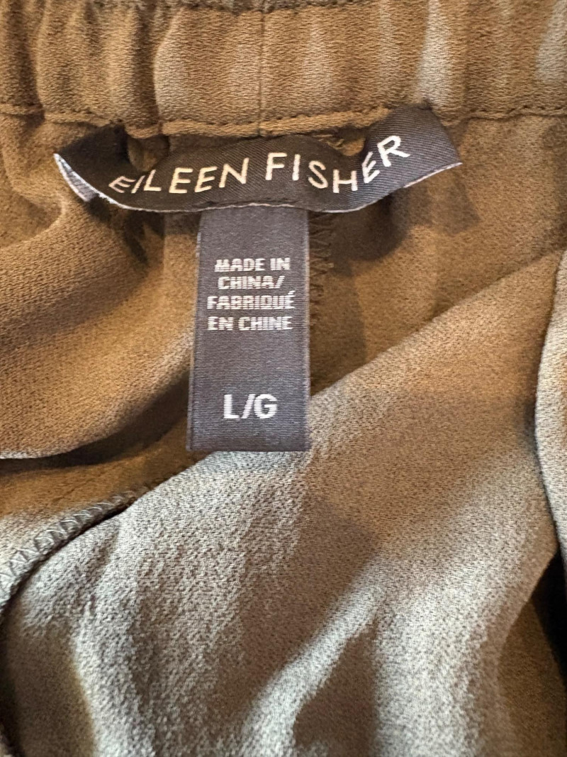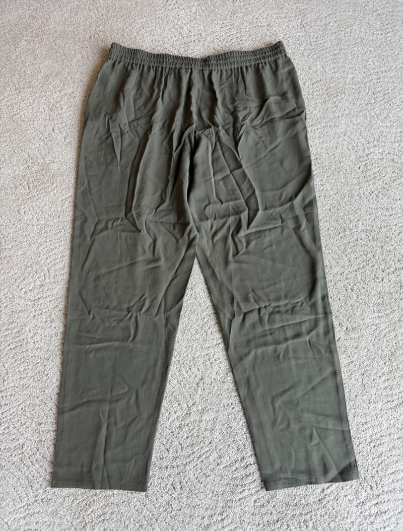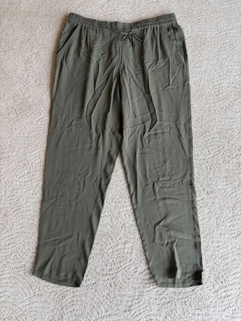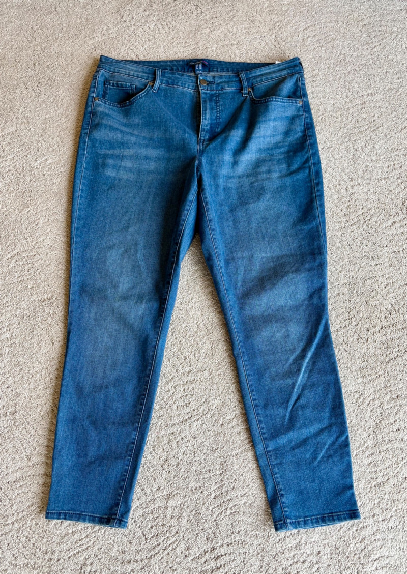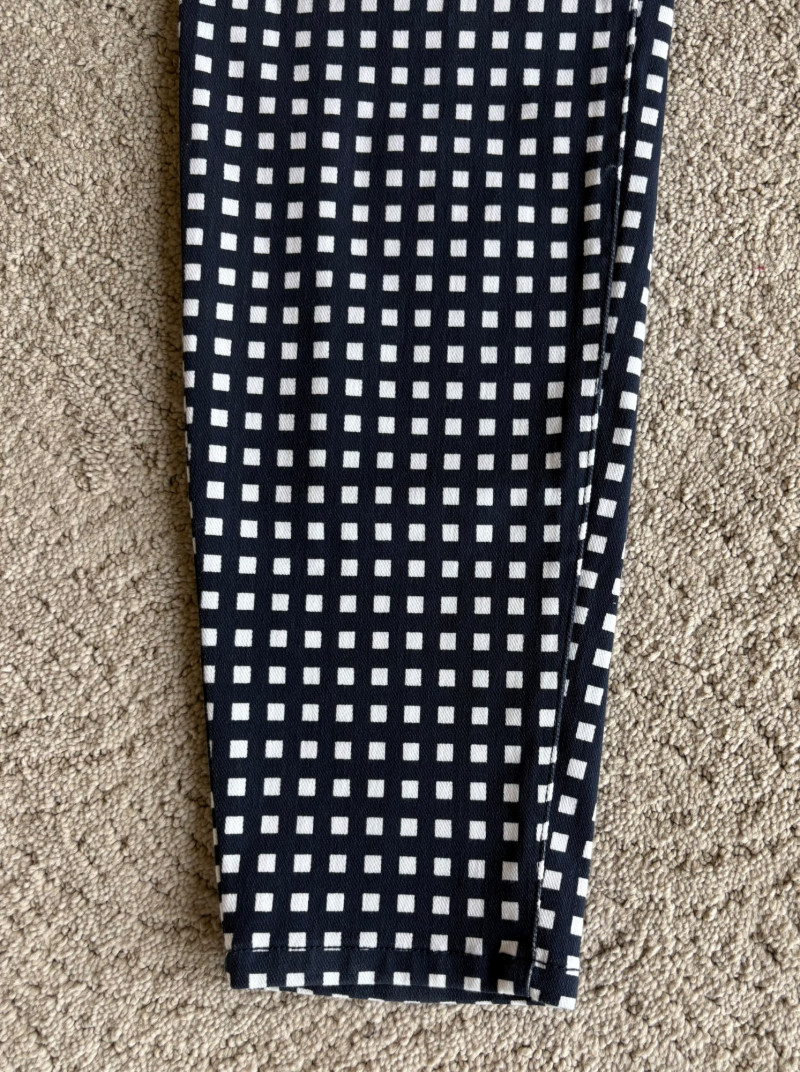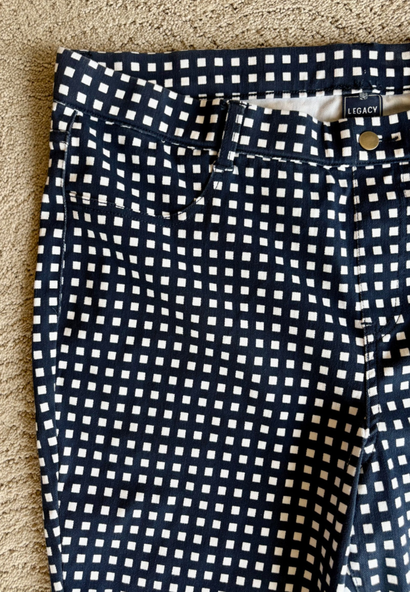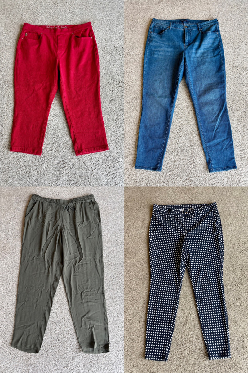 4 pairs of pants in silk & stretch for comfort. All measure 18.5" side to side at waist. Belle red stretch denim pull-up cropped pants have classic 5-pocket jeans styling (faux fly). Cotton/spandex blend. Size tag says 16. Mizrahi stretch denim classic 5-pocket jeans with a bit of spandex for comfort. Cotton/polyester/viscose/elastane blend Size tag says 16. Eileen Fisher green silk pants have elasticated waist with drawstring and set-in front pockets. 100% silk. Size tag says L. Note that these look terribly wrinkly in photos from storage, but a quick shot of steam transforms them. Legacy navy & white check faux jeans/jeggings in a twill texture stretch fabric. Cotton/polyester/spandex blend. Size tag says L.