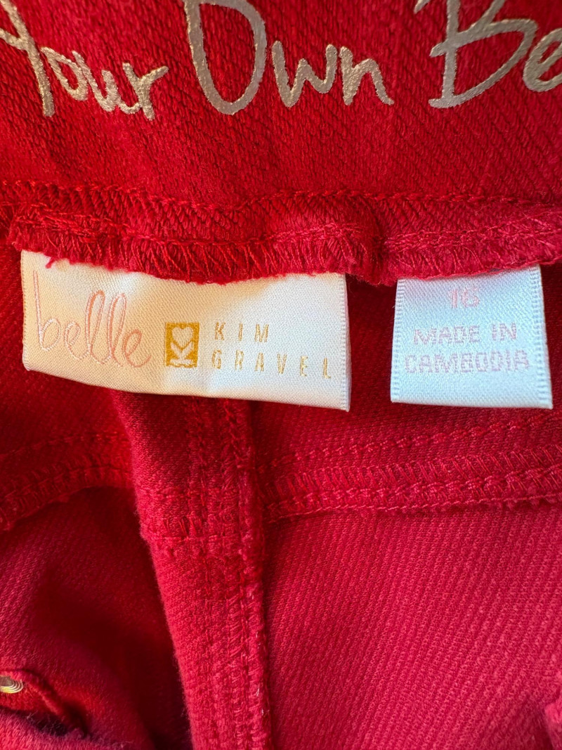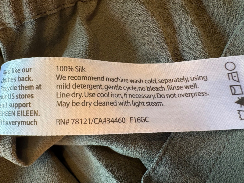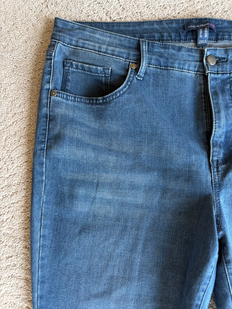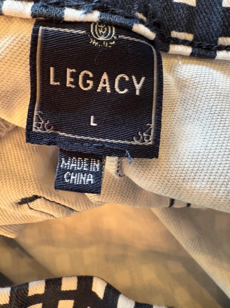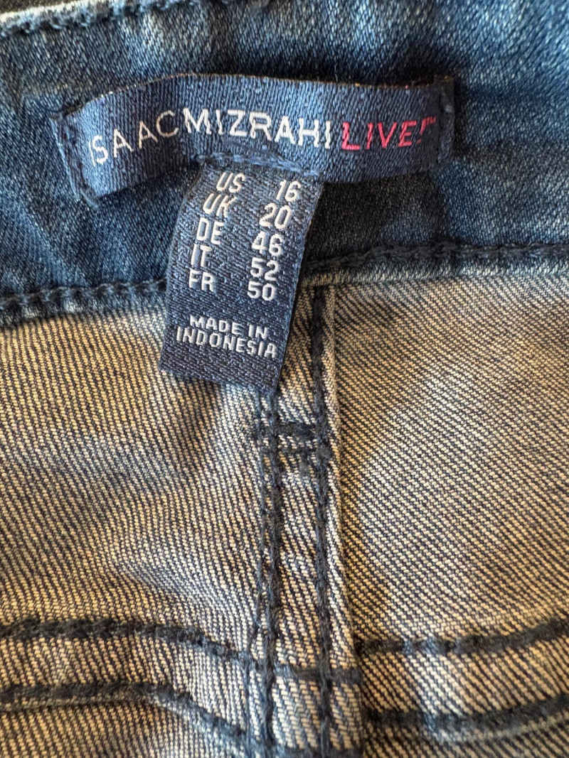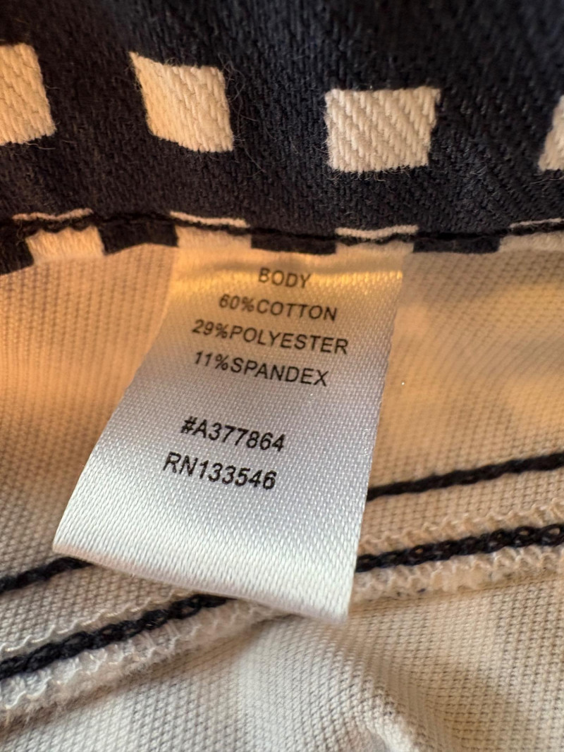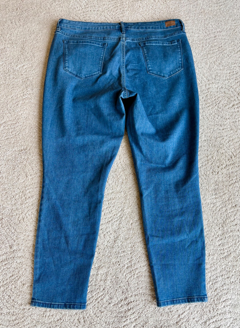 4 pairs of pants in silk & stretch for comfort. All measure 18.5" side to side at waist. Belle red stretch denim pull-up cropped pants have classic 5-pocket jeans styling (faux fly). Cotton/spandex blend. Size tag says 16. Mizrahi stretch denim classic 5-pocket jeans with a bit of spandex for comfort. Cotton/polyester/viscose/elastane blend Size tag says 16. Eileen Fisher green silk pants have elasticated waist with drawstring and set-in front pockets. 100% silk. Size tag says L. Note that these look terribly wrinkly in photos from storage, but a quick shot of steam transforms them. Legacy navy & white check faux jeans/jeggings in a twill texture stretch fabric. Cotton/polyester/spandex blend. Size tag says L.