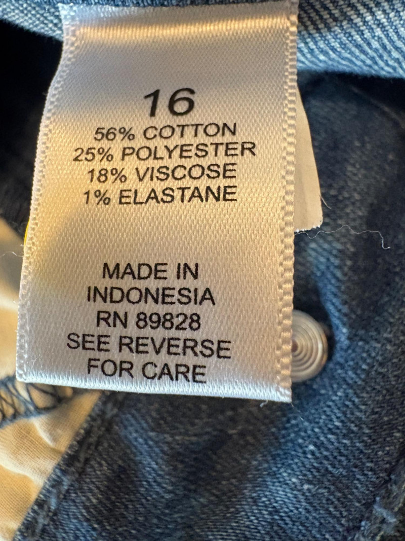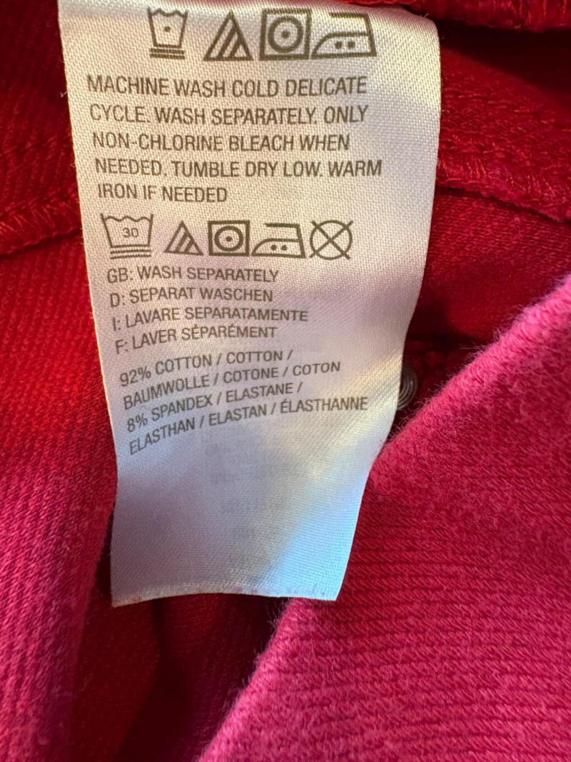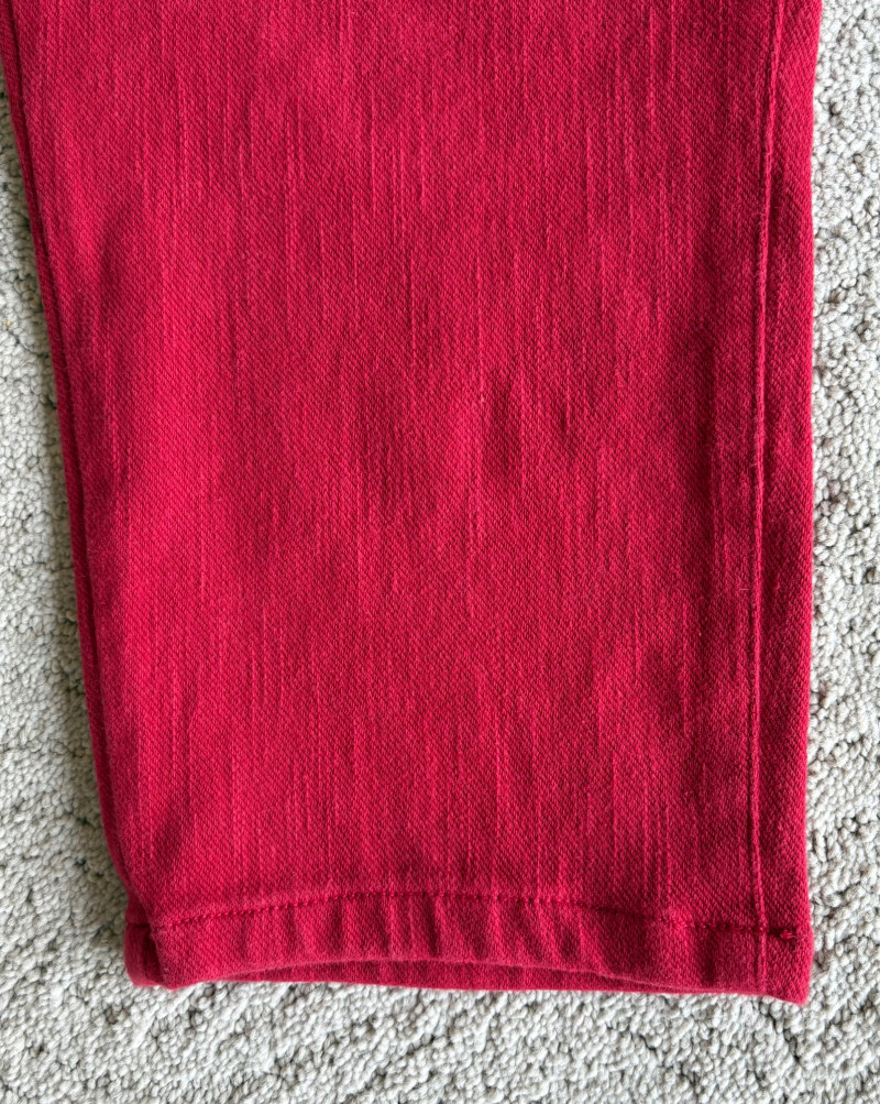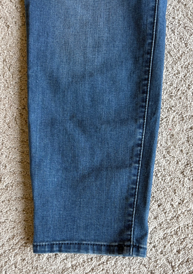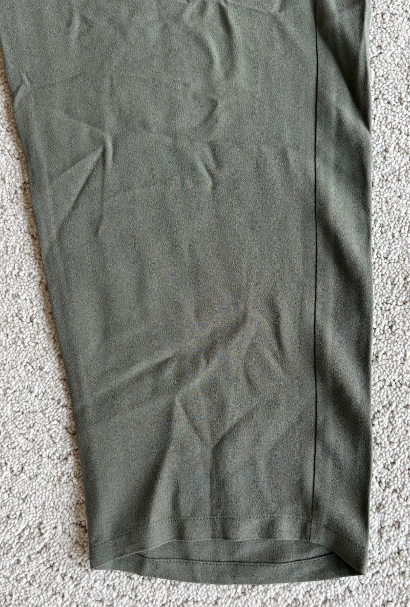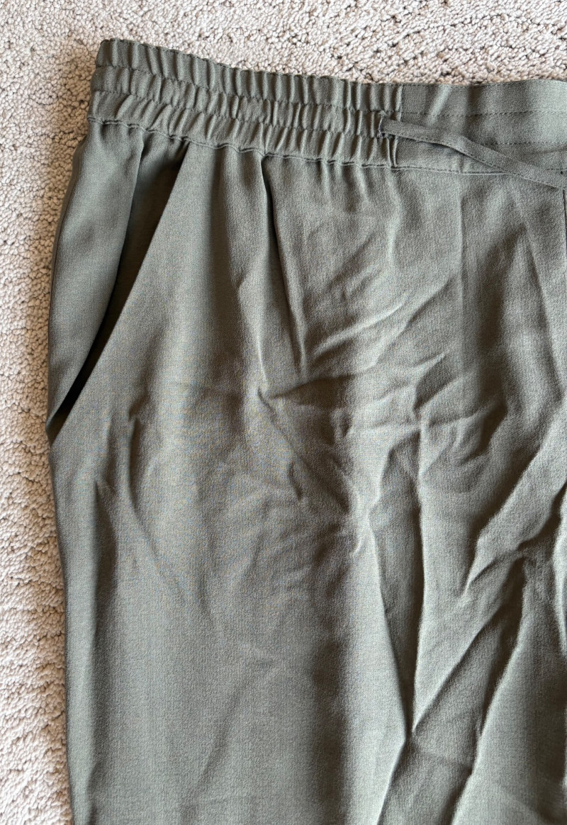 4 pairs of pants in silk & stretch for comfort. All measure 18.5" side to side at waist. Belle red stretch denim pull-up cropped pants have classic 5-pocket jeans styling (faux fly). Cotton/spandex blend. Size tag says 16. Mizrahi stretch denim classic 5-pocket jeans with a bit of spandex for comfort. Cotton/polyester/viscose/elastane blend Size tag says 16. Eileen Fisher green silk pants have elasticated waist with drawstring and set-in front pockets. 100% silk. Size tag says L. Note that these look terribly wrinkly in photos from storage, but a quick shot of steam transforms them. Legacy navy & white check faux jeans/jeggings in a twill texture stretch fabric. Cotton/polyester/spandex blend. Size tag says L.