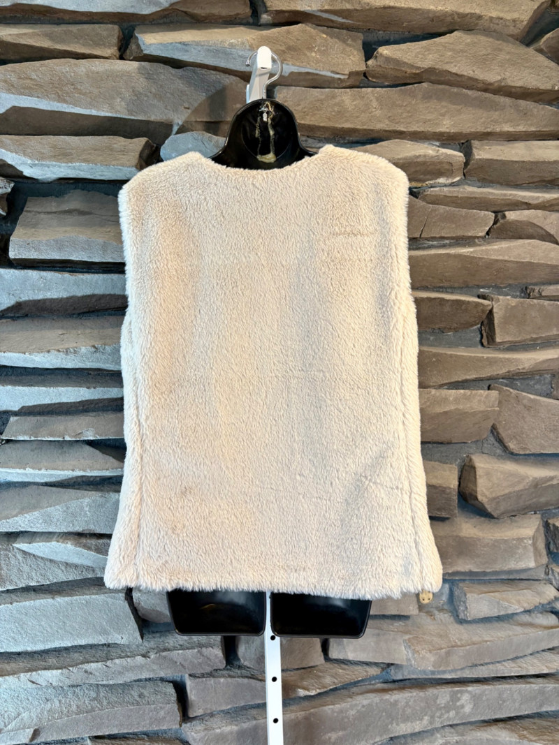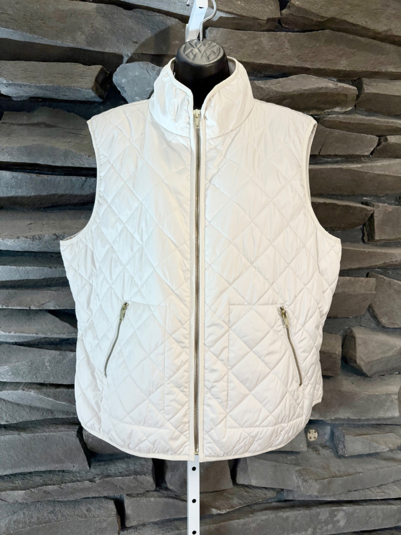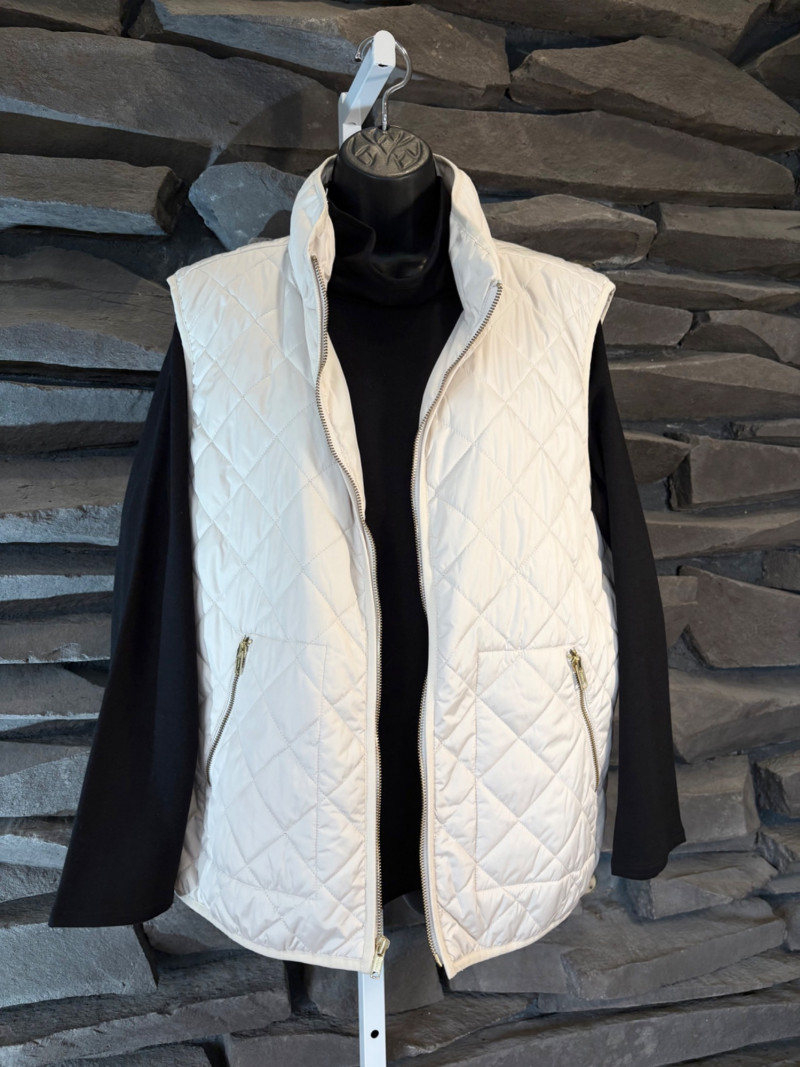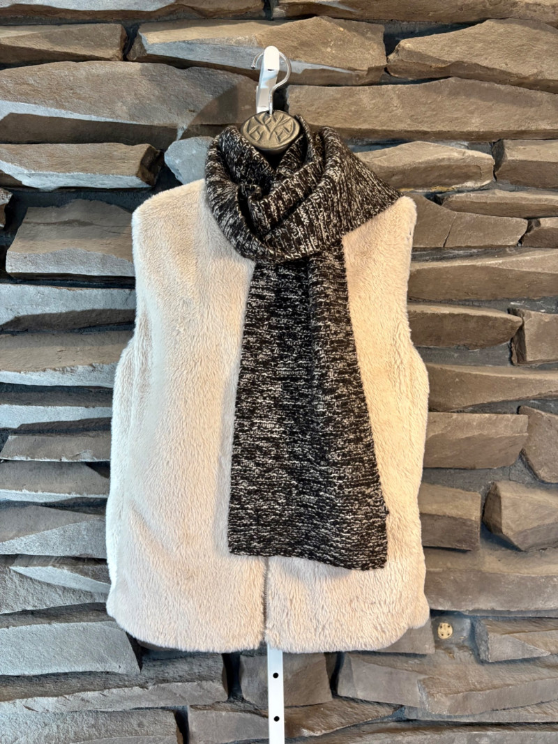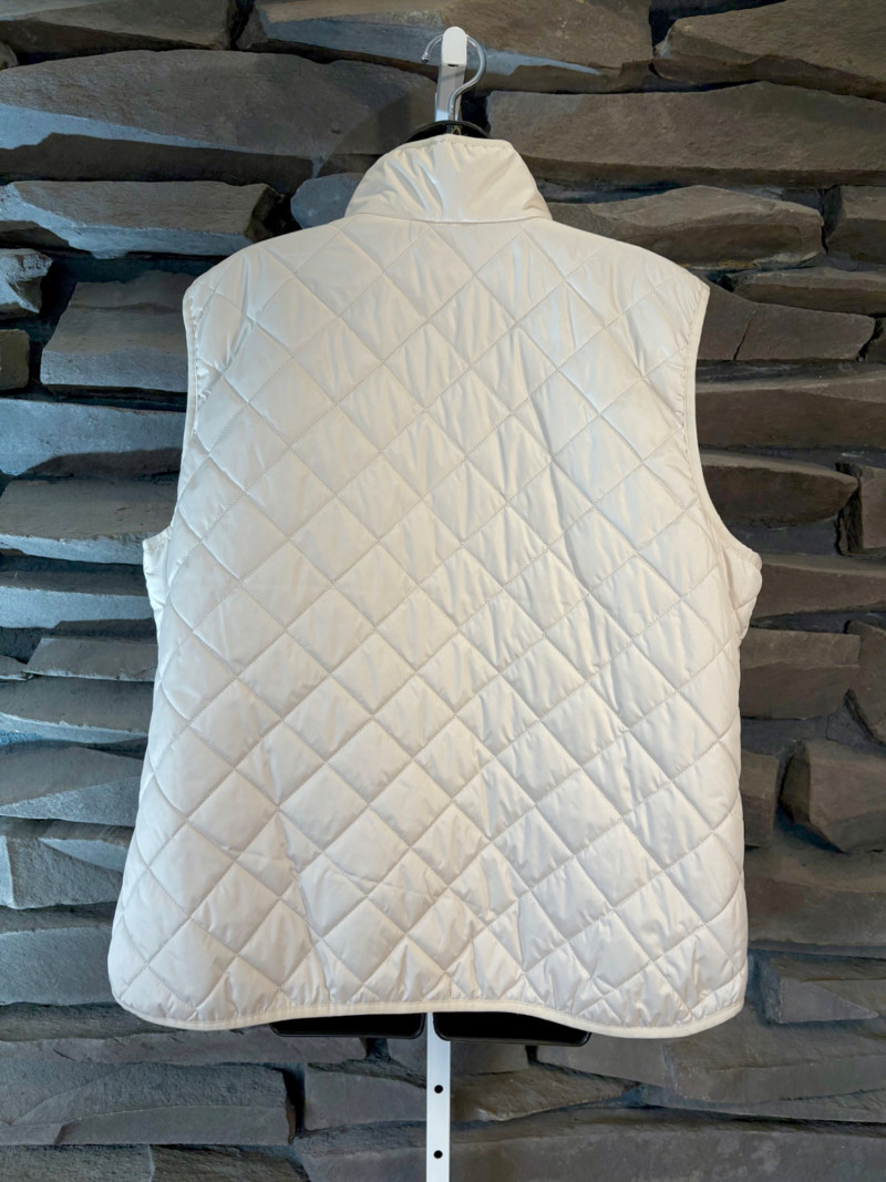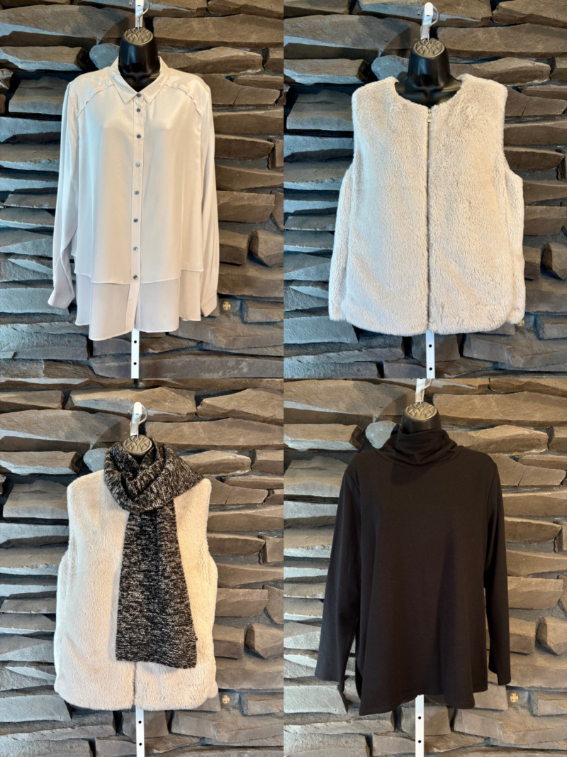 Group of great separates to mix and match in black and cream. Creamy smooth vest from Old Navy has diamond-shaped quilting, zip front closure, gold hardware, and front zip close pockets. 100% polyester. Measures 25.5" pit to pit and 26" from back neckline to hem. Size tag says XXL. Black classic turtleneck form Eileen Fisher. Tencel Lyocell/organic cotton/elastane blend. Measures 24" pit to pit and 24.5" from back neckline to hem. Size tag says 1X. Faux fur vest from Old Navy has silver front zip closure, princess seaming with in-seam front pockets, and is fully lined. 100% polyester. Measures 24" pit to pit and 23.5" from back neckline to hem. size tag says XL. Creamy taupe silk shirt from Poetry has long sleeves with 2 button pleated cuffs, front button closure, front curved yoke, back curved yoke with pleat, and front pieced hem. 100% silk. Measures 24" pit to pit and 29" from back neckline to hem. Size tag says 18. New without all tags. Paired with black & cream heavy knit scarf from Eileen Fisher in a silk/wool blend. Measures approximately 8" x 40".
