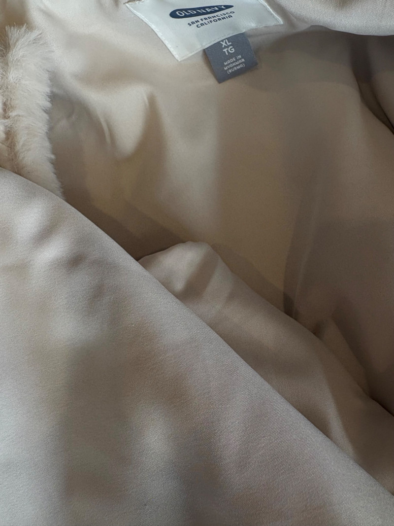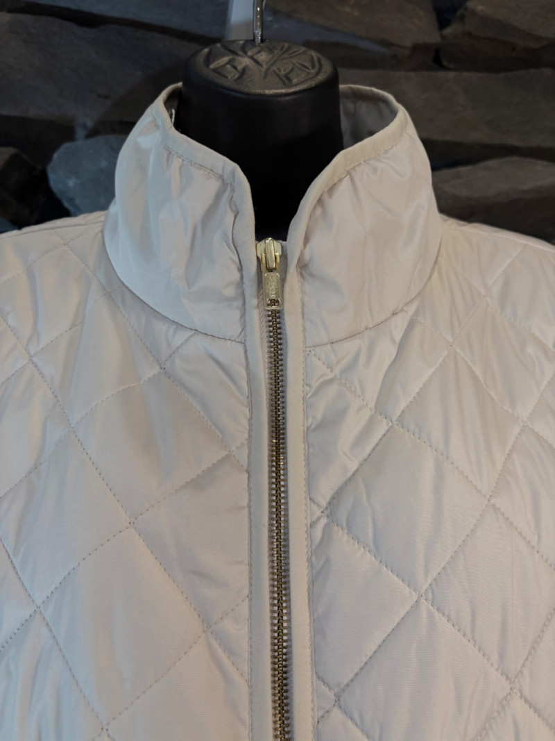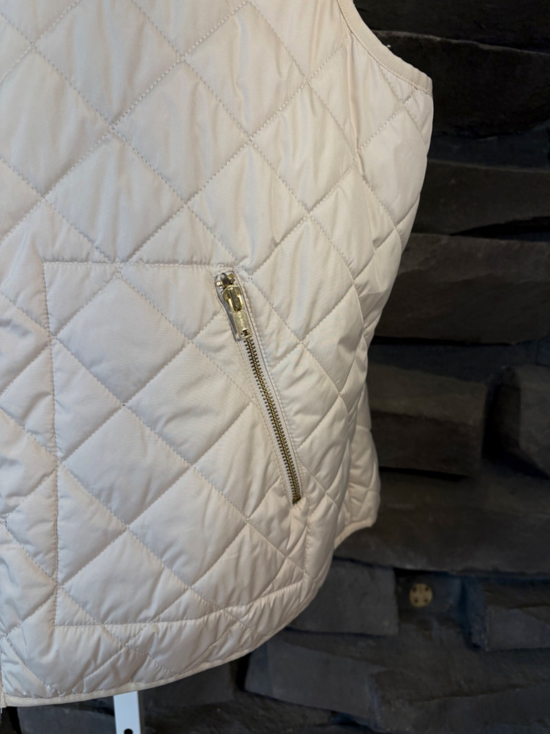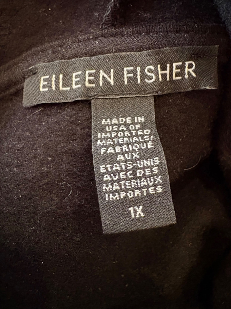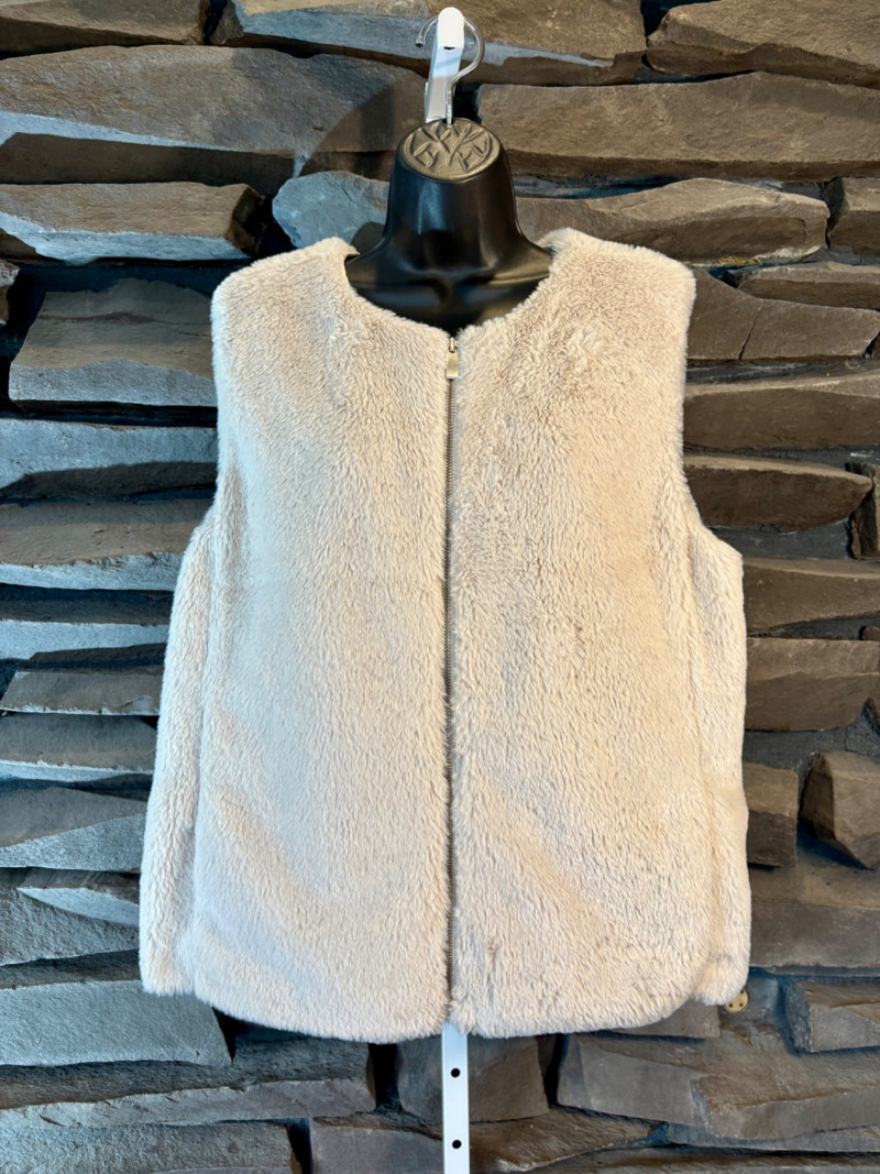 Group of great separates to mix and match in black and cream. Creamy smooth vest from Old Navy has diamond-shaped quilting, zip front closure, gold hardware, and front zip close pockets. 100% polyester. Measures 25.5" pit to pit and 26" from back neckline to hem. Size tag says XXL. Black classic turtleneck form Eileen Fisher. Tencel Lyocell/organic cotton/elastane blend. Measures 24" pit to pit and 24.5" from back neckline to hem. Size tag says 1X. Faux fur vest from Old Navy has silver front zip closure, princess seaming with in-seam front pockets, and is fully lined. 100% polyester. Measures 24" pit to pit and 23.5" from back neckline to hem. size tag says XL. Creamy taupe silk shirt from Poetry has long sleeves with 2 button pleated cuffs, front button closure, front curved yoke, back curved yoke with pleat, and front pieced hem. 100% silk. Measures 24" pit to pit and 29" from back neckline to hem. Size tag says 18. New without all tags. Paired with black & cream heavy knit scarf from Eileen Fisher in a silk/wool blend. Measures approximately 8" x 40".