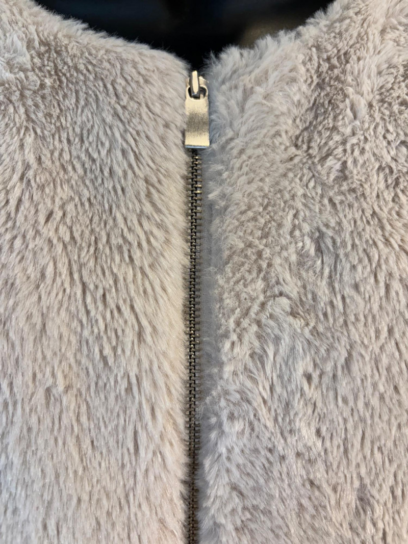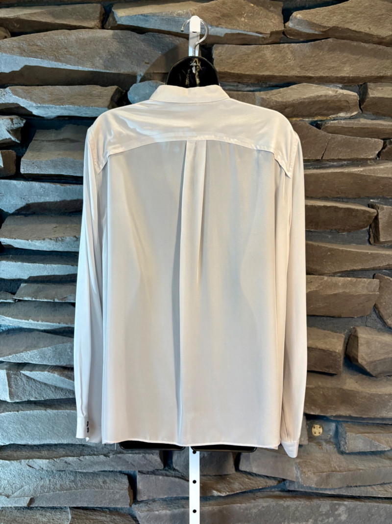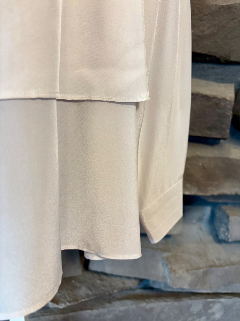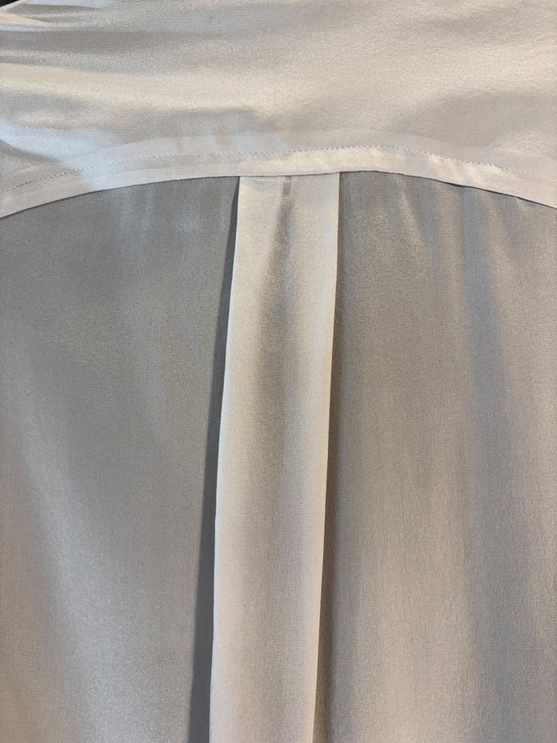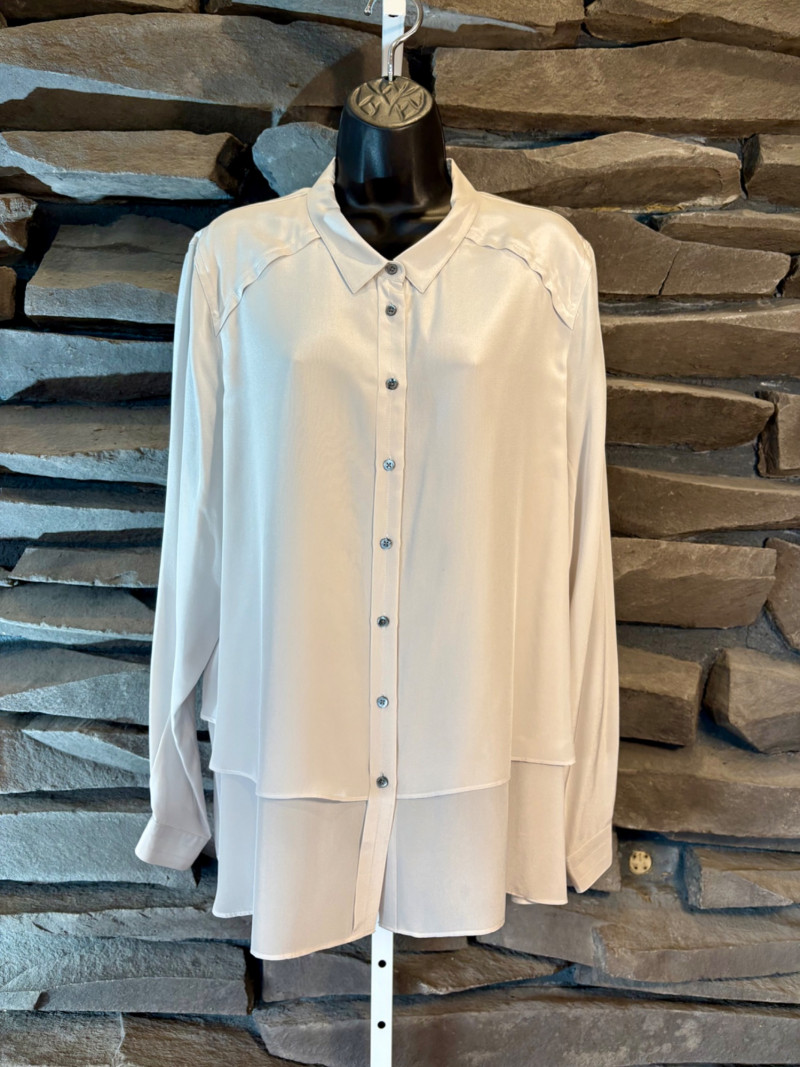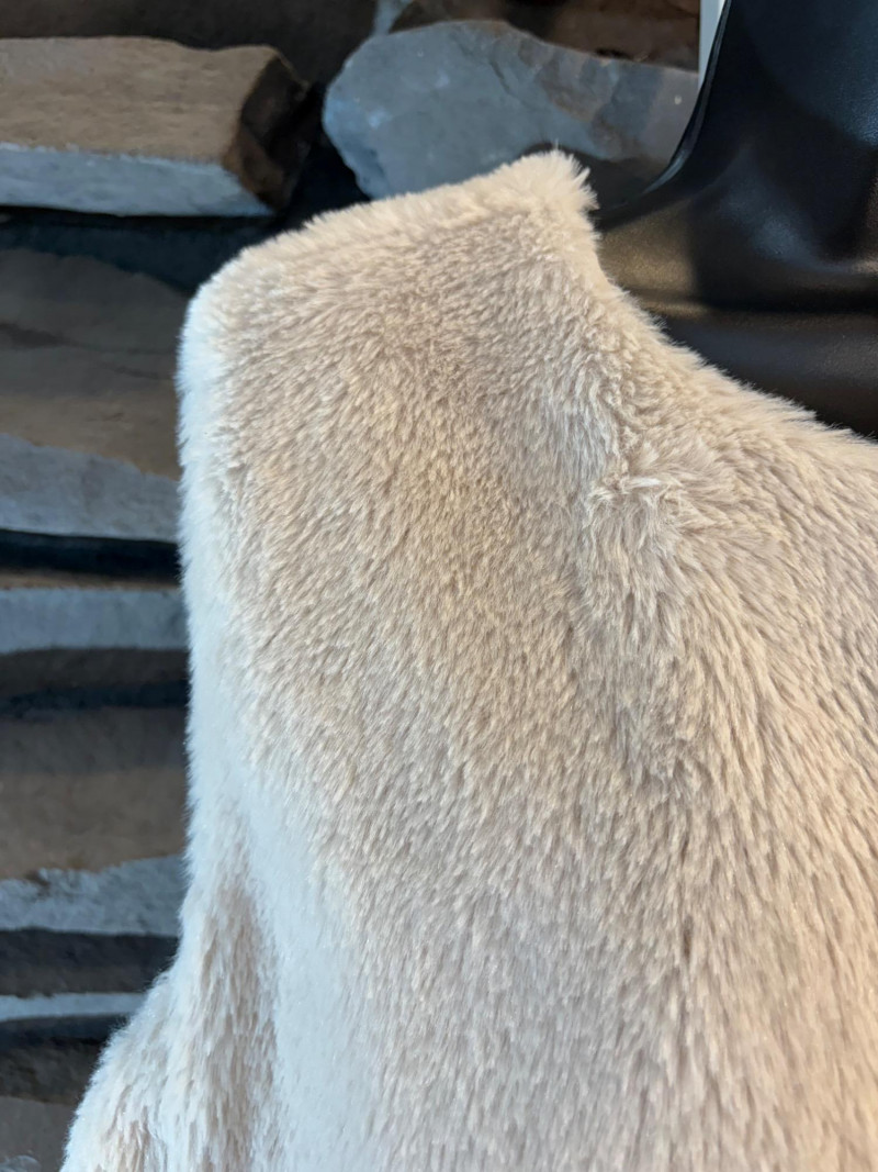 Group of great separates to mix and match in black and cream. Creamy smooth vest from Old Navy has diamond-shaped quilting, zip front closure, gold hardware, and front zip close pockets. 100% polyester. Measures 25.5" pit to pit and 26" from back neckline to hem. Size tag says XXL. Black classic turtleneck form Eileen Fisher. Tencel Lyocell/organic cotton/elastane blend. Measures 24" pit to pit and 24.5" from back neckline to hem. Size tag says 1X. Faux fur vest from Old Navy has silver front zip closure, princess seaming with in-seam front pockets, and is fully lined. 100% polyester. Measures 24" pit to pit and 23.5" from back neckline to hem. size tag says XL. Creamy taupe silk shirt from Poetry has long sleeves with 2 button pleated cuffs, front button closure, front curved yoke, back curved yoke with pleat, and front pieced hem. 100% silk. Measures 24" pit to pit and 29" from back neckline to hem. Size tag says 18. New without all tags. Paired with black & cream heavy knit scarf from Eileen Fisher in a silk/wool blend. Measures approximately 8" x 40".