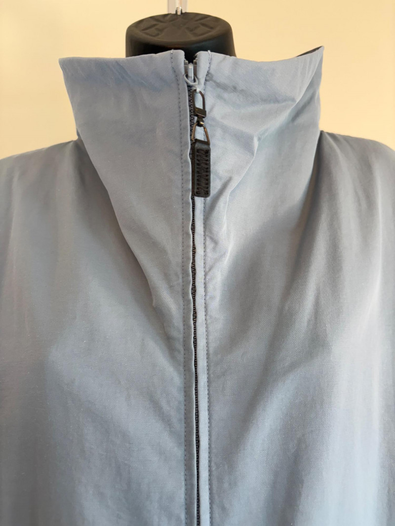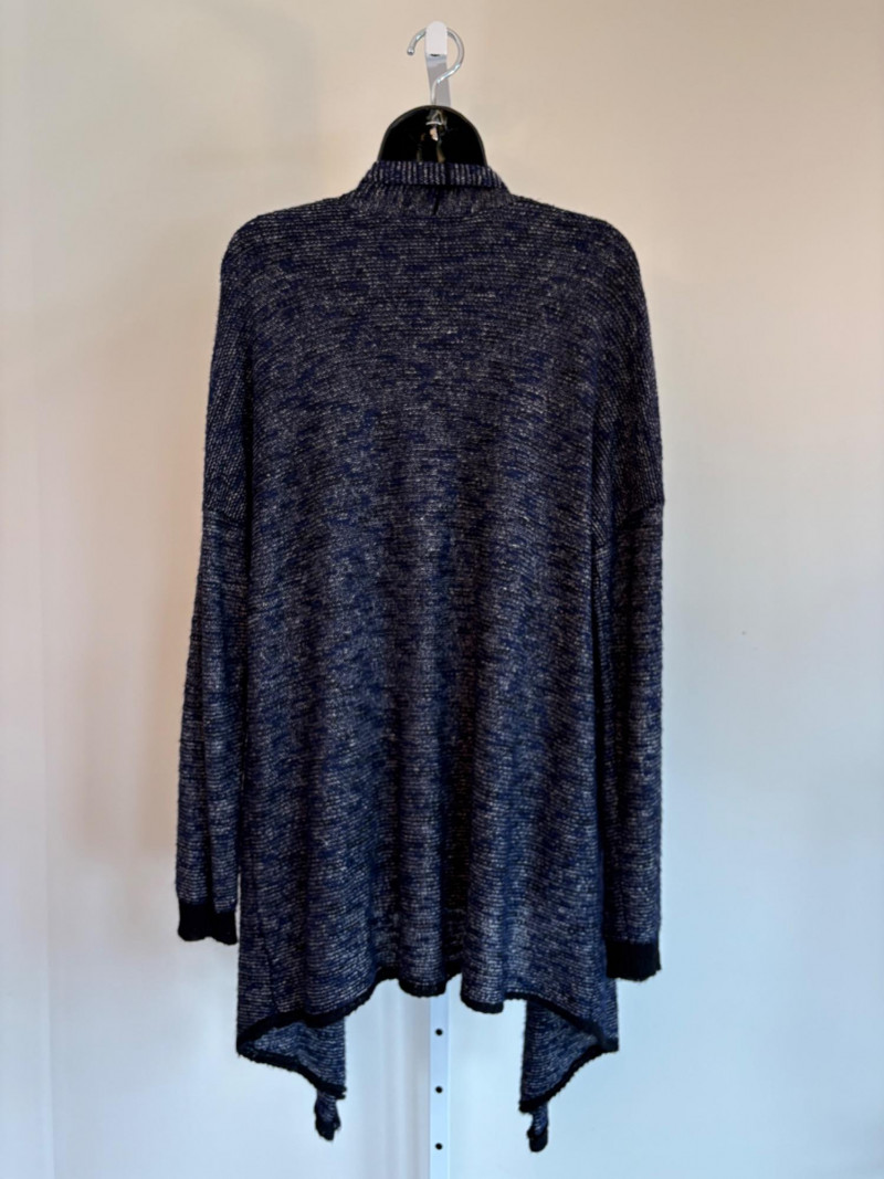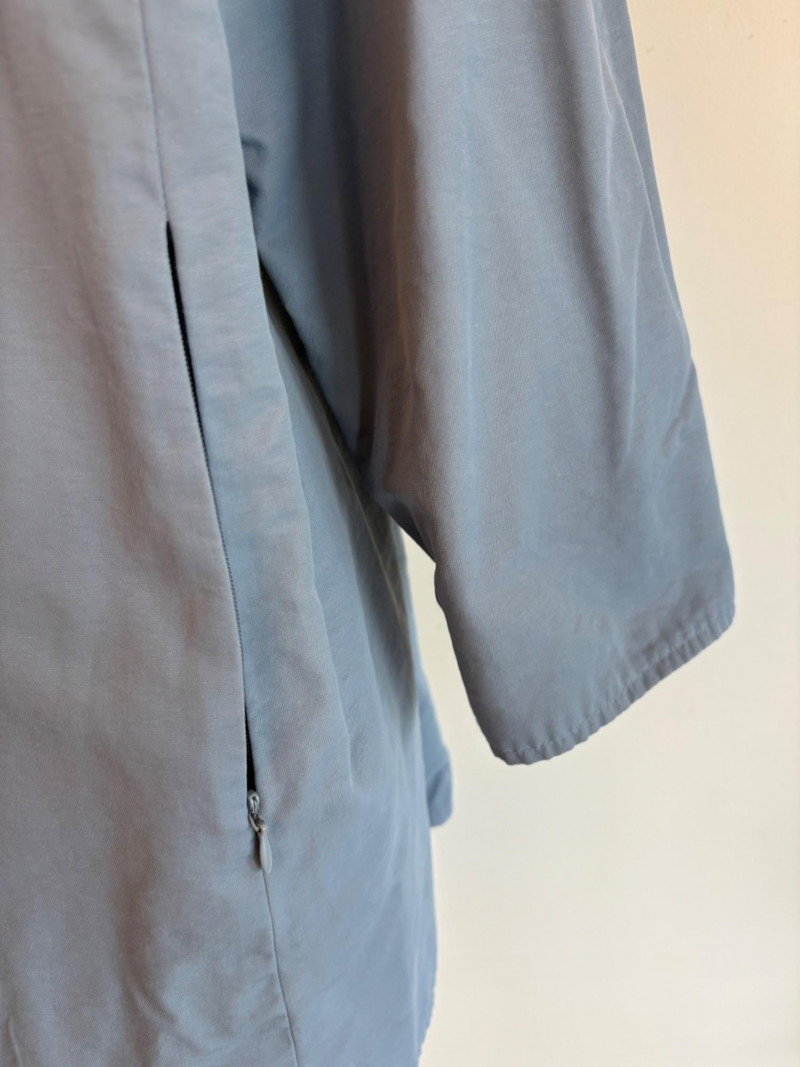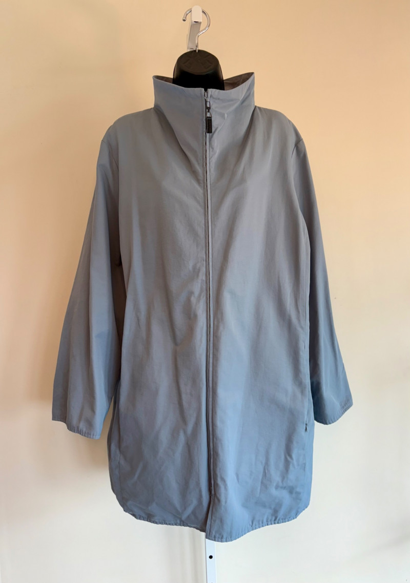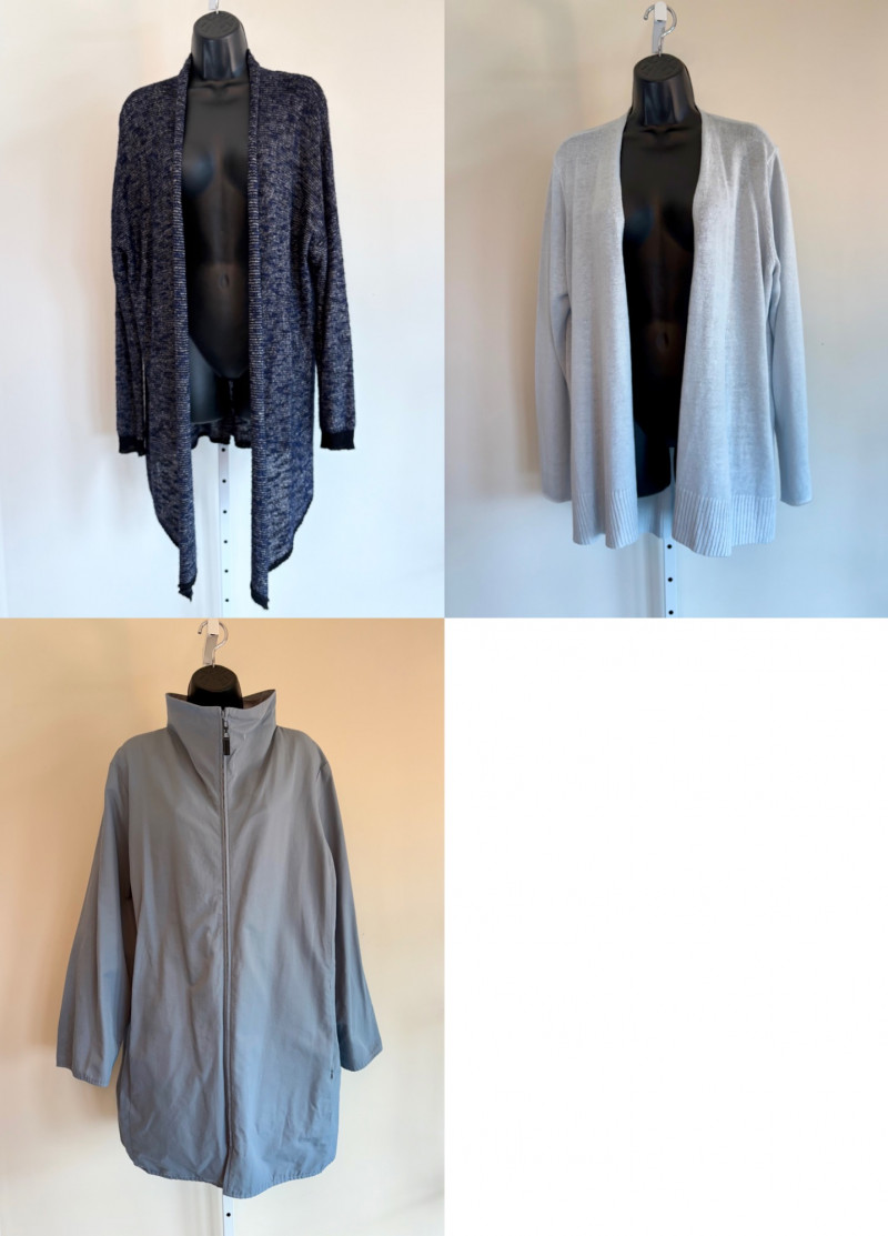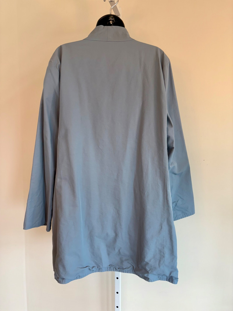 Two long cardigans and a raincoat - all in shades of blue and all measuring 24.5" - 25" pit to pit. Dark blue & white cardigan from Eileen Fisher has solid blue ribbing at cuffs and hem, open front, and pointed front hems. Linen/viscose/nylon blend. Measures 29" from back neckline to back hem. Size tag says XL. In good shape, but would benefit from a sweater shave date. Pale blue cardigan from Eileen Fisher has open front and ribbed cuffs/hem. 100% organic linen. Measures 32" from back neckline to hem. Size tag says XL. Blue raincoat has front zip closure with high collar, princess seaming with in-seam zip-close front pockets - very minimalist clean lines. Cotton/nylon blend. Measures 33" from back neckline to hem. No maker tag - see collar photo where tag obviously was.