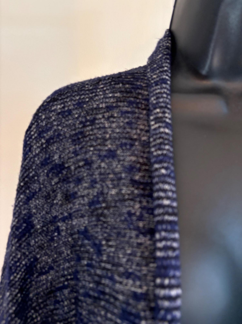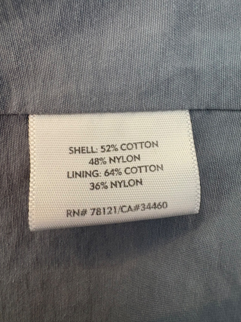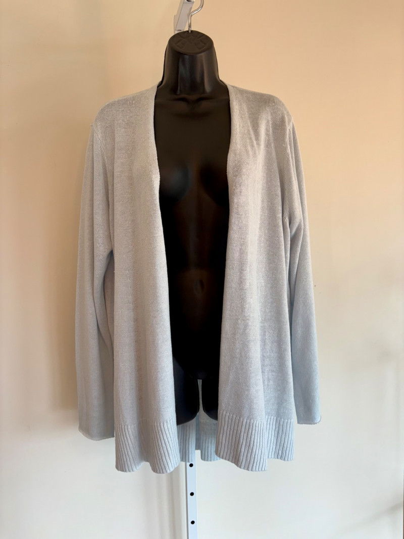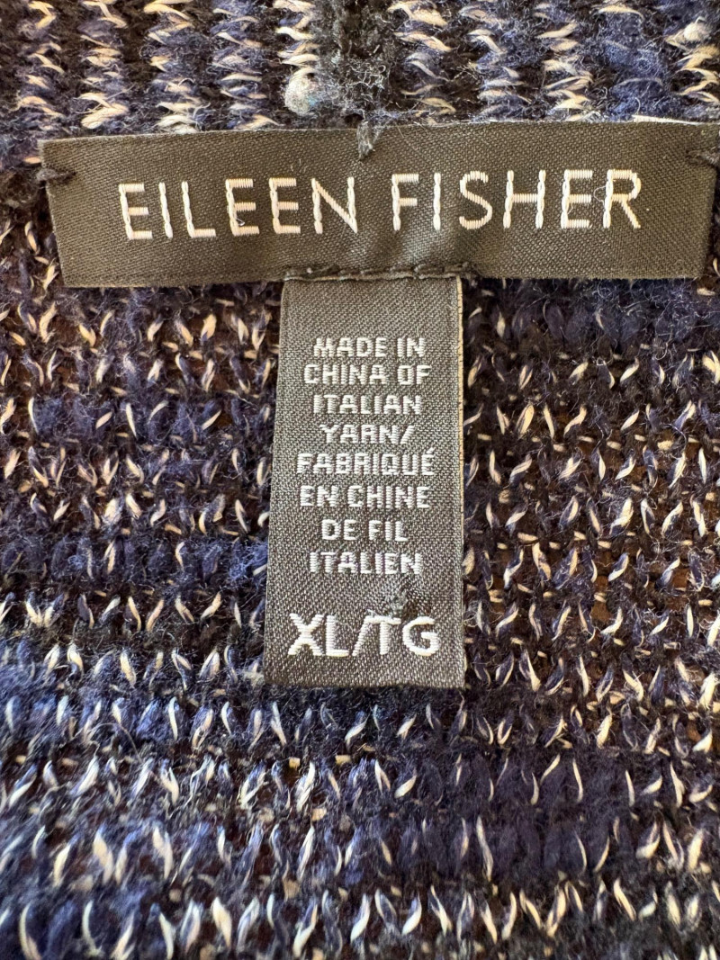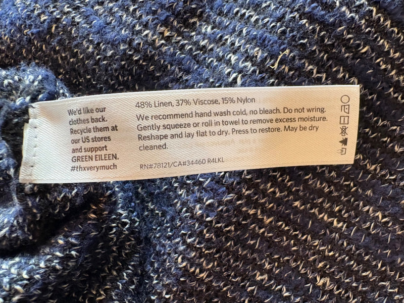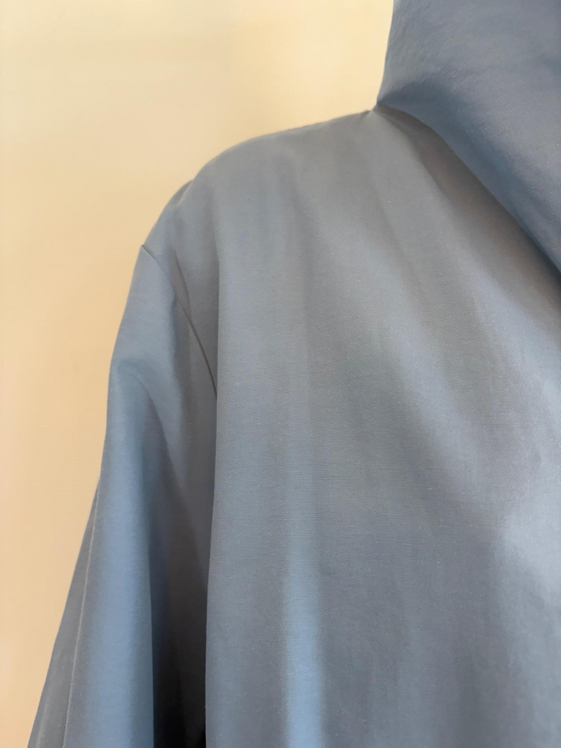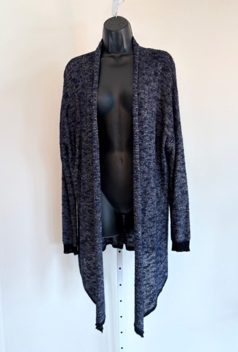 Two long cardigans and a raincoat - all in shades of blue and all measuring 24.5" - 25" pit to pit. Dark blue & white cardigan from Eileen Fisher has solid blue ribbing at cuffs and hem, open front, and pointed front hems. Linen/viscose/nylon blend. Measures 29" from back neckline to back hem. Size tag says XL. In good shape, but would benefit from a sweater shave date. Pale blue cardigan from Eileen Fisher has open front and ribbed cuffs/hem. 100% organic linen. Measures 32" from back neckline to hem. Size tag says XL. Blue raincoat has front zip closure with high collar, princess seaming with in-seam zip-close front pockets - very minimalist clean lines. Cotton/nylon blend. Measures 33" from back neckline to hem. No maker tag - see collar photo where tag obviously was.