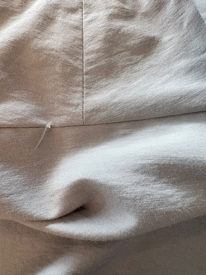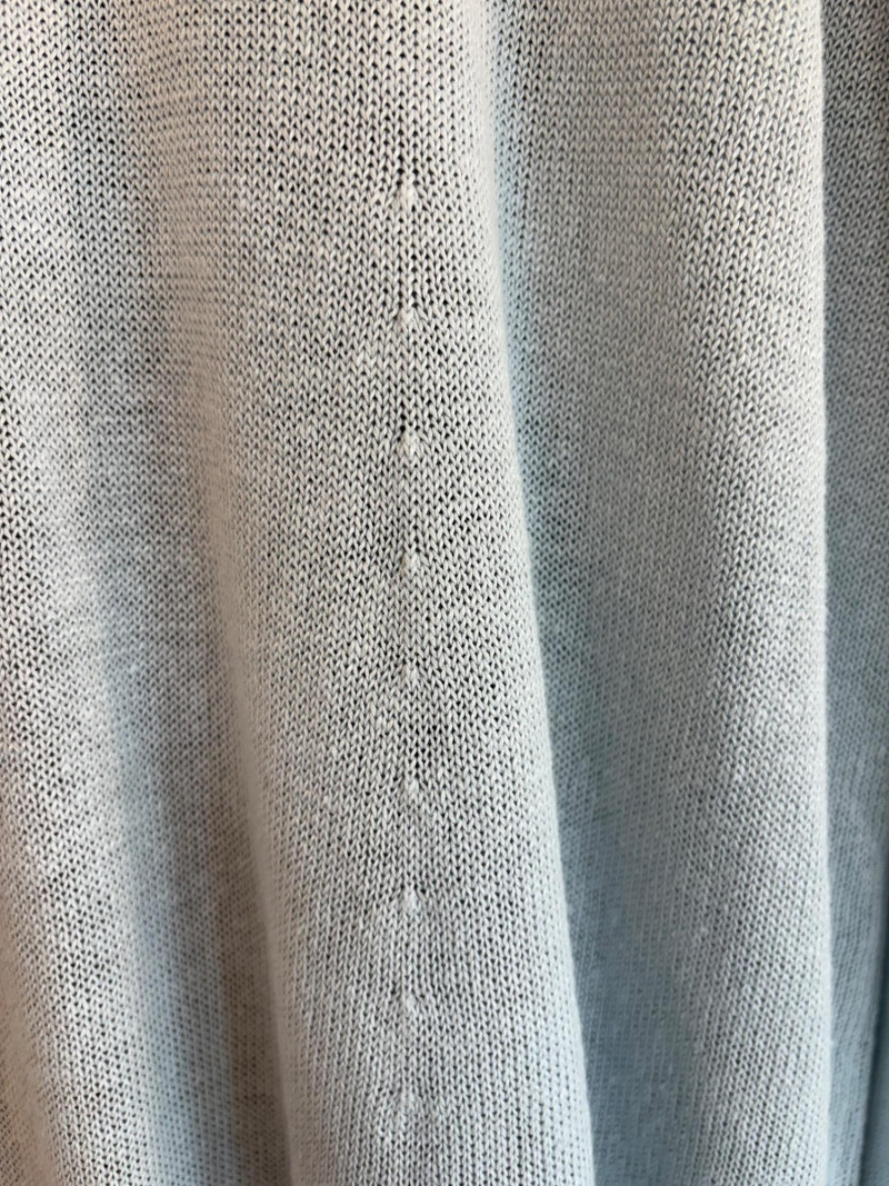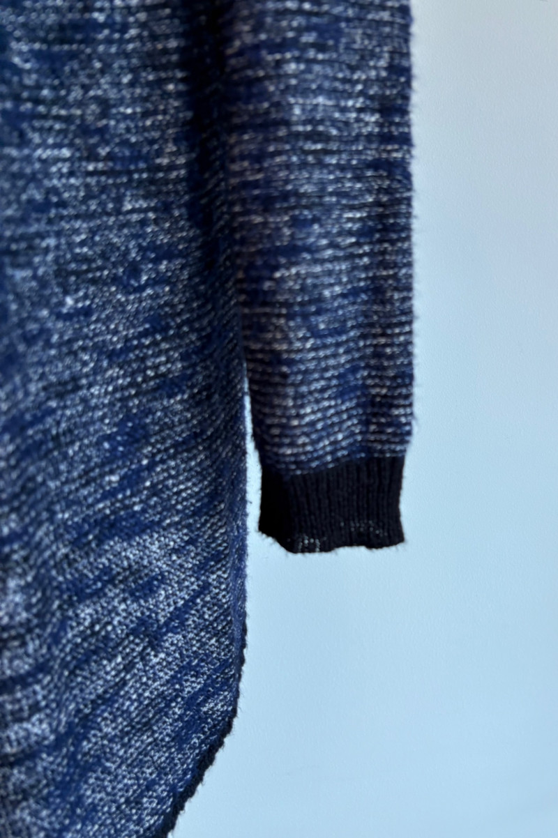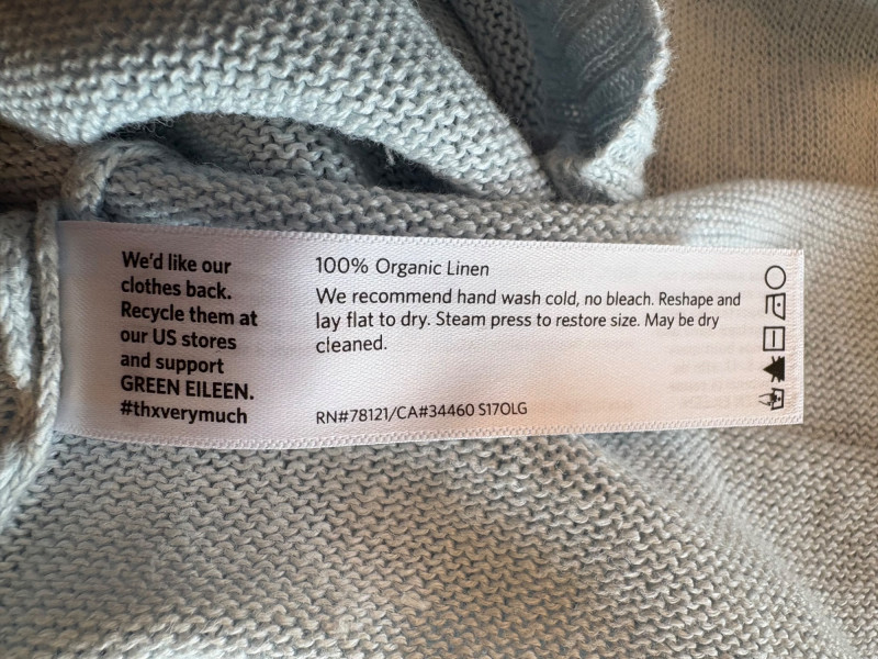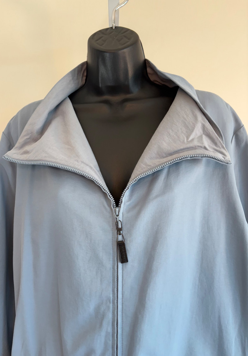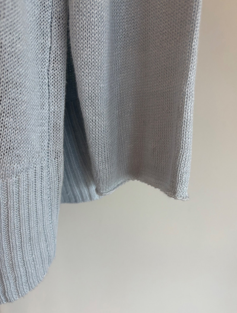 Two long cardigans and a raincoat - all in shades of blue and all measuring 24.5" - 25" pit to pit. Dark blue & white cardigan from Eileen Fisher has solid blue ribbing at cuffs and hem, open front, and pointed front hems. Linen/viscose/nylon blend. Measures 29" from back neckline to back hem. Size tag says XL. In good shape, but would benefit from a sweater shave date. Pale blue cardigan from Eileen Fisher has open front and ribbed cuffs/hem. 100% organic linen. Measures 32" from back neckline to hem. Size tag says XL. Blue raincoat has front zip closure with high collar, princess seaming with in-seam zip-close front pockets - very minimalist clean lines. Cotton/nylon blend. Measures 33" from back neckline to hem. No maker tag - see collar photo where tag obviously was.