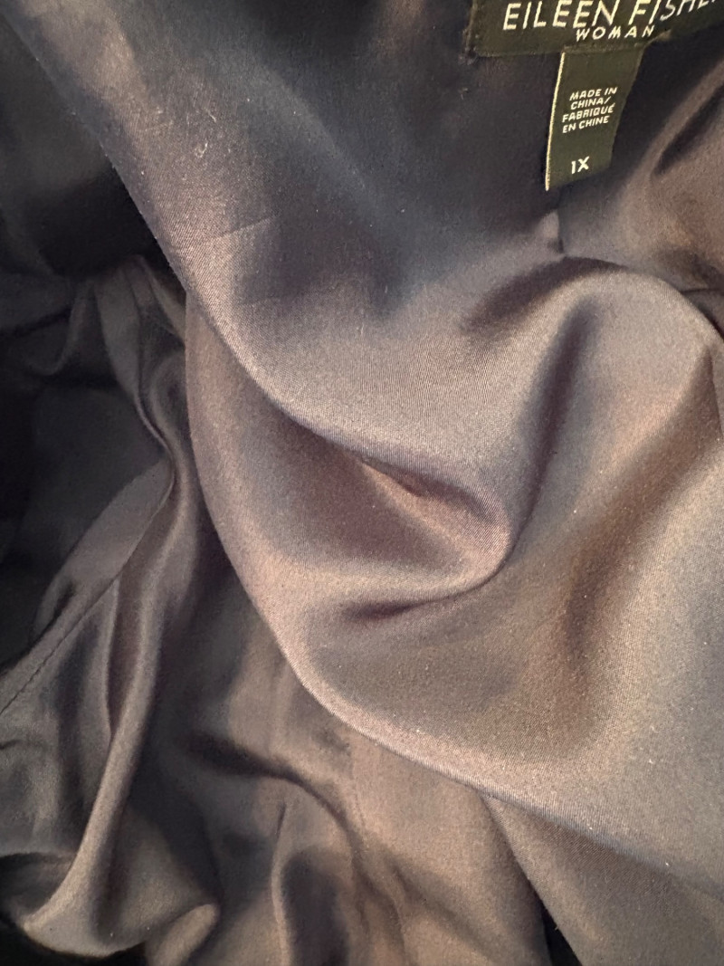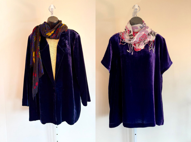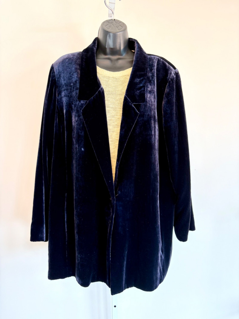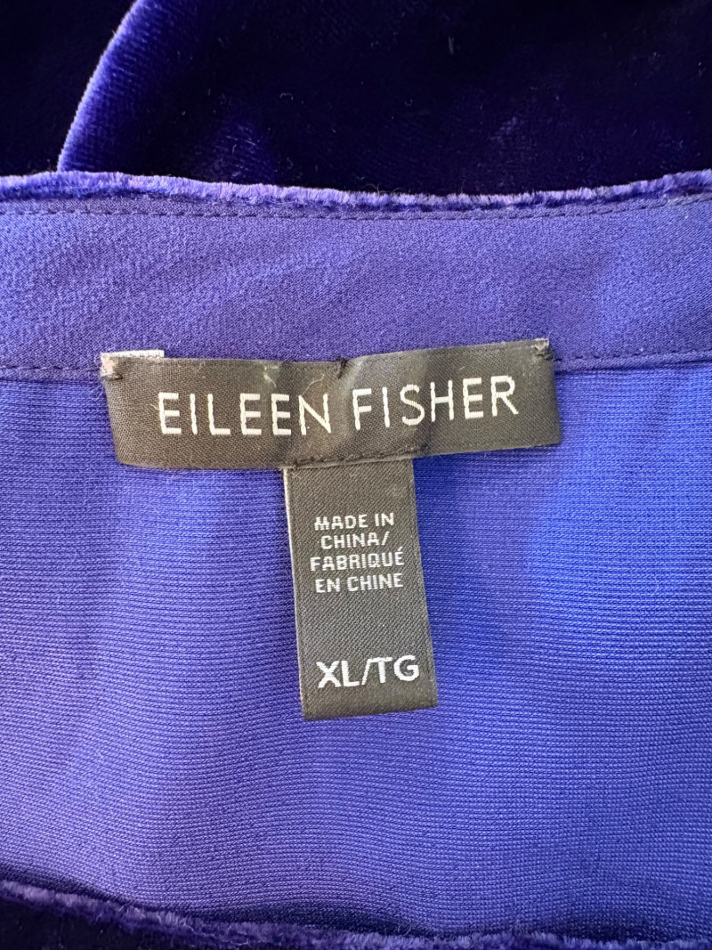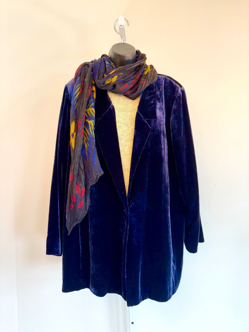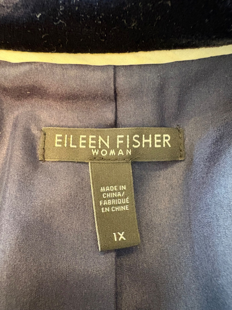 3 terrific separates from Eileen Fisher plus scarves. Navy blue velvet blazer from Eileen Fisher is fully lined and has notched collar with single button front closure. Great drape to rayon/silk blend fabric. Measures 25" pit to pit and 24" from back neckline to hem. Size tag says 1X. Pale yellow open weave sweater from Eileen Fisher has long sleeves, high round neckline, and narrow ribbing at sleeve cuffs and bottom hem. New with tag. Organic linen/organic cotton blend. Measures 23.5" pit to pit and 24" from back neckline to hem. Size tag says XL. Note that there seems to be a very small dot of something on the sweater front - we think it should come out with laundering - see last photo.. Purple velvet top from Eileen Fisher has curved neckline, short sleeves, and curved split hem longer in back than front. Rayon/silk blend. Measures 24.5" pit to pit. Size tag says XL. Paired with 2 scarves: - Multi-colored on black measures approximately 20" x 72". No maker or fabric tag - feels like cotton. - Floral print on white scarf measures approximately 22" x 40". 100% viscose. No maker tag.
