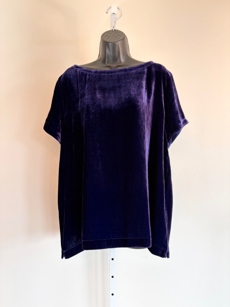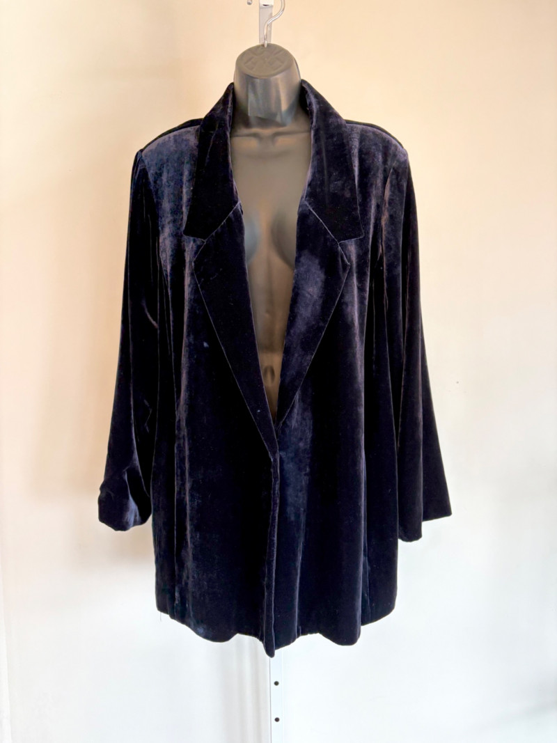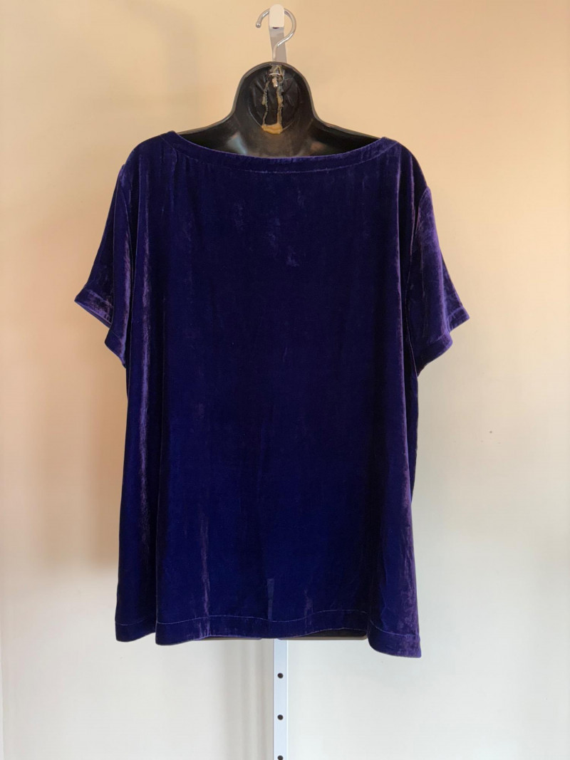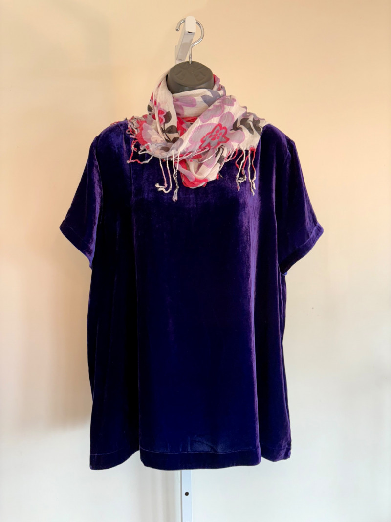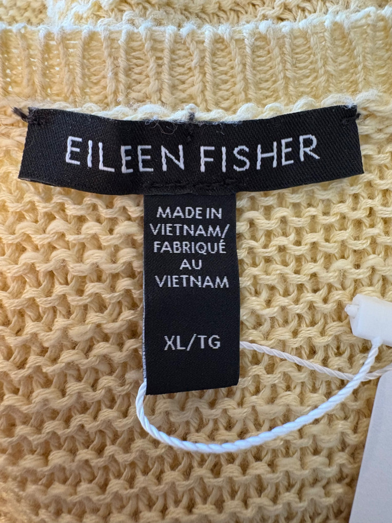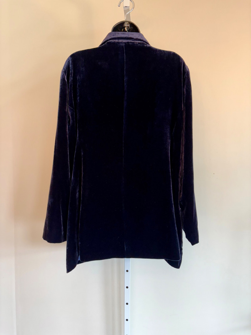3 terrific separates from Eileen Fisher plus scarves. Navy blue velvet blazer from Eileen Fisher is fully lined and has notched collar with single button front closure. Great drape to rayon/silk blend fabric. Measures 25" pit to pit and 24" from back neckline to hem. Size tag says 1X. Pale yellow open weave sweater from Eileen Fisher has long sleeves, high round neckline, and narrow ribbing at sleeve cuffs and bottom hem. New with tag. Organic linen/organic cotton blend. Measures 23.5" pit to pit and 24" from back neckline to hem. Size tag says XL. Note that there seems to be a very small dot of something on the sweater front - we think it should come out with laundering - see last photo.. Purple velvet top from Eileen Fisher has curved neckline, short sleeves, and curved split hem longer in back than front. Rayon/silk blend. Measures 24.5" pit to pit. Size tag says XL. Paired with 2 scarves: - Multi-colored on black measures approximately 20" x 72". No maker or fabric tag - feels like cotton. - Floral print on white scarf measures approximately 22" x 40". 100% viscose. No maker tag.
