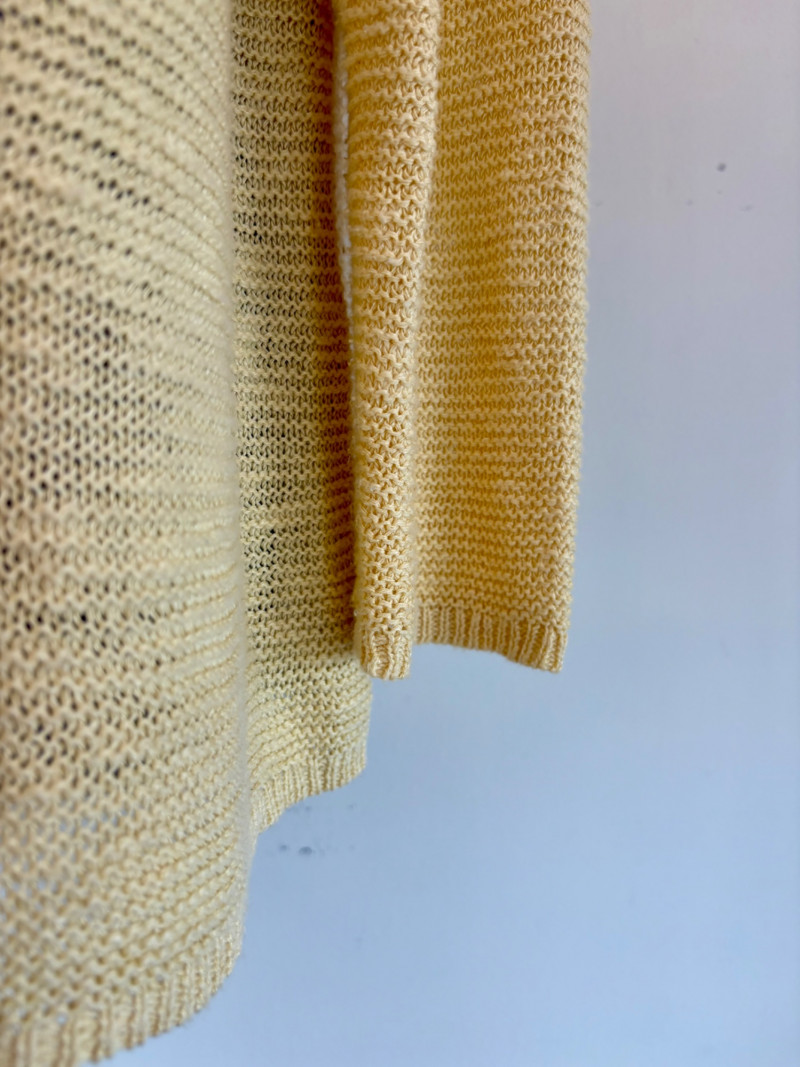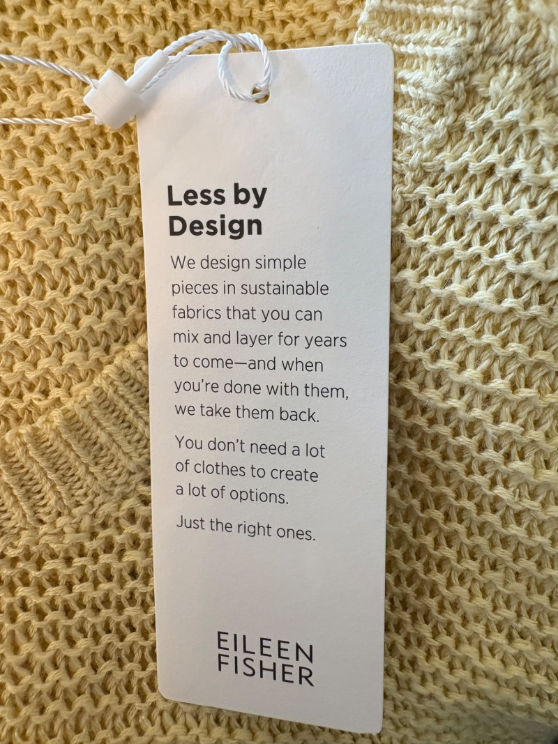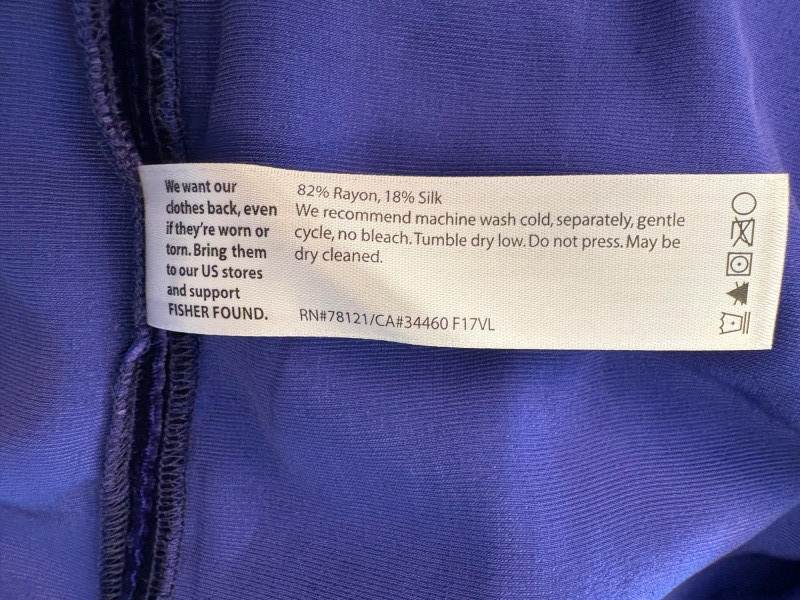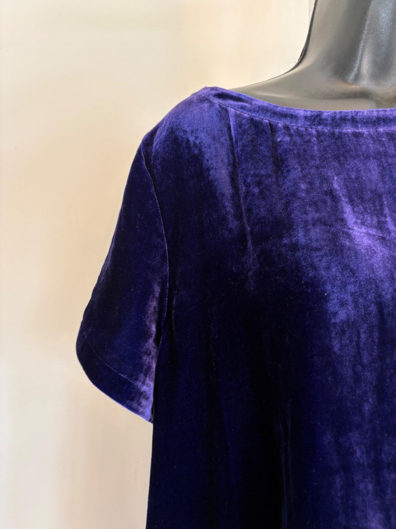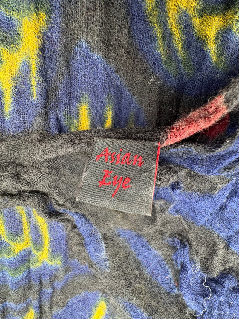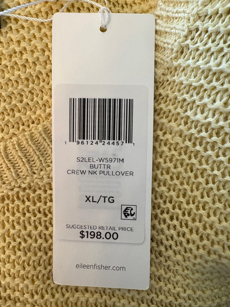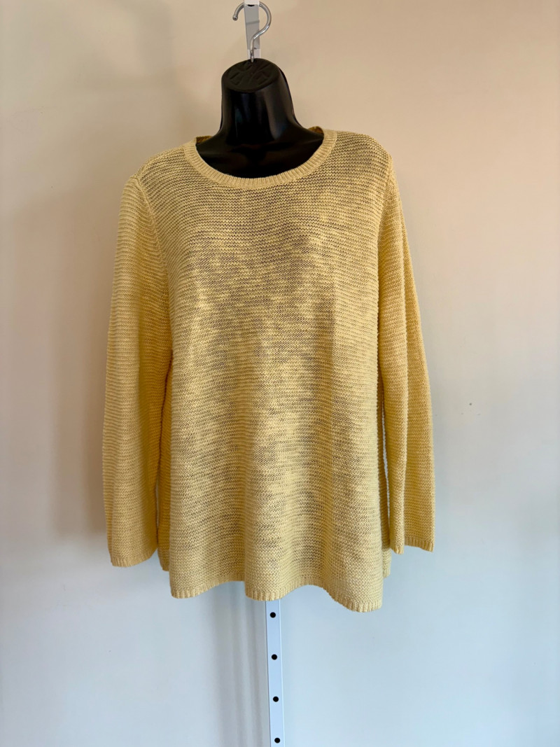 3 terrific separates from Eileen Fisher plus scarves. Navy blue velvet blazer from Eileen Fisher is fully lined and has notched collar with single button front closure. Great drape to rayon/silk blend fabric. Measures 25" pit to pit and 24" from back neckline to hem. Size tag says 1X. Pale yellow open weave sweater from Eileen Fisher has long sleeves, high round neckline, and narrow ribbing at sleeve cuffs and bottom hem. New with tag. Organic linen/organic cotton blend. Measures 23.5" pit to pit and 24" from back neckline to hem. Size tag says XL. Note that there seems to be a very small dot of something on the sweater front - we think it should come out with laundering - see last photo.. Purple velvet top from Eileen Fisher has curved neckline, short sleeves, and curved split hem longer in back than front. Rayon/silk blend. Measures 24.5" pit to pit. Size tag says XL. Paired with 2 scarves: - Multi-colored on black measures approximately 20" x 72". No maker or fabric tag - feels like cotton. - Floral print on white scarf measures approximately 22" x 40". 100% viscose. No maker tag.