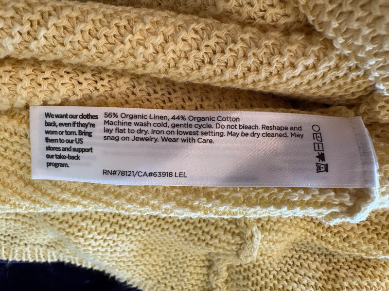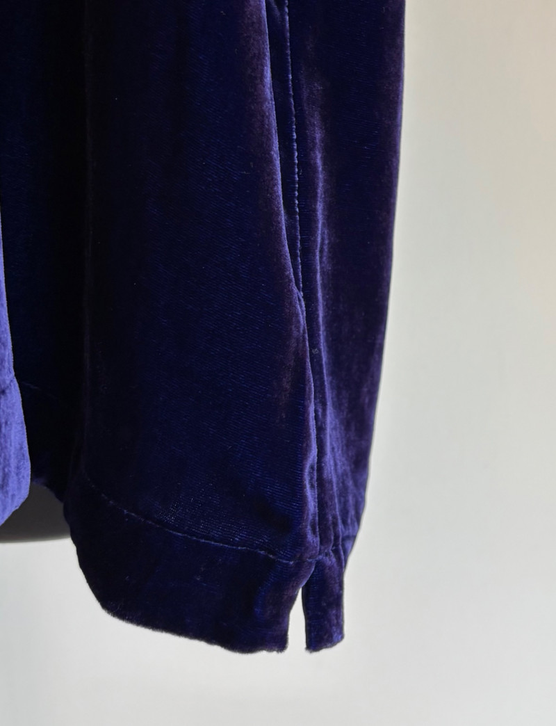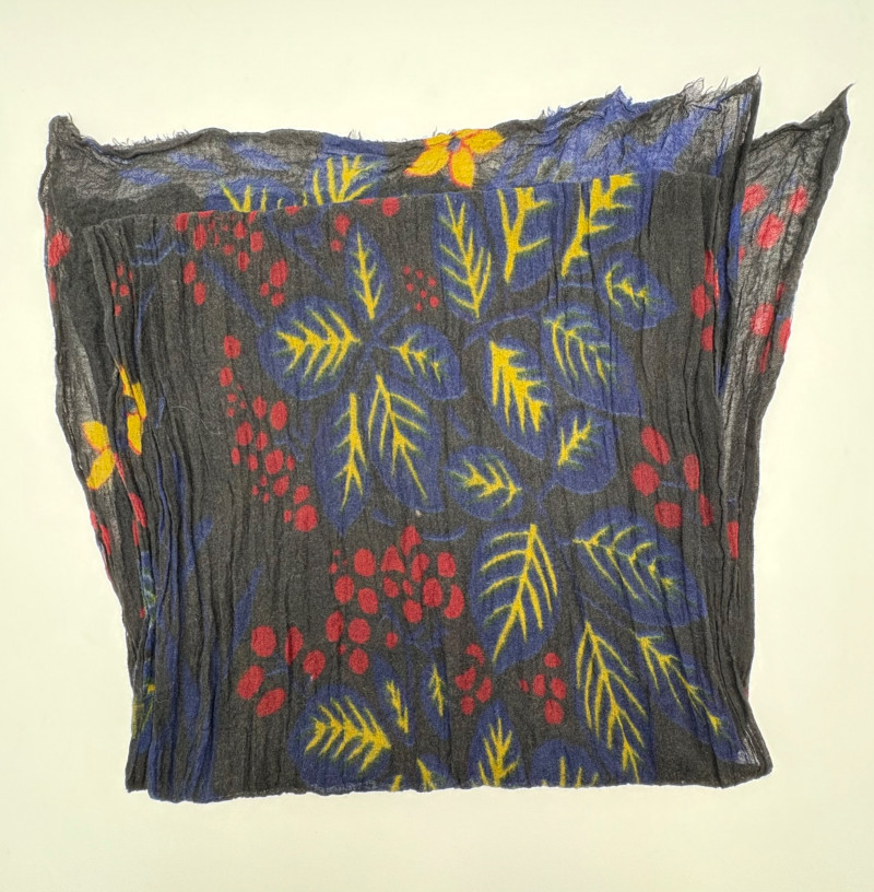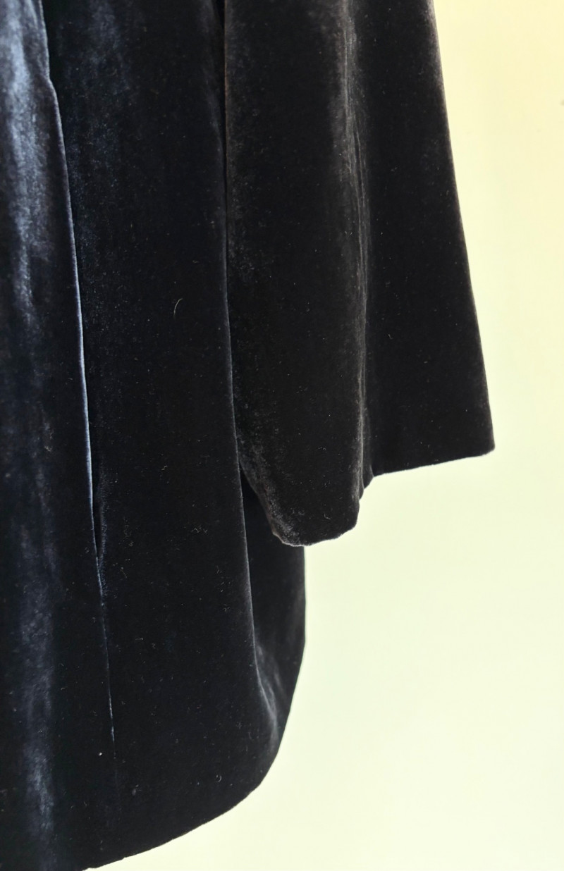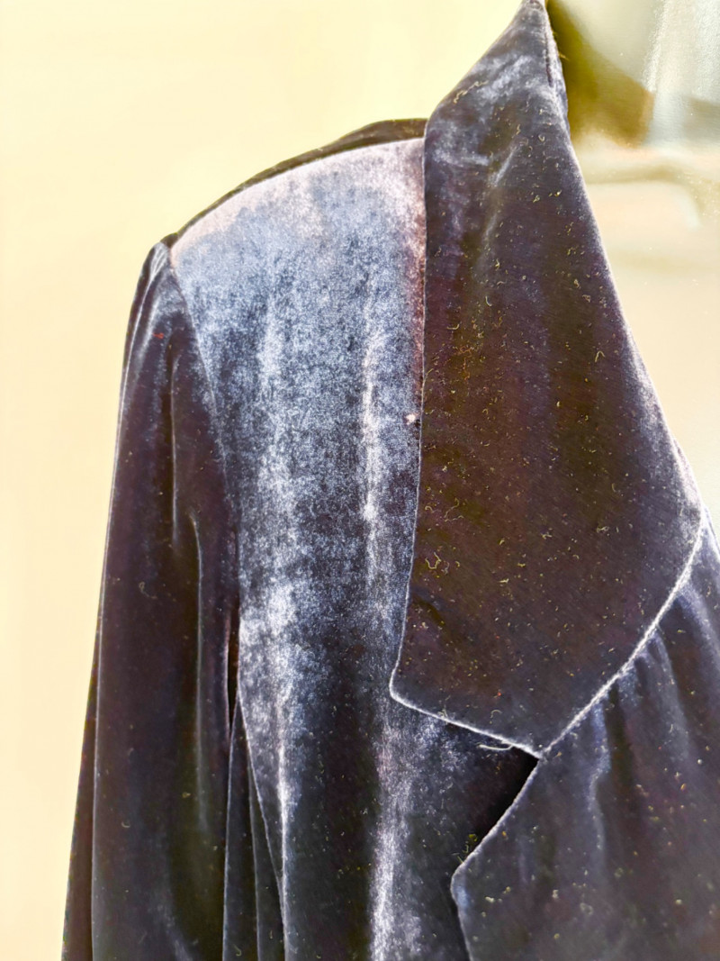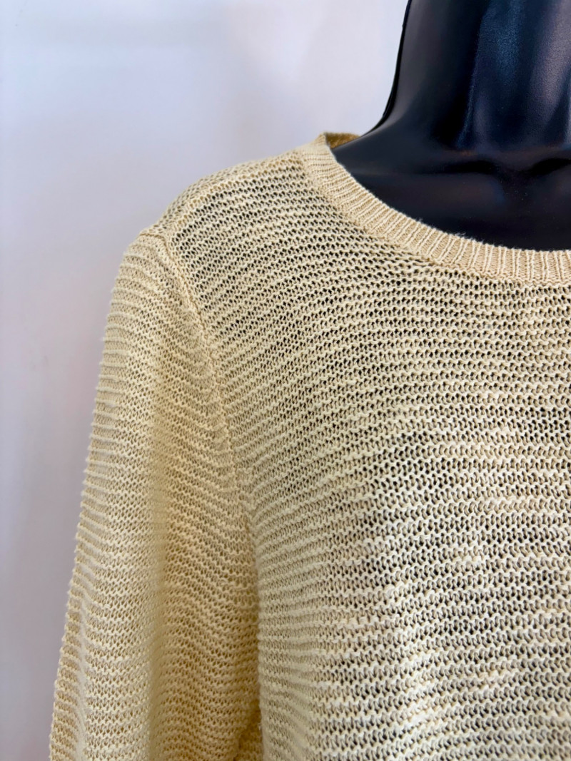 3 terrific separates from Eileen Fisher plus scarves. Navy blue velvet blazer from Eileen Fisher is fully lined and has notched collar with single button front closure. Great drape to rayon/silk blend fabric. Measures 25" pit to pit and 24" from back neckline to hem. Size tag says 1X. Pale yellow open weave sweater from Eileen Fisher has long sleeves, high round neckline, and narrow ribbing at sleeve cuffs and bottom hem. New with tag. Organic linen/organic cotton blend. Measures 23.5" pit to pit and 24" from back neckline to hem. Size tag says XL. Note that there seems to be a very small dot of something on the sweater front - we think it should come out with laundering - see last photo.. Purple velvet top from Eileen Fisher has curved neckline, short sleeves, and curved split hem longer in back than front. Rayon/silk blend. Measures 24.5" pit to pit. Size tag says XL. Paired with 2 scarves: - Multi-colored on black measures approximately 20" x 72". No maker or fabric tag - feels like cotton. - Floral print on white scarf measures approximately 22" x 40". 100% viscose. No maker tag.