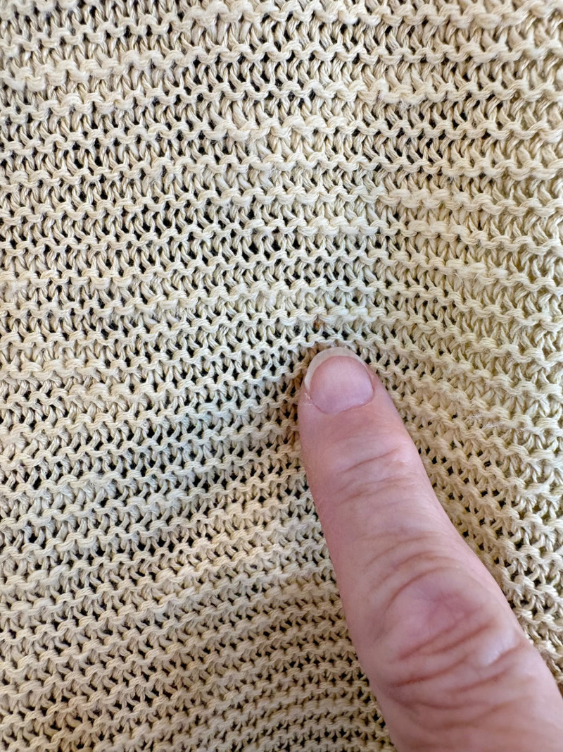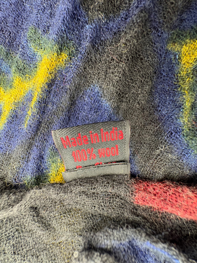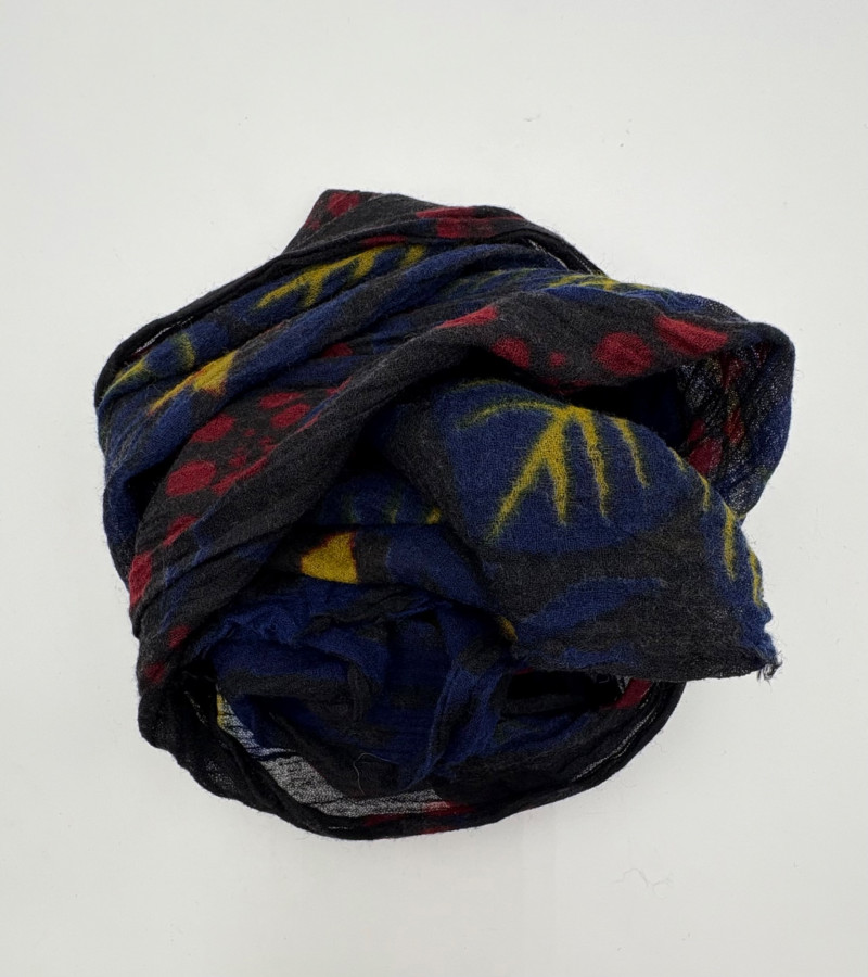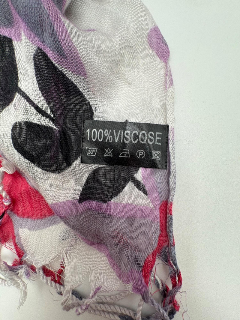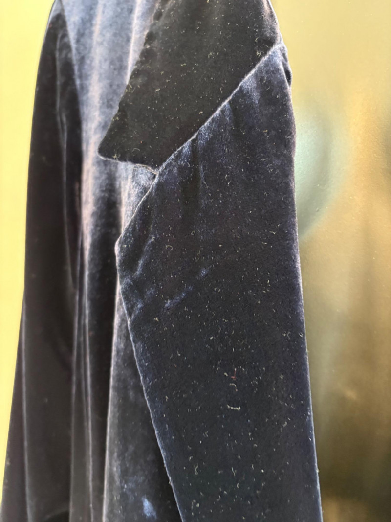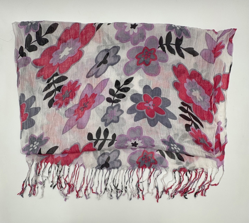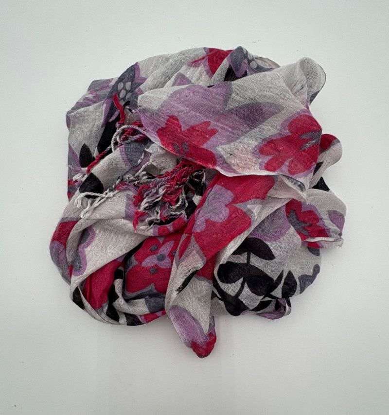 3 terrific separates from Eileen Fisher plus scarves. Navy blue velvet blazer from Eileen Fisher is fully lined and has notched collar with single button front closure. Great drape to rayon/silk blend fabric. Measures 25" pit to pit and 24" from back neckline to hem. Size tag says 1X. Pale yellow open weave sweater from Eileen Fisher has long sleeves, high round neckline, and narrow ribbing at sleeve cuffs and bottom hem. New with tag. Organic linen/organic cotton blend. Measures 23.5" pit to pit and 24" from back neckline to hem. Size tag says XL. Note that there seems to be a very small dot of something on the sweater front - we think it should come out with laundering - see last photo.. Purple velvet top from Eileen Fisher has curved neckline, short sleeves, and curved split hem longer in back than front. Rayon/silk blend. Measures 24.5" pit to pit. Size tag says XL. Paired with 2 scarves: - Multi-colored on black measures approximately 20" x 72". No maker or fabric tag - feels like cotton. - Floral print on white scarf measures approximately 22" x 40". 100% viscose. No maker tag.