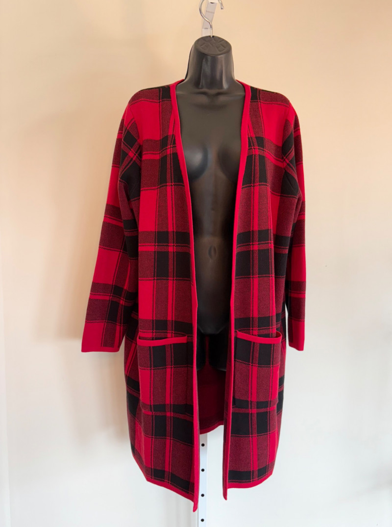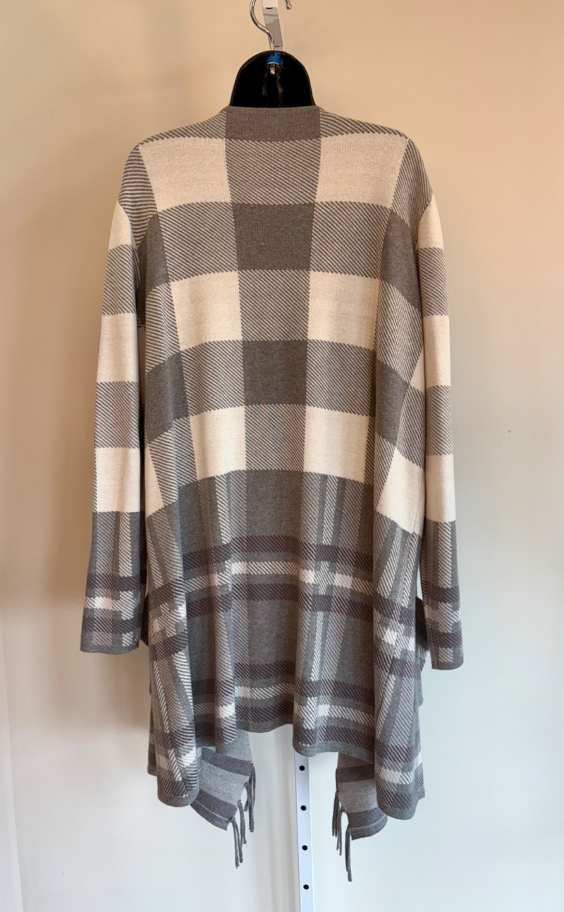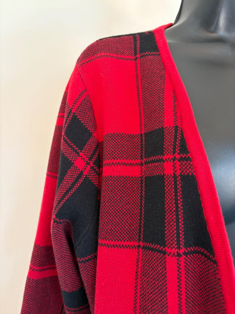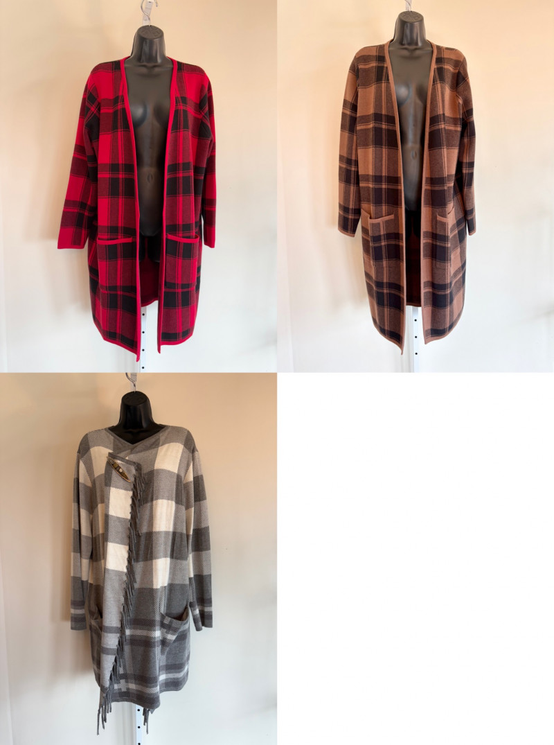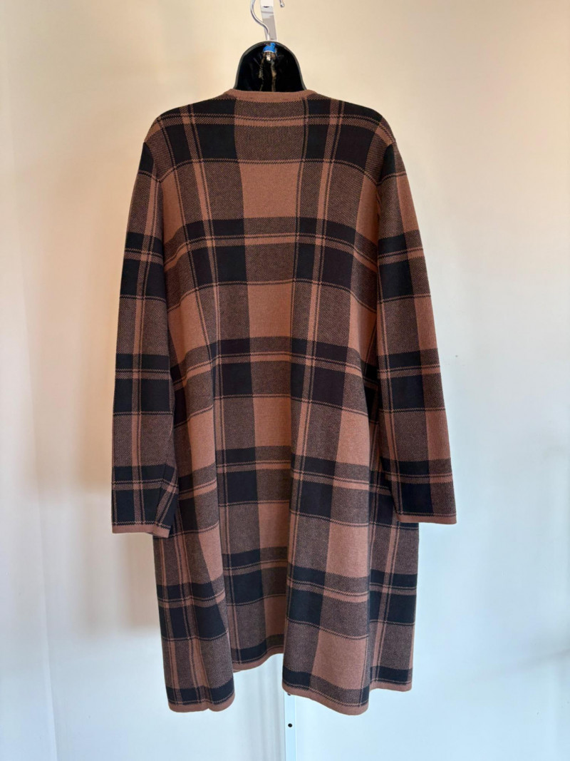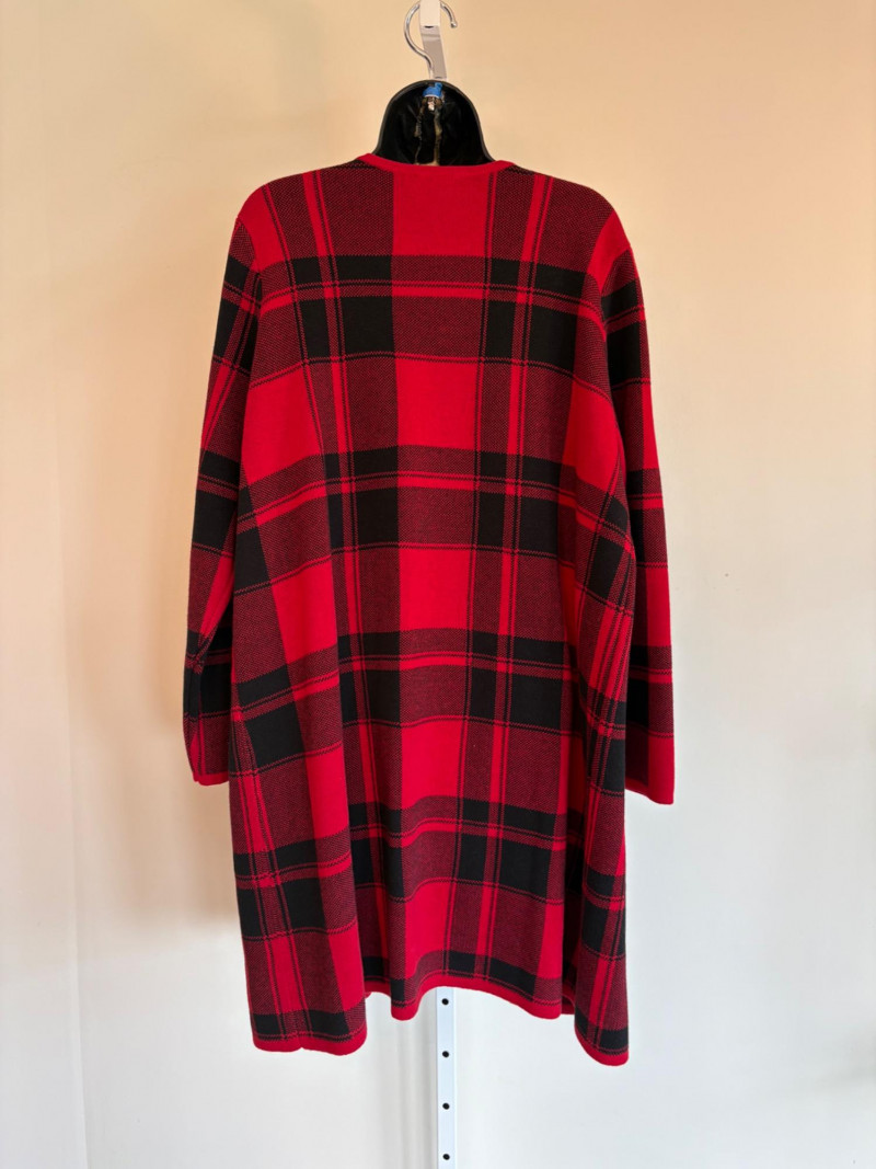 3 plaid long sweater dusters. All measure 24" pit to pit. Red/black sweater and brown/black sweater from D&Co are identical except for colorway. Both have solid color ribbing around neckline, front edges, hem, and sleeve ends. Open front with front patch pockets. Cotton /polyester blend. Measure 35" from back neckline to hem. Size tags say 1X. Grey/white sweater from Isaac Mizrahi has solid color ribbing around neckline and hem along with front patch pockets.. Front edges are extended and finished with fringe. Cotton /nylon/rayon blend. Measures 34" from back neckline to hem. Size tag says XL. Note that brooch shown in 3rd to last photo is not included - just to show alternative closure.