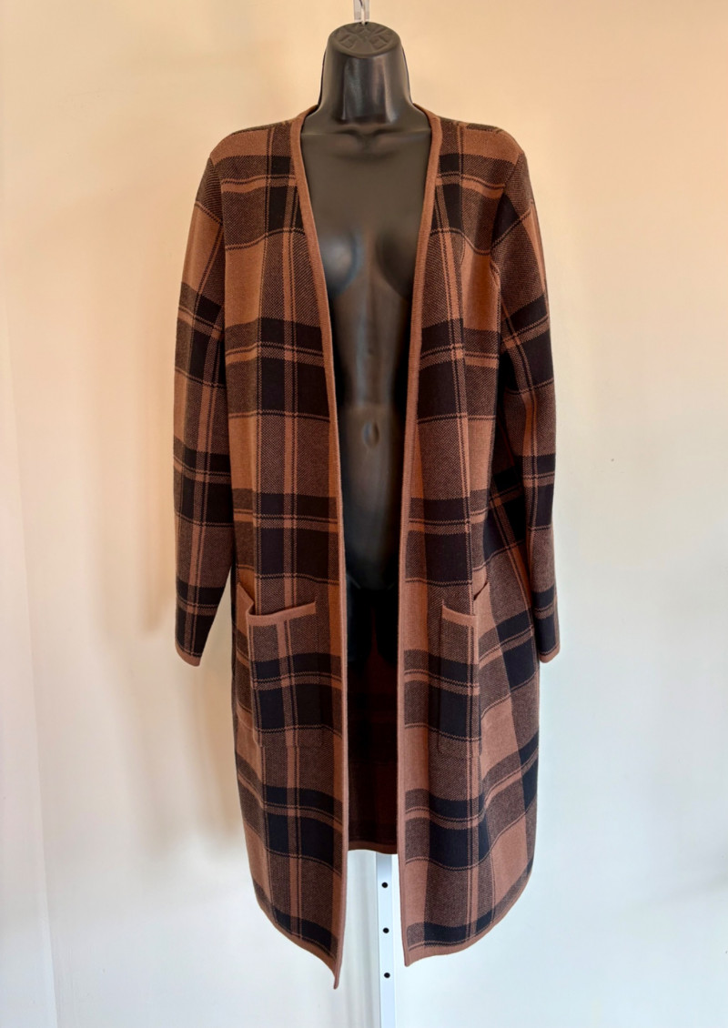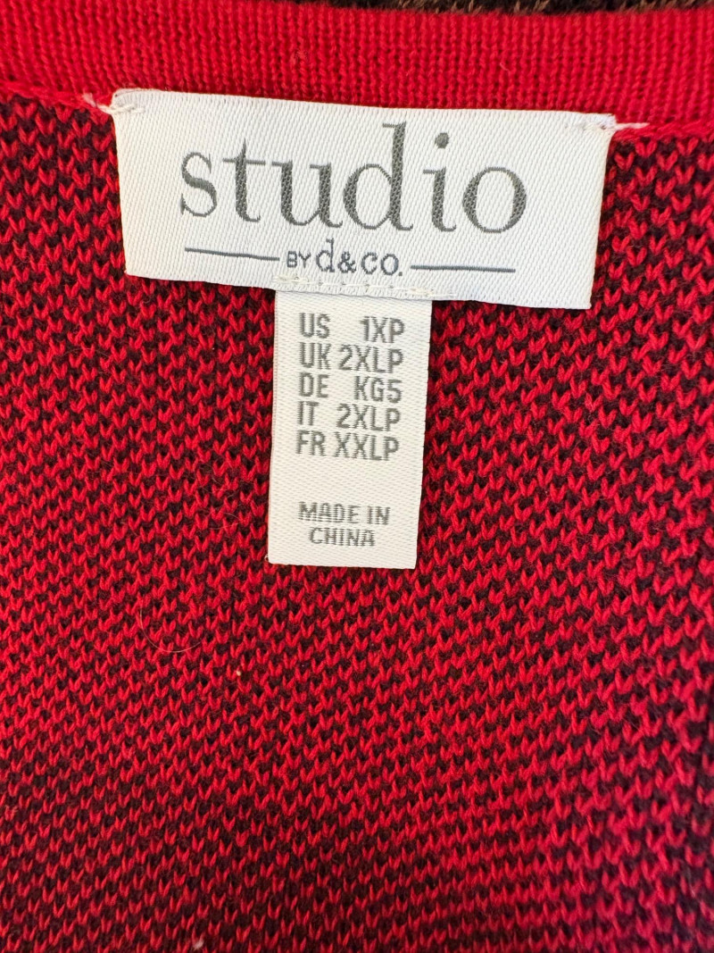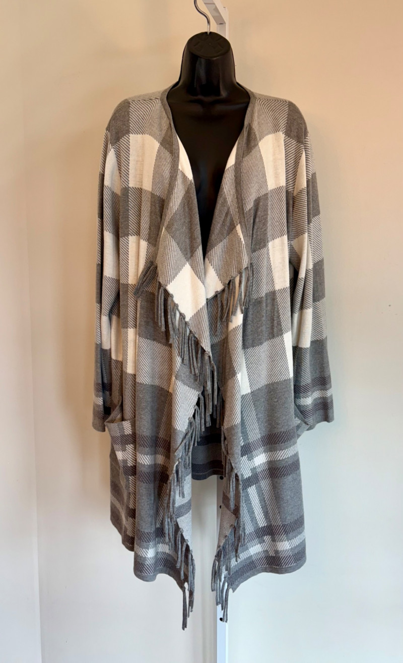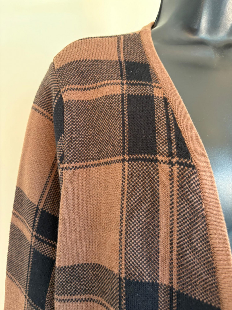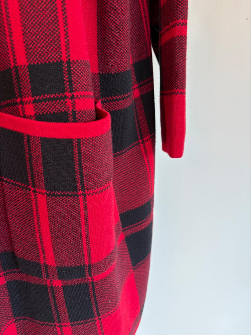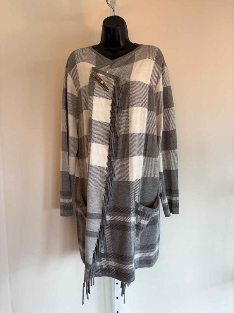 3 plaid long sweater dusters. All measure 24" pit to pit. Red/black sweater and brown/black sweater from D&Co are identical except for colorway. Both have solid color ribbing around neckline, front edges, hem, and sleeve ends. Open front with front patch pockets. Cotton /polyester blend. Measure 35" from back neckline to hem. Size tags say 1X. Grey/white sweater from Isaac Mizrahi has solid color ribbing around neckline and hem along with front patch pockets.. Front edges are extended and finished with fringe. Cotton /nylon/rayon blend. Measures 34" from back neckline to hem. Size tag says XL. Note that brooch shown in 3rd to last photo is not included - just to show alternative closure.