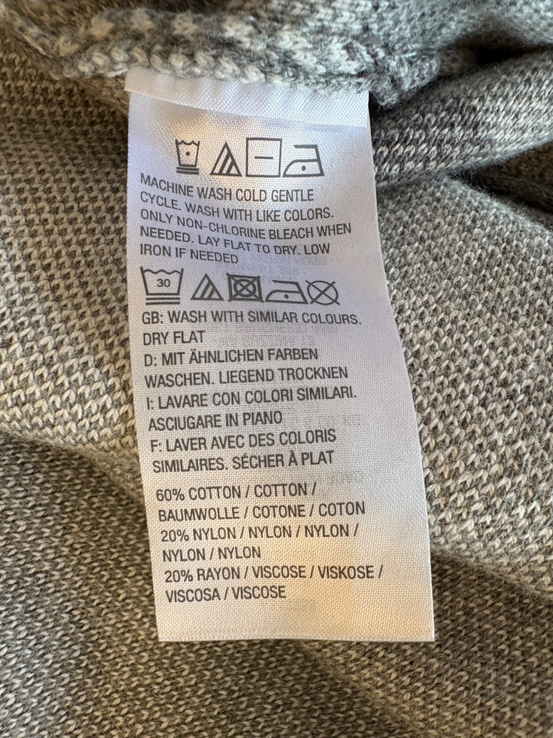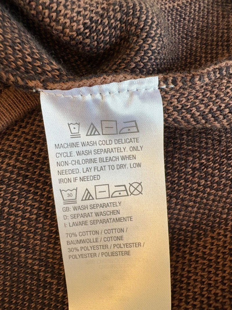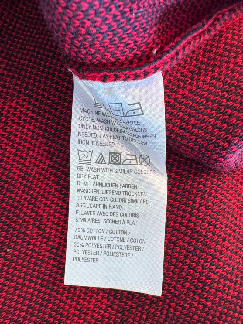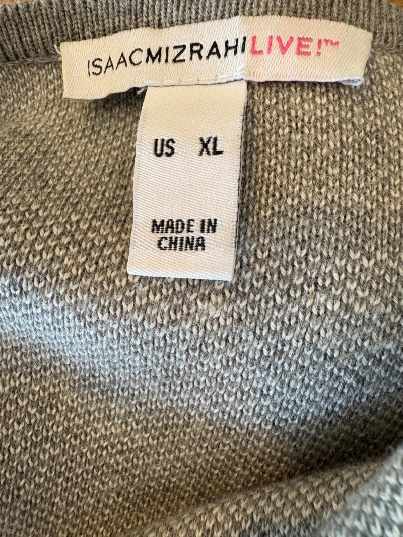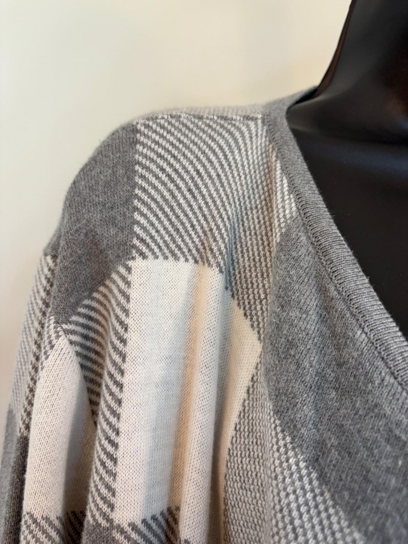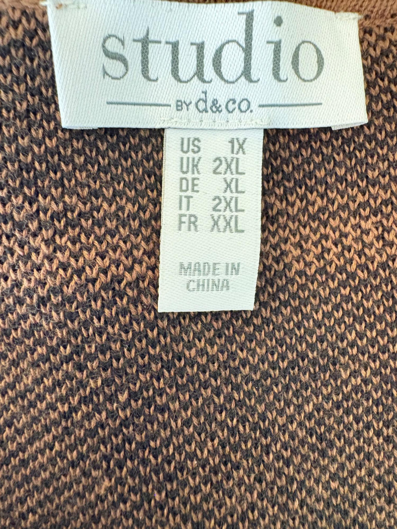 3 plaid long sweater dusters. All measure 24" pit to pit. Red/black sweater and brown/black sweater from D&Co are identical except for colorway. Both have solid color ribbing around neckline, front edges, hem, and sleeve ends. Open front with front patch pockets. Cotton /polyester blend. Measure 35" from back neckline to hem. Size tags say 1X. Grey/white sweater from Isaac Mizrahi has solid color ribbing around neckline and hem along with front patch pockets.. Front edges are extended and finished with fringe. Cotton /nylon/rayon blend. Measures 34" from back neckline to hem. Size tag says XL. Note that brooch shown in 3rd to last photo is not included - just to show alternative closure.