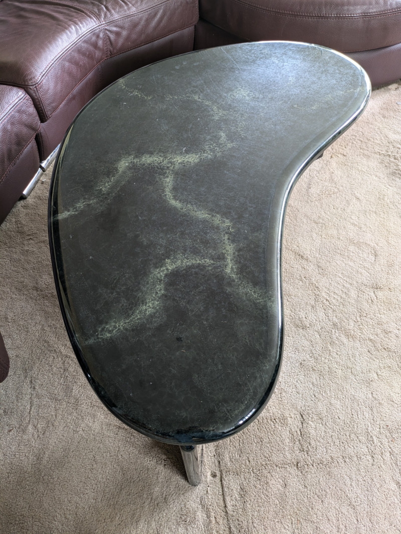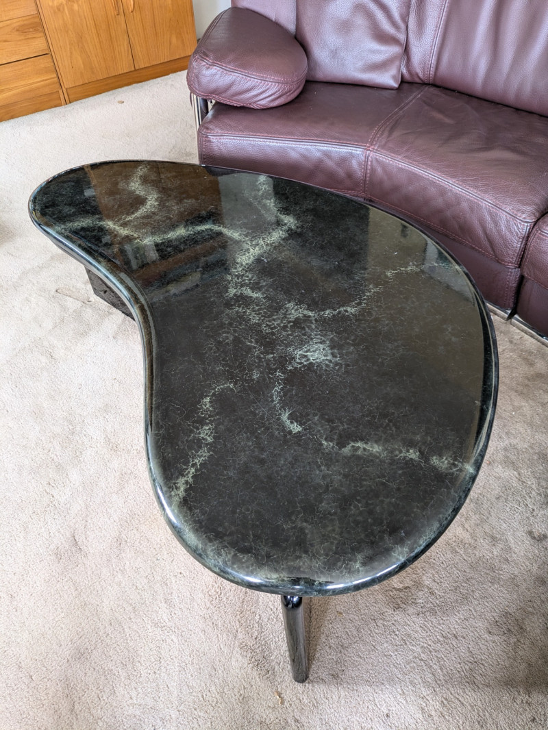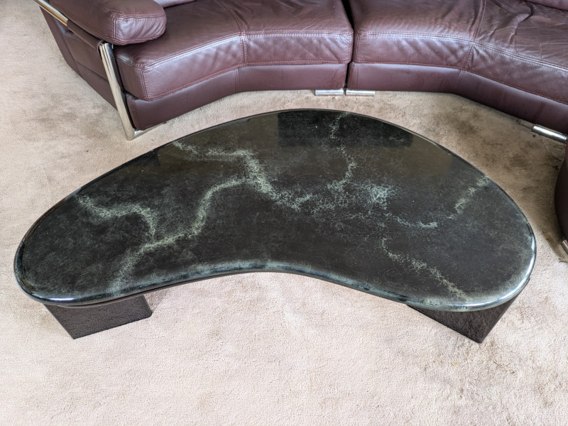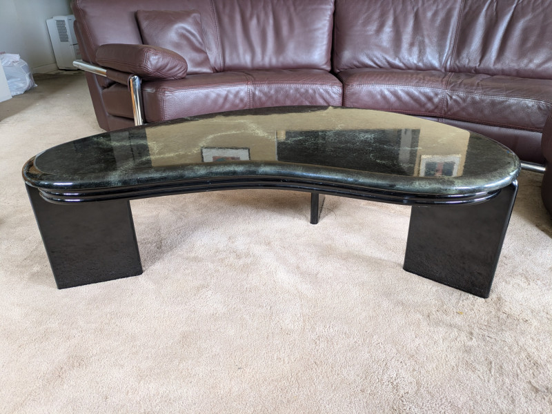 Vintage postmodern coffee table- circa 1980s. Likely Italian made through research. The iconic bean shape of the era is a statement piece that will never be out of style. The color is a combination of black with a green marble veining throughout. Some surface wear from daily use, and ready to be used again in your home. One of three pieces of the same make through this sale. Opportunity for a set!
