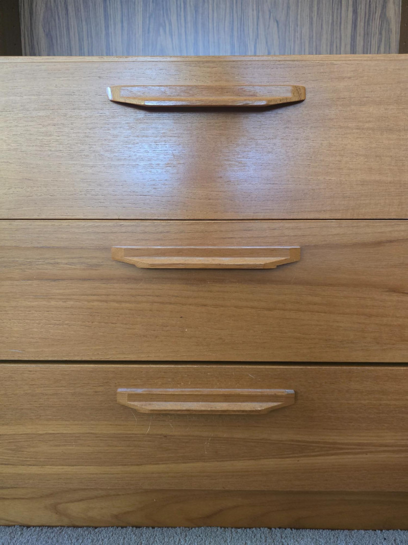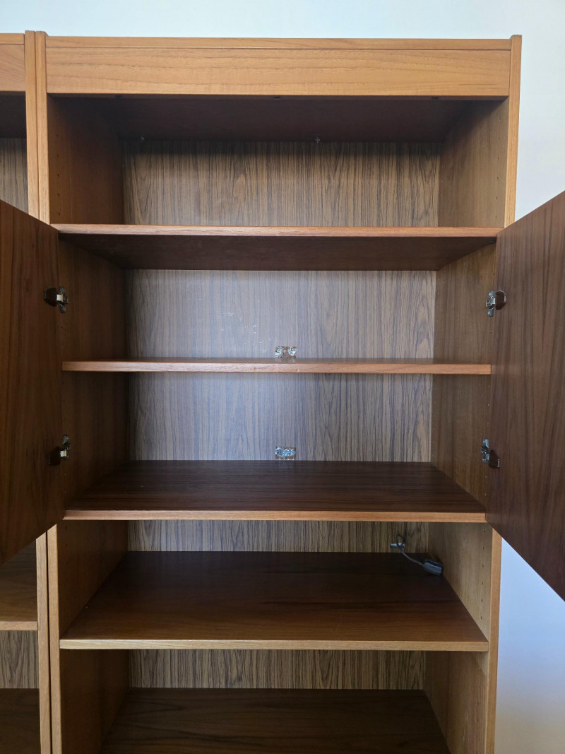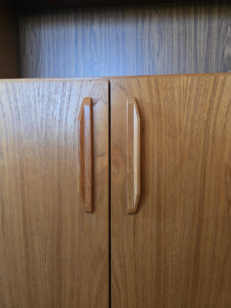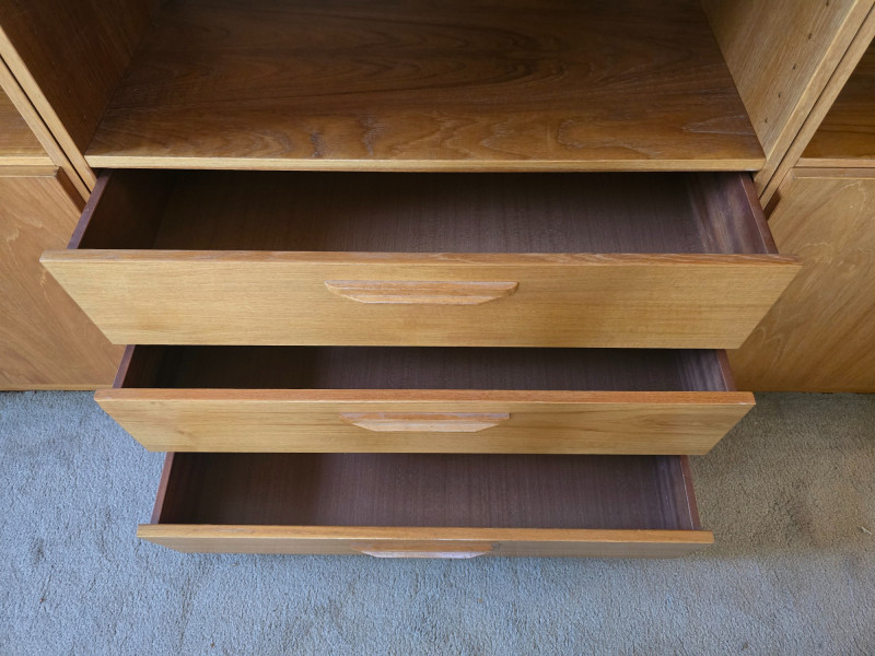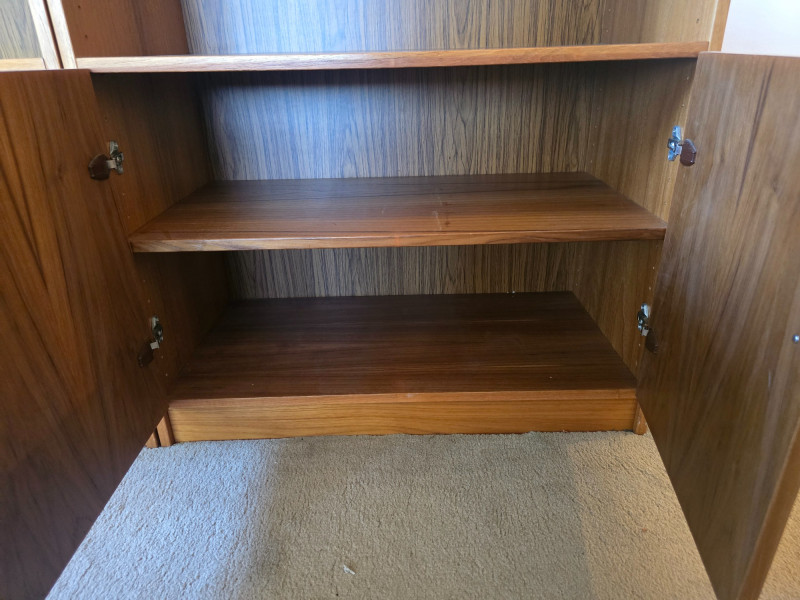 This stunning Danish shelf boasts remarkably well preserved Teak veneer over ply. All the hardware and handles are in excellent functional condition. Very minimal wear. A true timecapsule centerpiece of any room. The unit has several light fixtures pictured throughout the center console. The most observable damage is a small chip in the upper right hand corner of the glass panel, on the right side, below the hardware. Comes apart in three pieces.