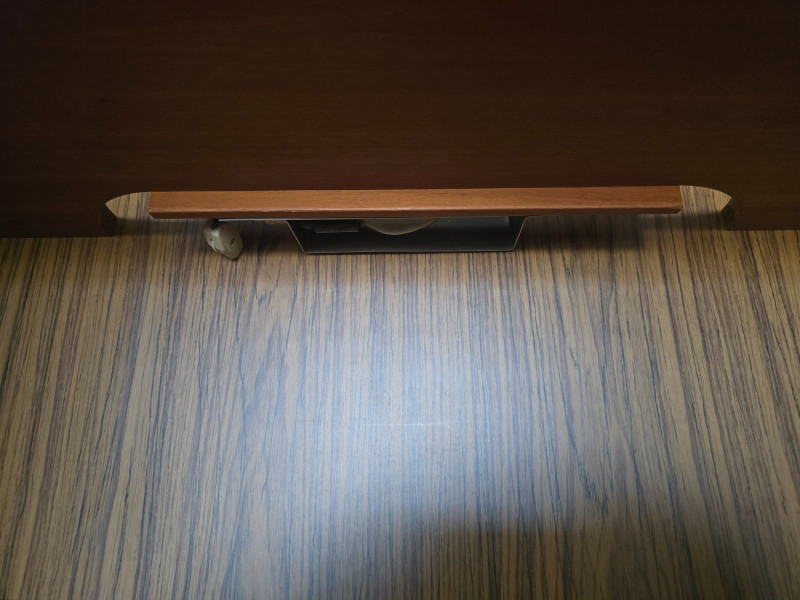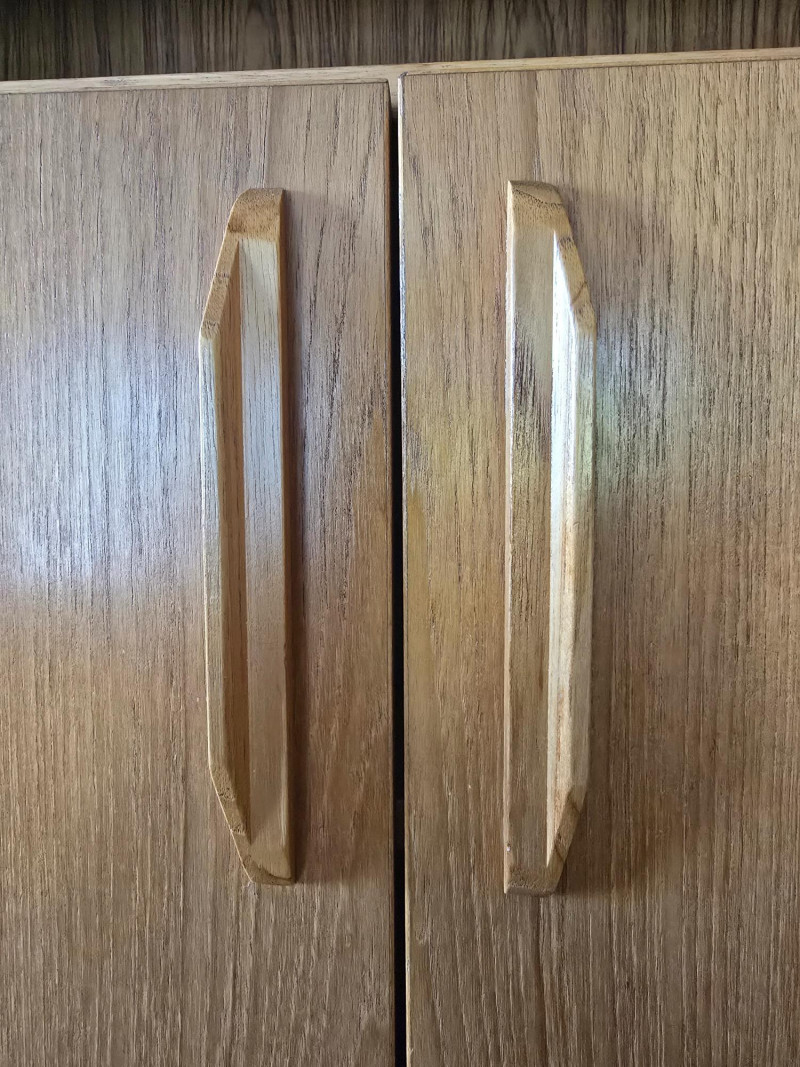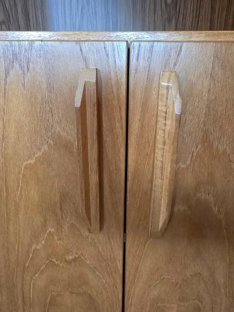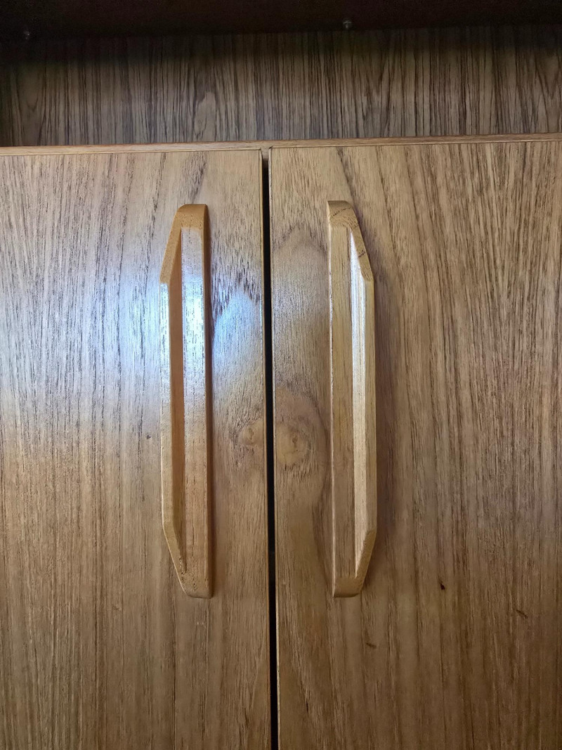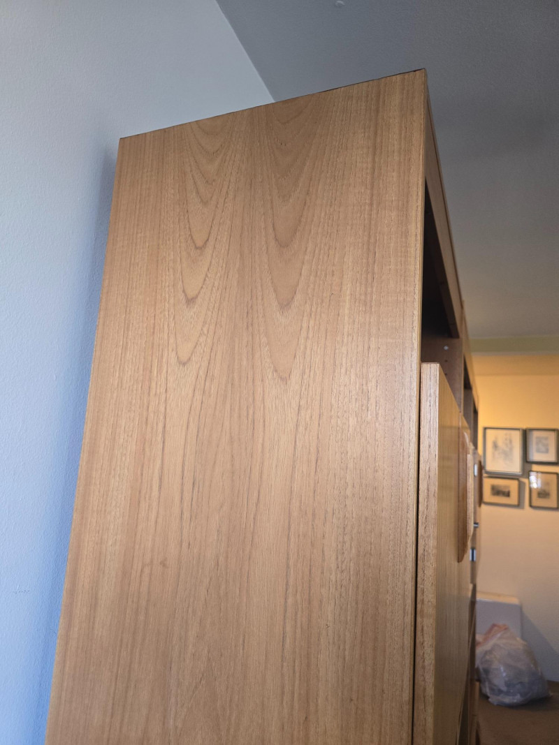 This stunning Danish shelf boasts remarkably well preserved Teak veneer over ply. All the hardware and handles are in excellent functional condition. Very minimal wear. A true timecapsule centerpiece of any room. The unit has several light fixtures pictured throughout the center console. The most observable damage is a small chip in the upper right hand corner of the glass panel, on the right side, below the hardware. Comes apart in three pieces.