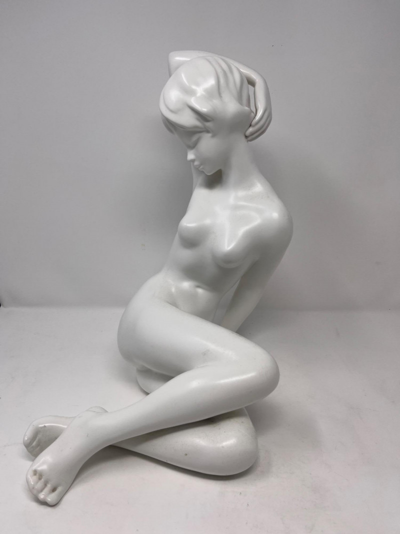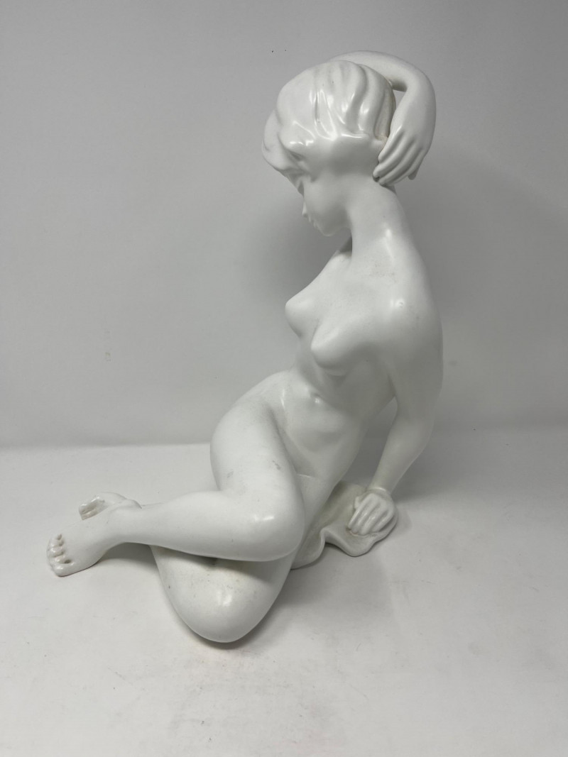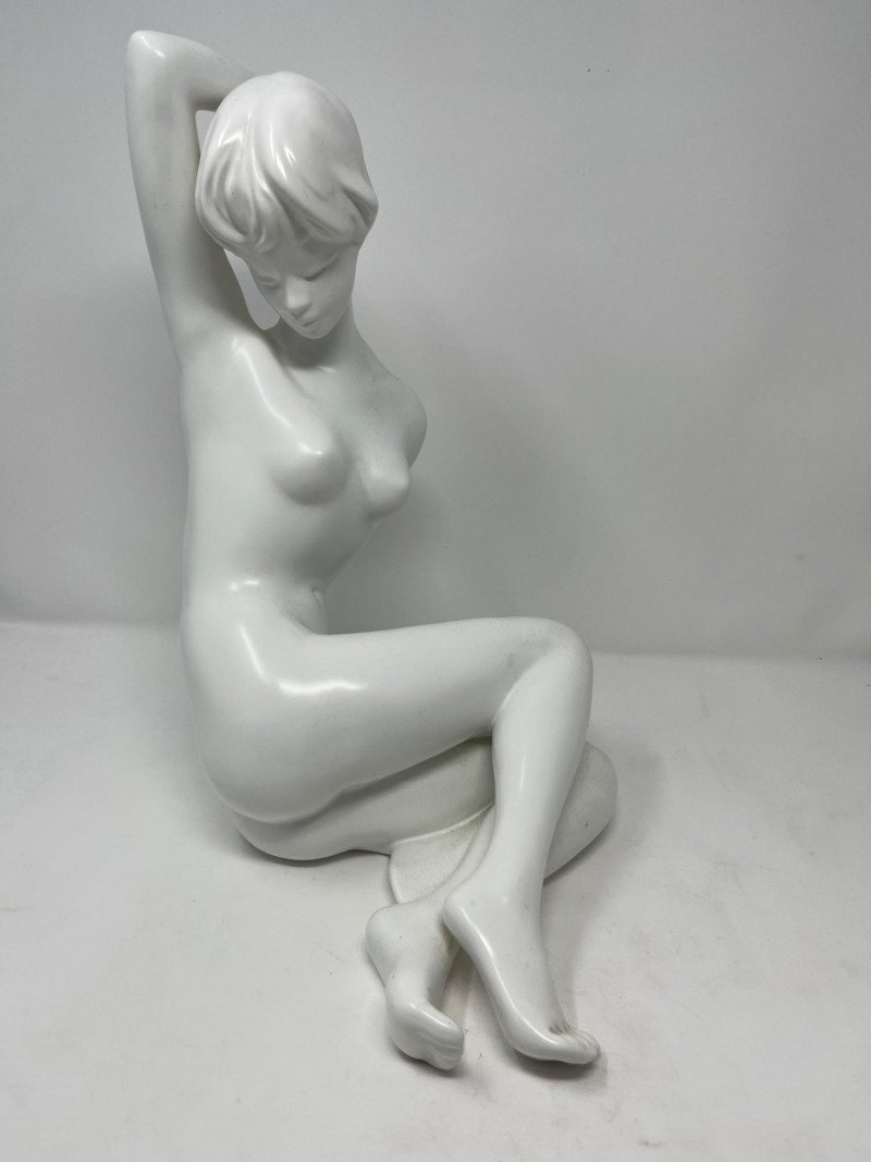 Vintage Goebel Nude Porcelain Statues- lot of 4 total. All have Goebel stamp and individual serial numbers. Large lounging woman w/bob cut- 11”x14” Medium woman with ceramic- 7”x12” Small woman w/ ponytail- 7”x9” Small woman w/ braid- 7”x9.5”