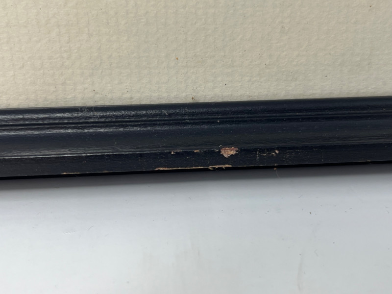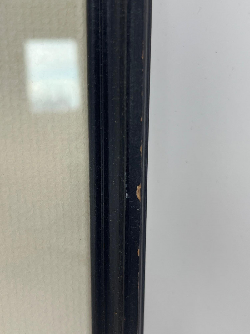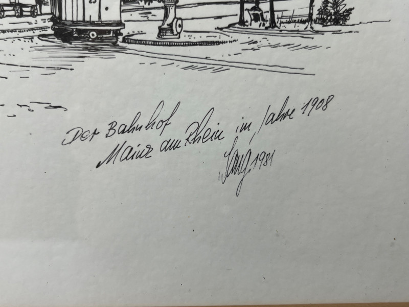 Original ink drawing of a train station in Mainz, Germany in 1908. The cursive writing in the corner is German "Der Bahnhof Mainz am Rhein im Jahre 1908" which translates in English "The train station Mainz on the Rhine in the year 1908". The artist signature, possibly "Jang" or "Lang", and the date 1981 are present underneath the written description in the corner. Matted and framed- some small wear along the frame but the drawing is preserved in the frame with no wear or damage.