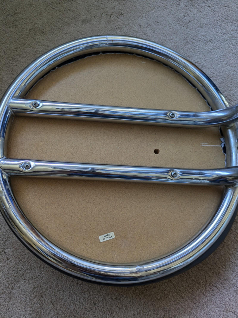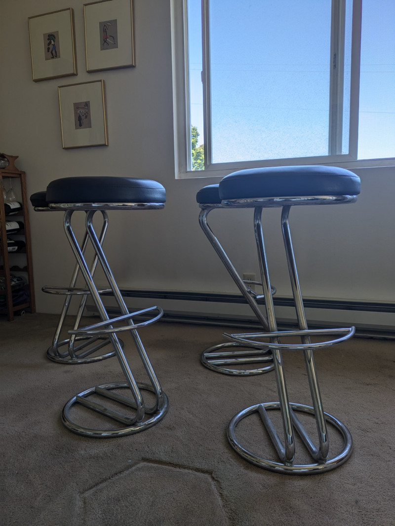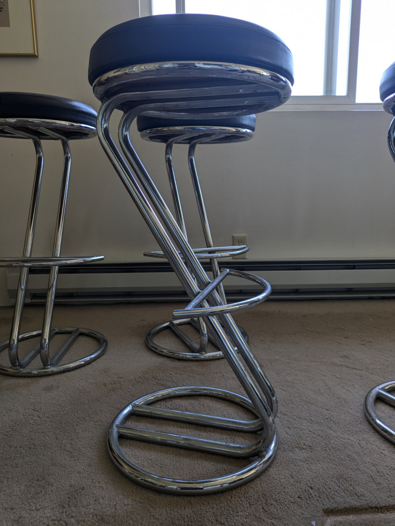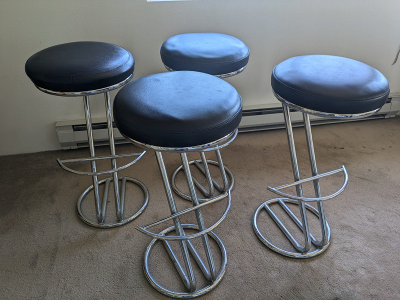 Set of 4 Italian Effezeta barstools. Sticker on underside says "Made in Italy". Mid century Z shape gives a quirky, retro vibe to any kitchen island or home bar.