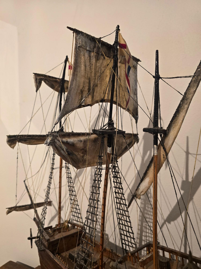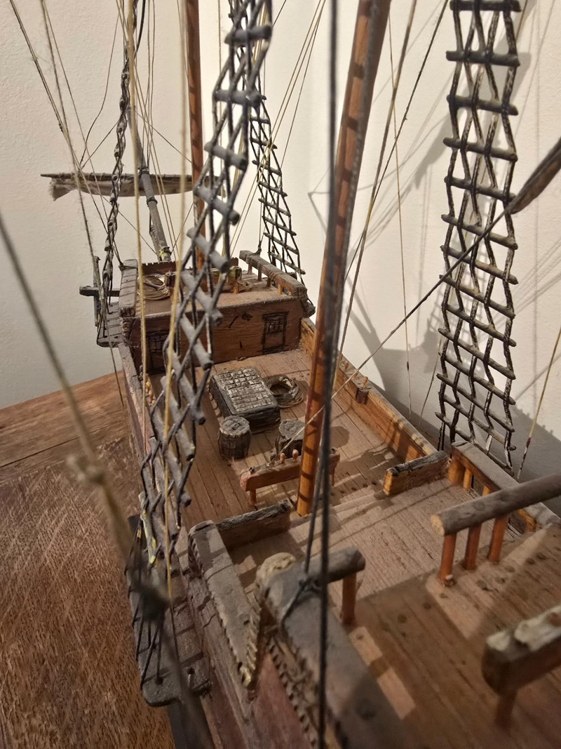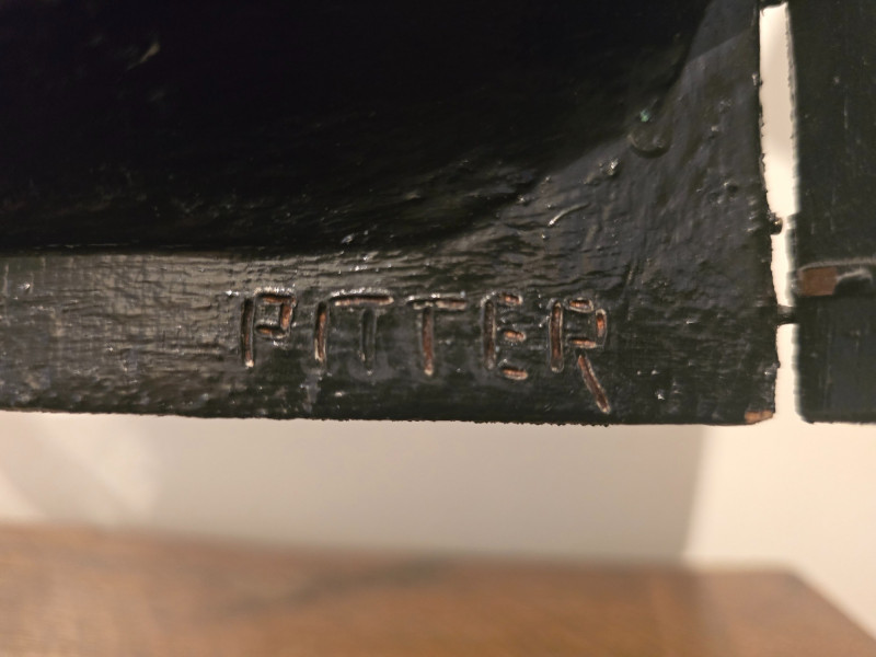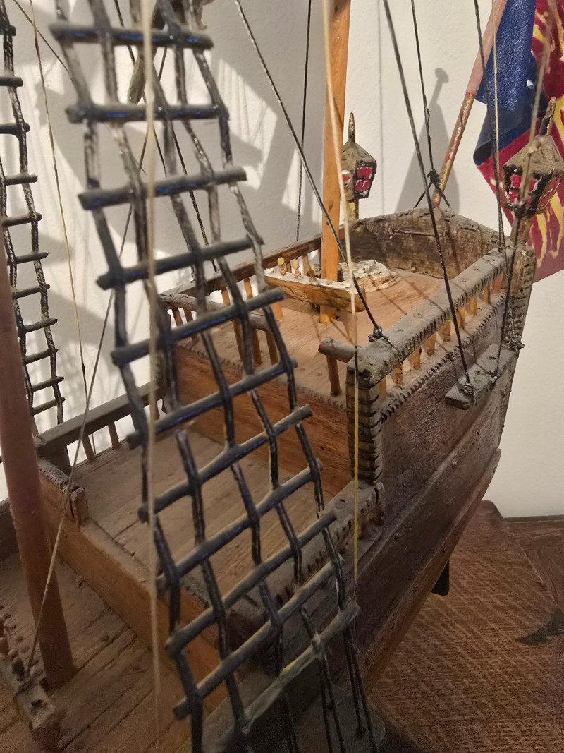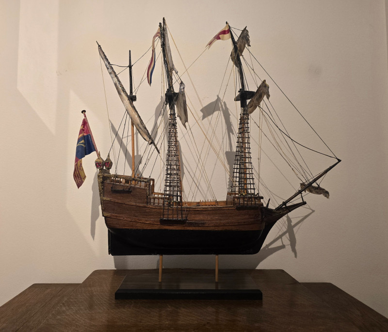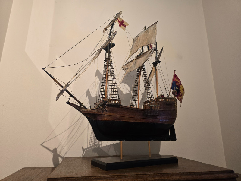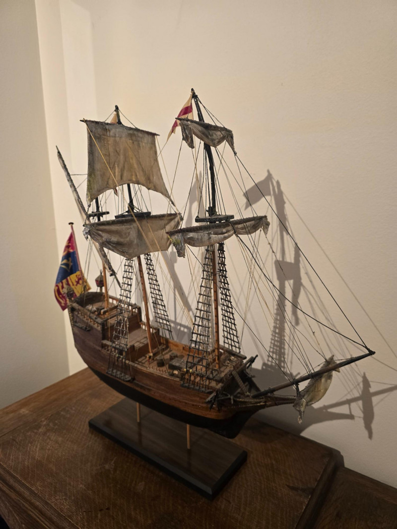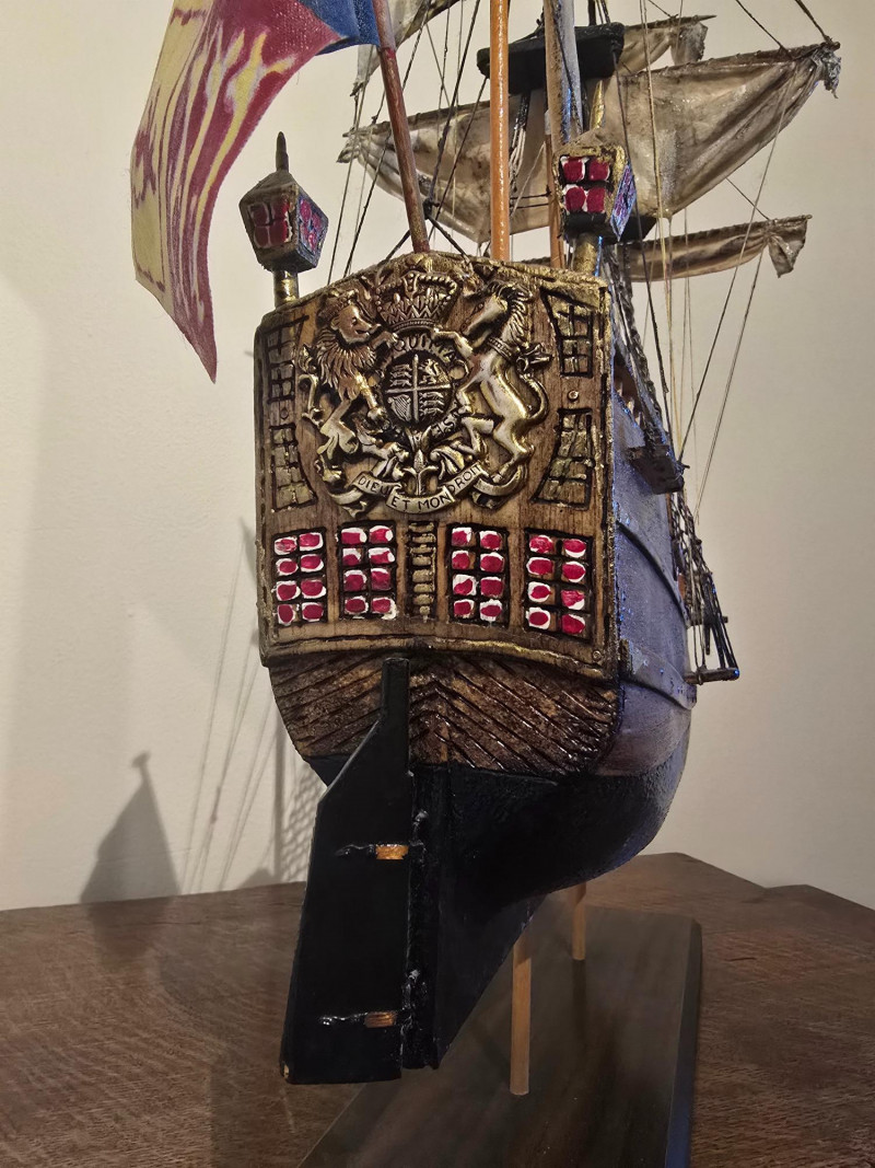 Handcrafted vintage ship- name “Pitter” is carved onto the piece. Scaled down to fit in your home, every detail is captured as though it was shrunk from the original size. The ships crest is that of Royal Coat of Arms for England with Latin writing that translates to “God and my right”