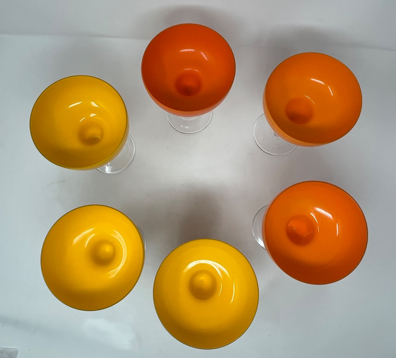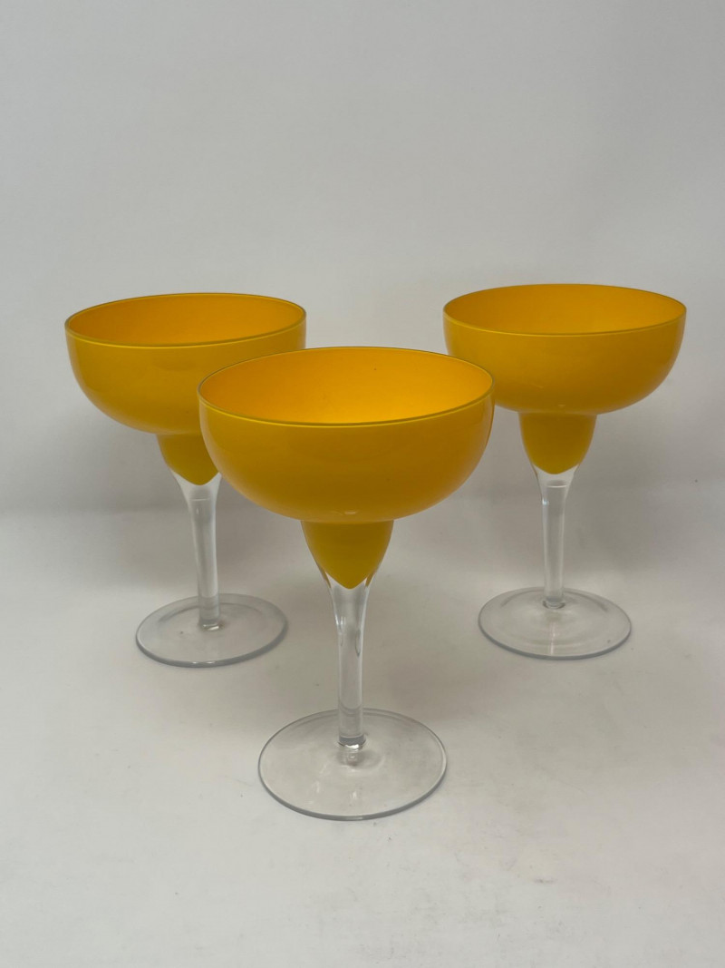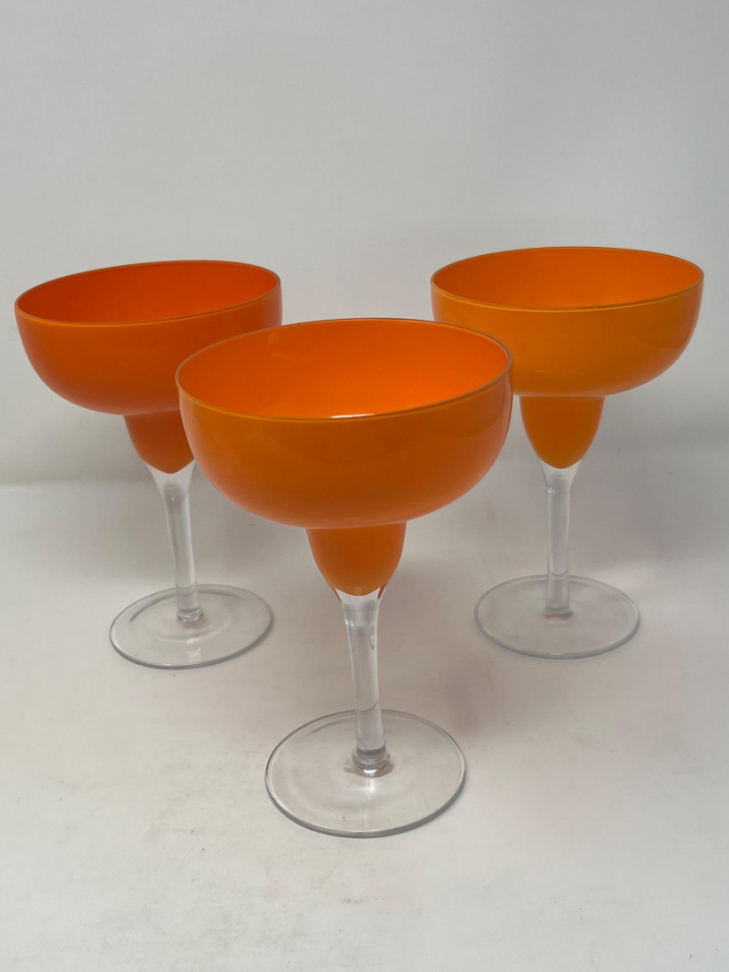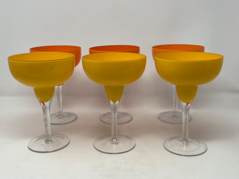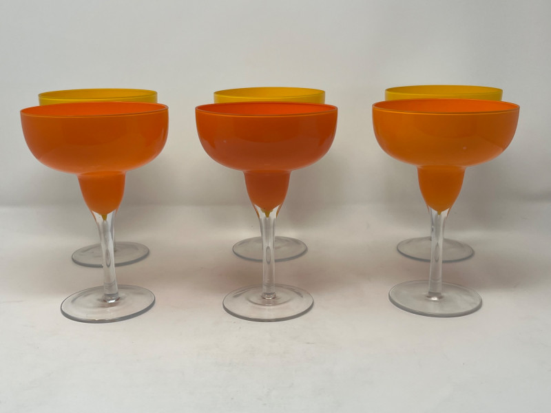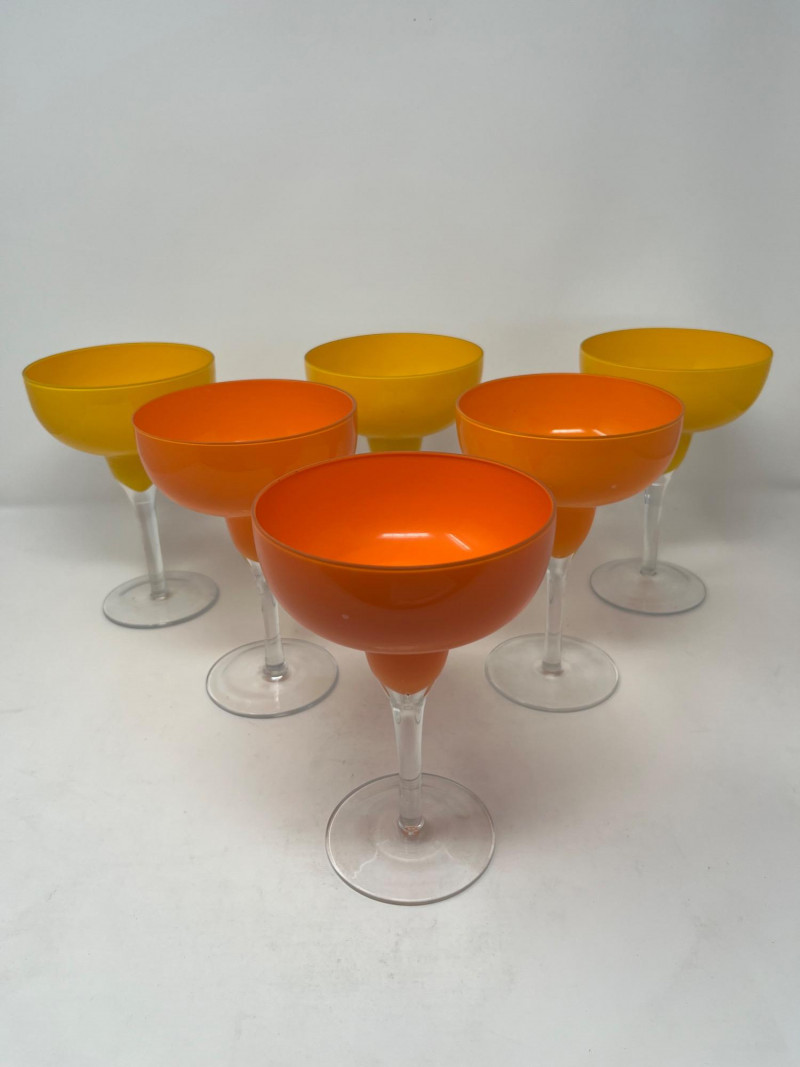 Set of 6 colorful margarita glasses- varying shades of orange and yellow. Great condition, no cracks or chips. Perfect for entertaining company outdoors or giving a mid century modern flair to an indoor bar.