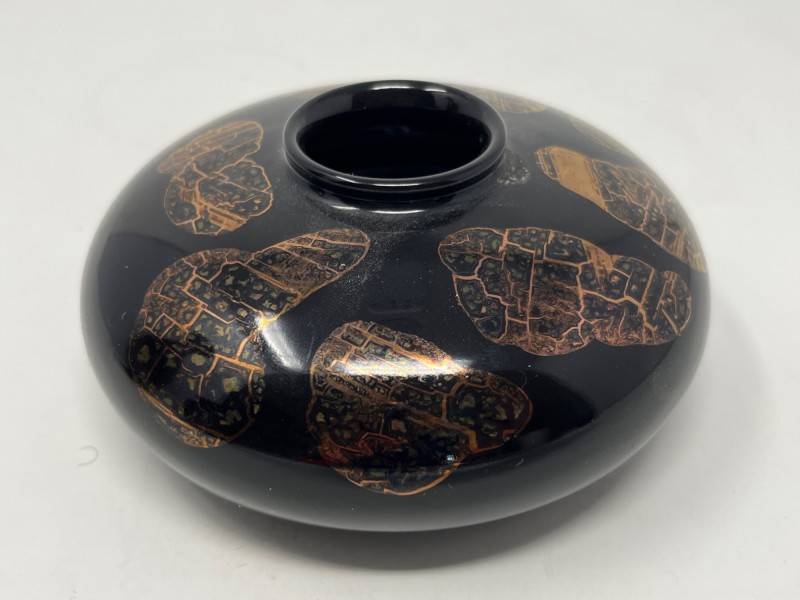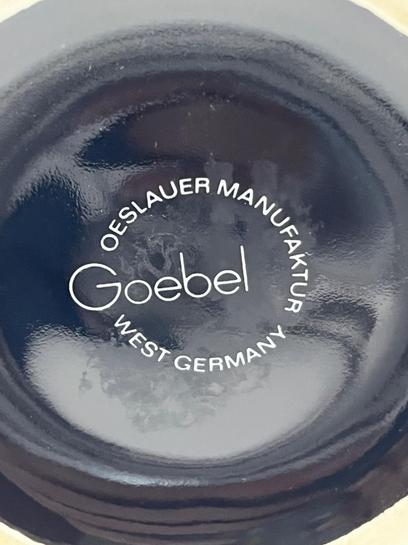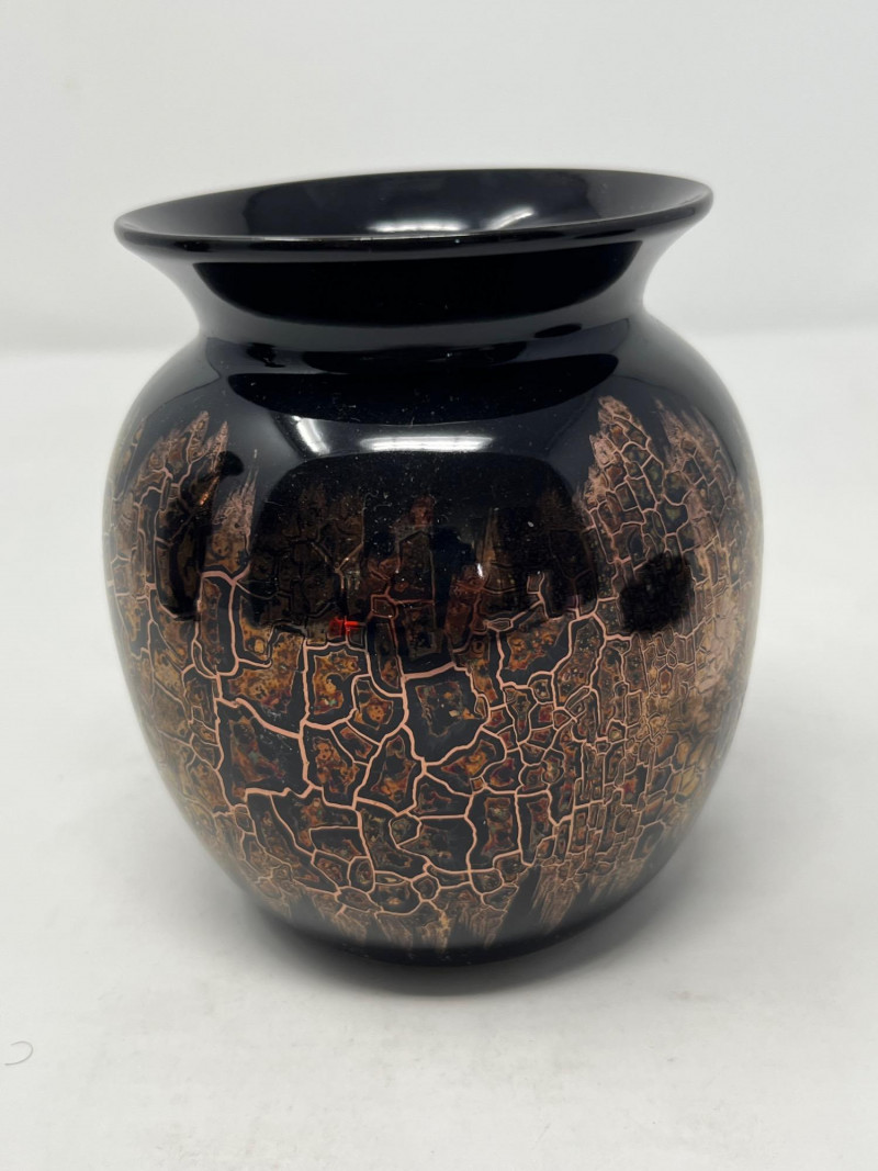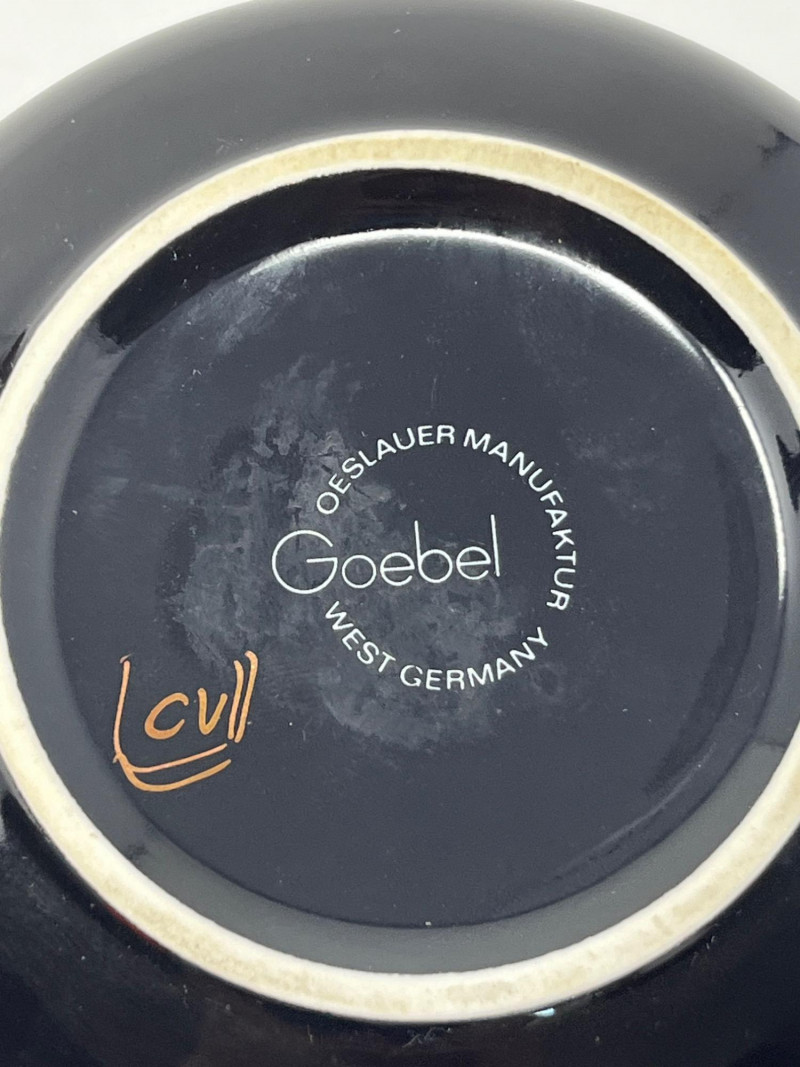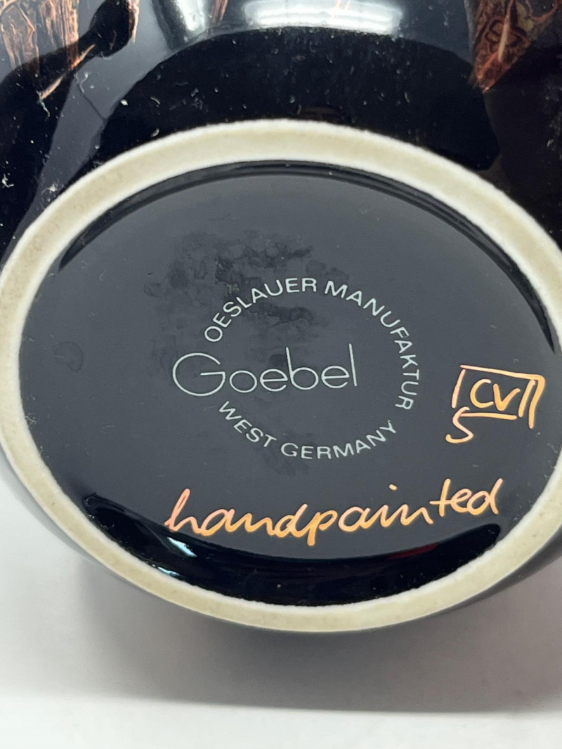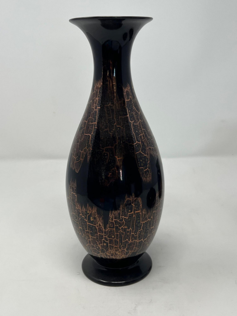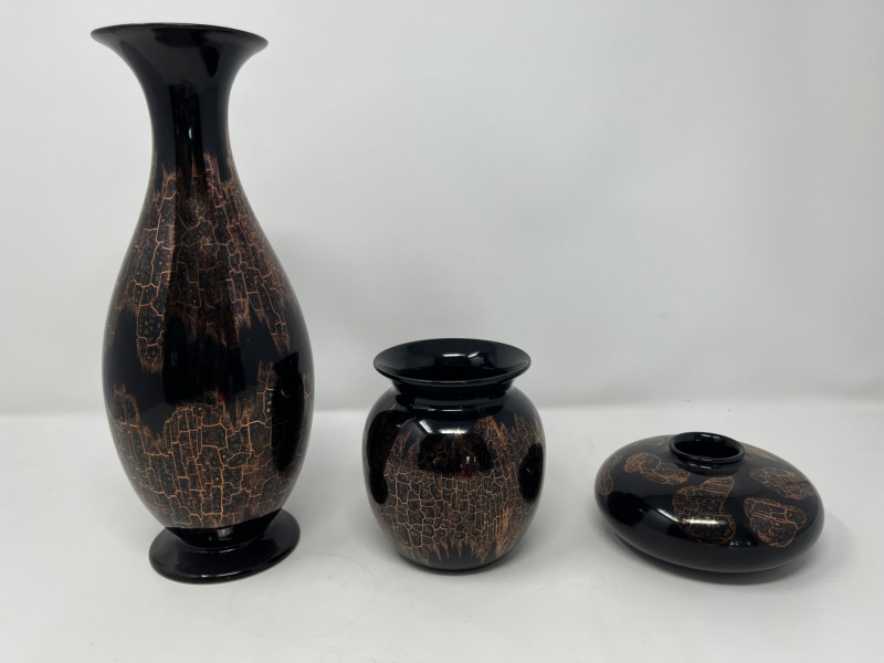 Lot of 3 hand-painted vases by Goebel West Germany. Vases are black with a copper-colored finish that produces a controlled crackle effect. Tallest vase measured at 11” height with a 5” diameter at its widest point. The middle case has a 5” height with a 4” diameter at its widest. The smallest base has a height of 2.5” and is 5” wide. The Goebel Company, based in Rödental, northern Bavaria, has been creating fine porcelain tableware and decorative items since 1871.