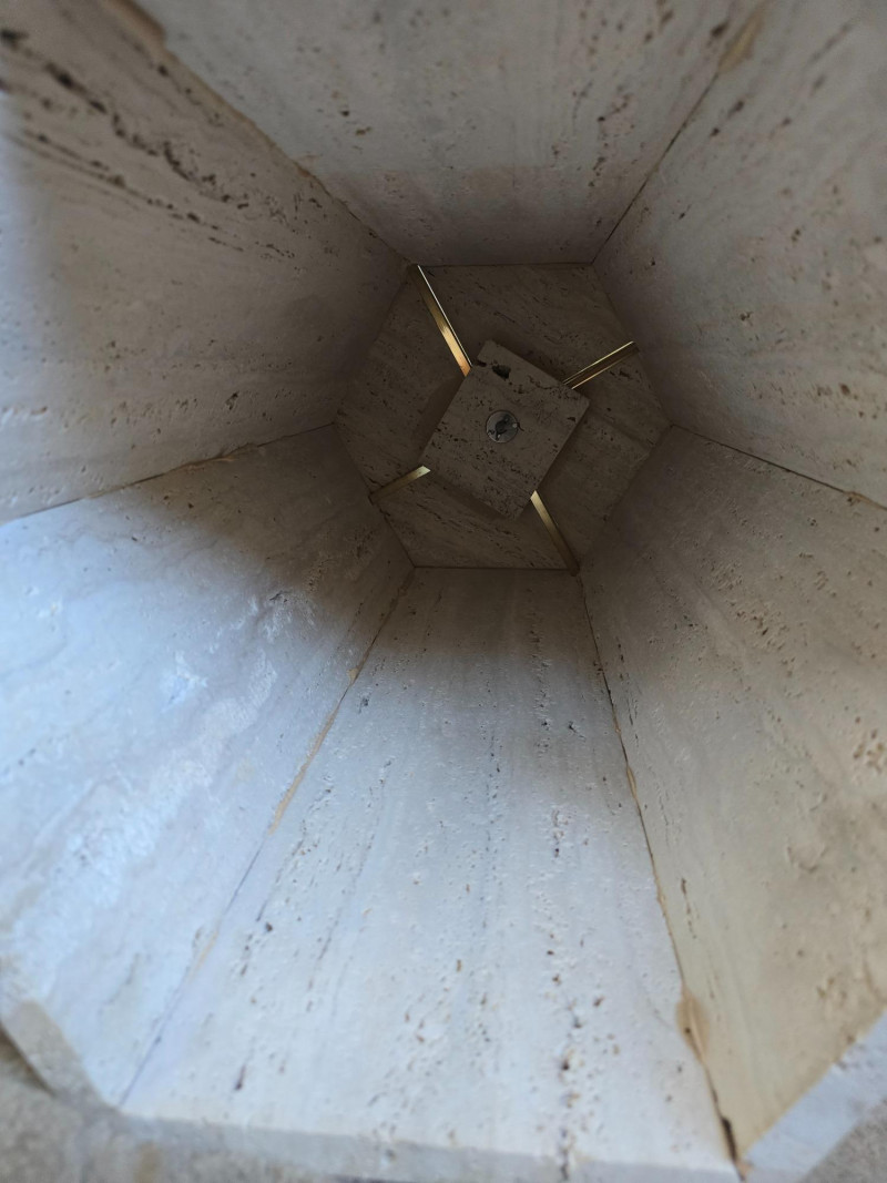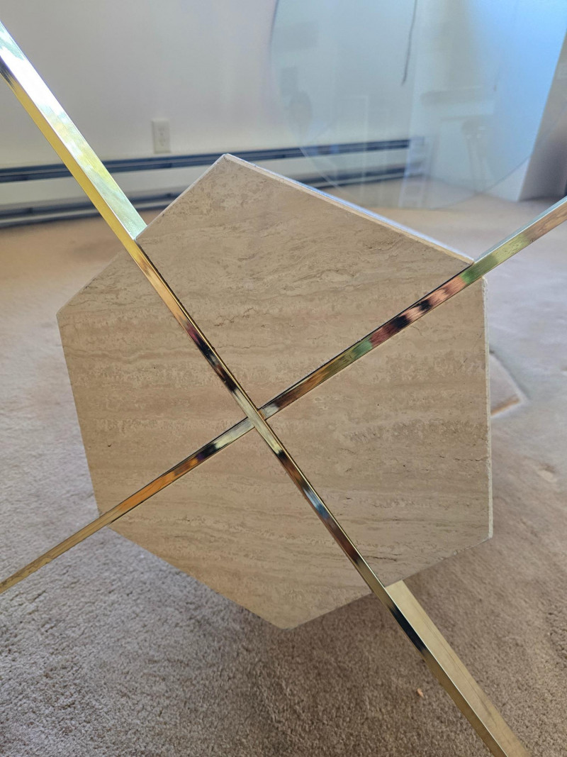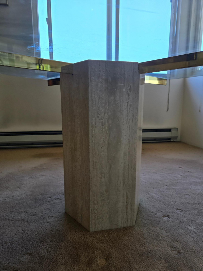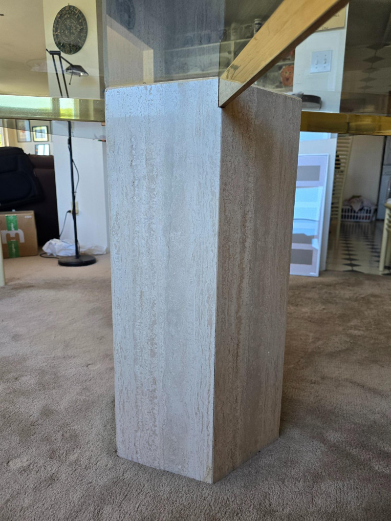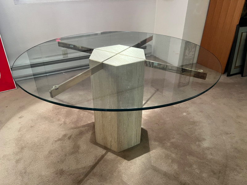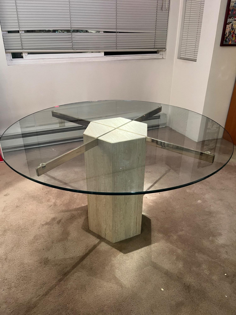 Glass top mid century modern coming table. Seats 4 people comfortably. Glass is free from chips or breaks. Simple geometric stone base, possibly marble. A great choice for any dining room.