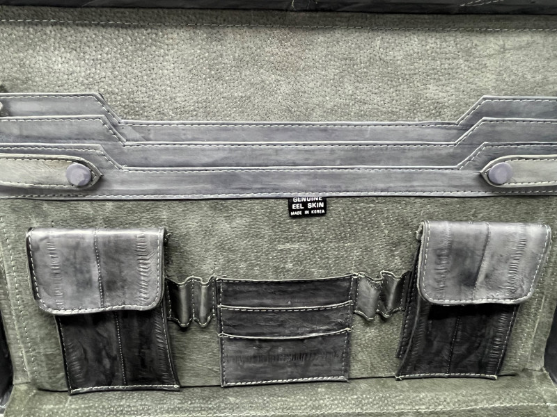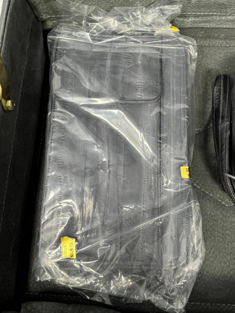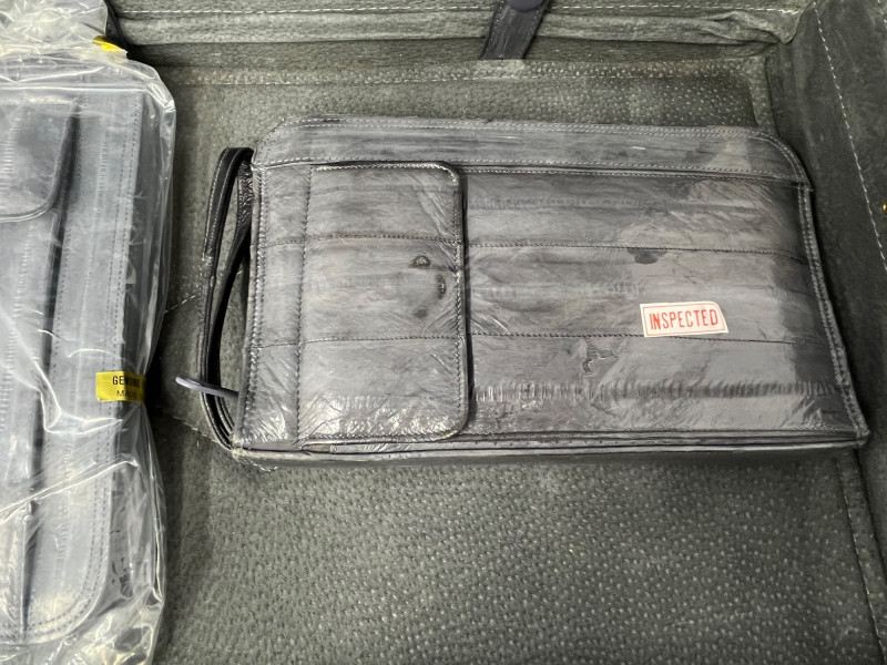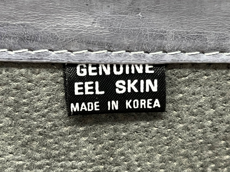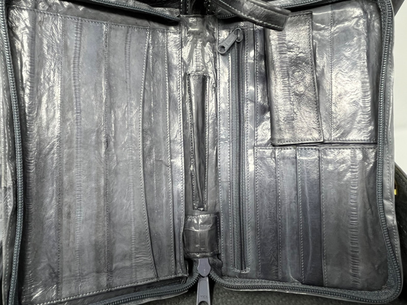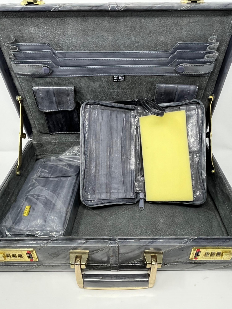 Vintage Eel Skin suitcase with two matching travel bags from Korea. Genuine Eel skin on both suitcase and matching bags- one still in original wrapping, untouched by time. Hardware is sturdy and opens easily. Quality craftsman ship in great condition for age and use. Some scuffing on hardware and leather is soft, but has some spots on wear on the opened bag. Original packing foam kept inside opened bag to help it retain its shape.