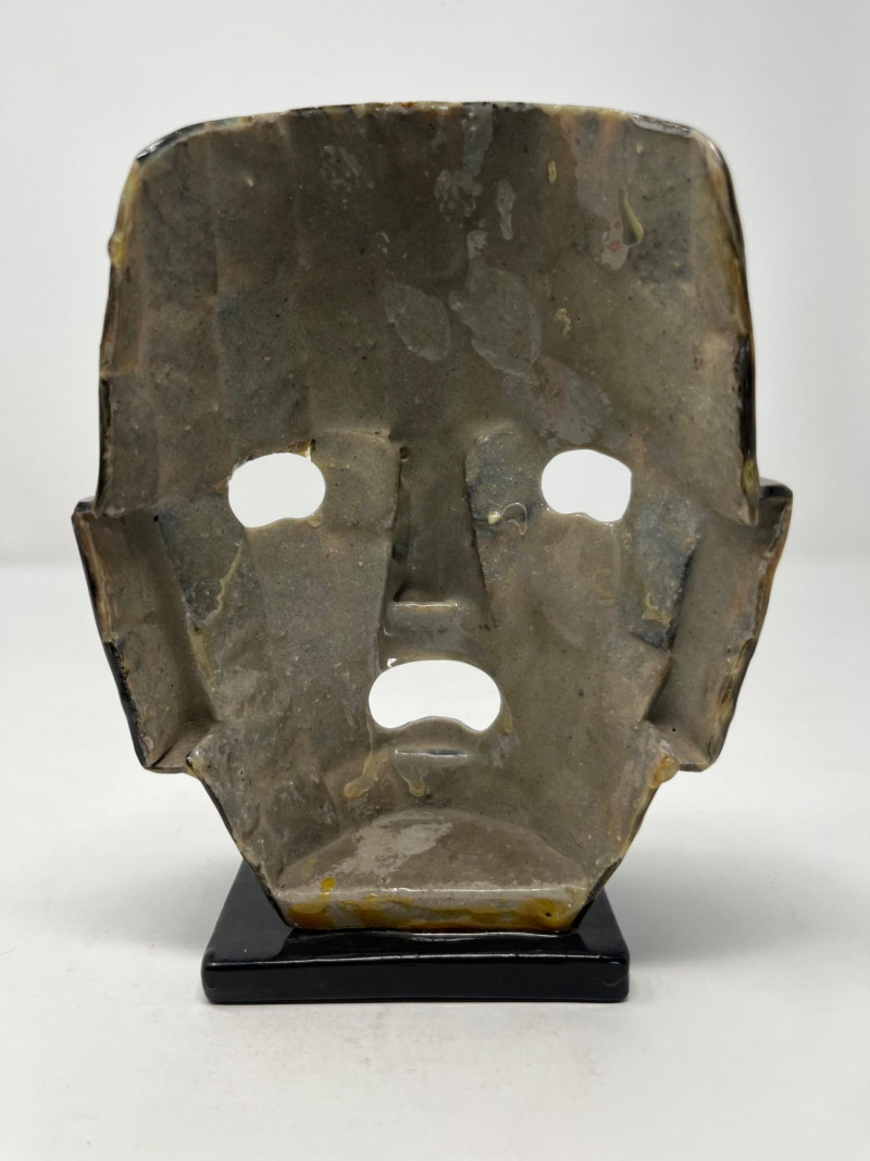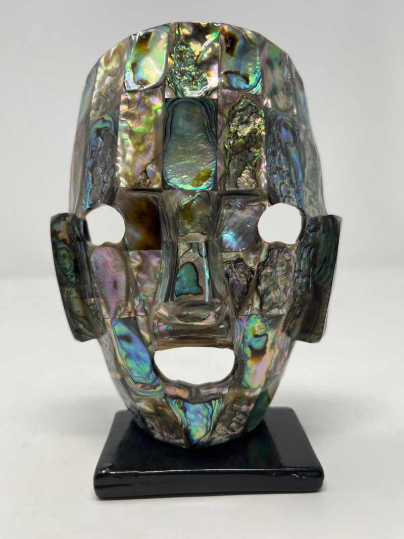 Sculpture of an expressive face made of abalone on a black base. Backside is unfinished. Surface texture varies by each section of abalone.
