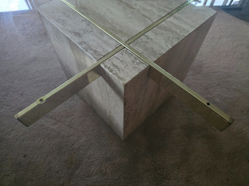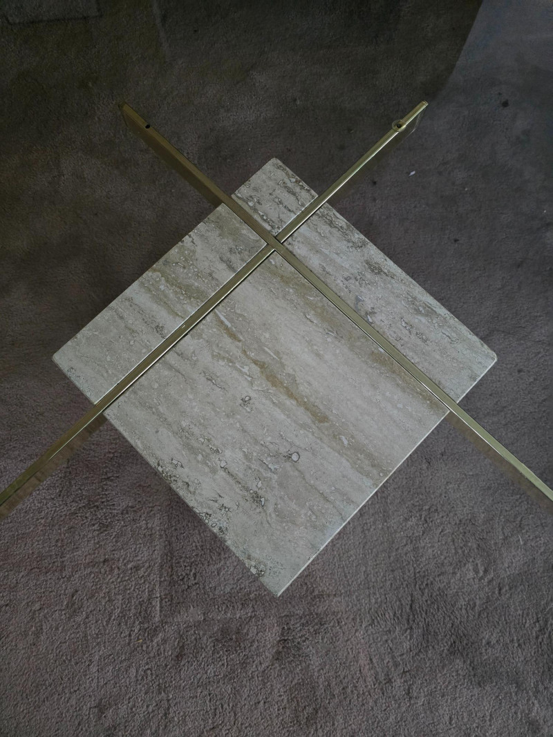 Beautiful Artedi Italian coffee table from the 1970's. The design features a white and tan marble stone square base which has two intersecting brass metal support bars that hold up the rounded square glass top. The table is in great condition and adds unique style and drama to your space. Fits in well with postmodern, Hollywood regency or Post modern styles