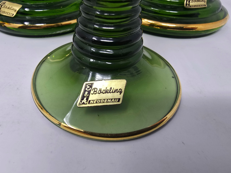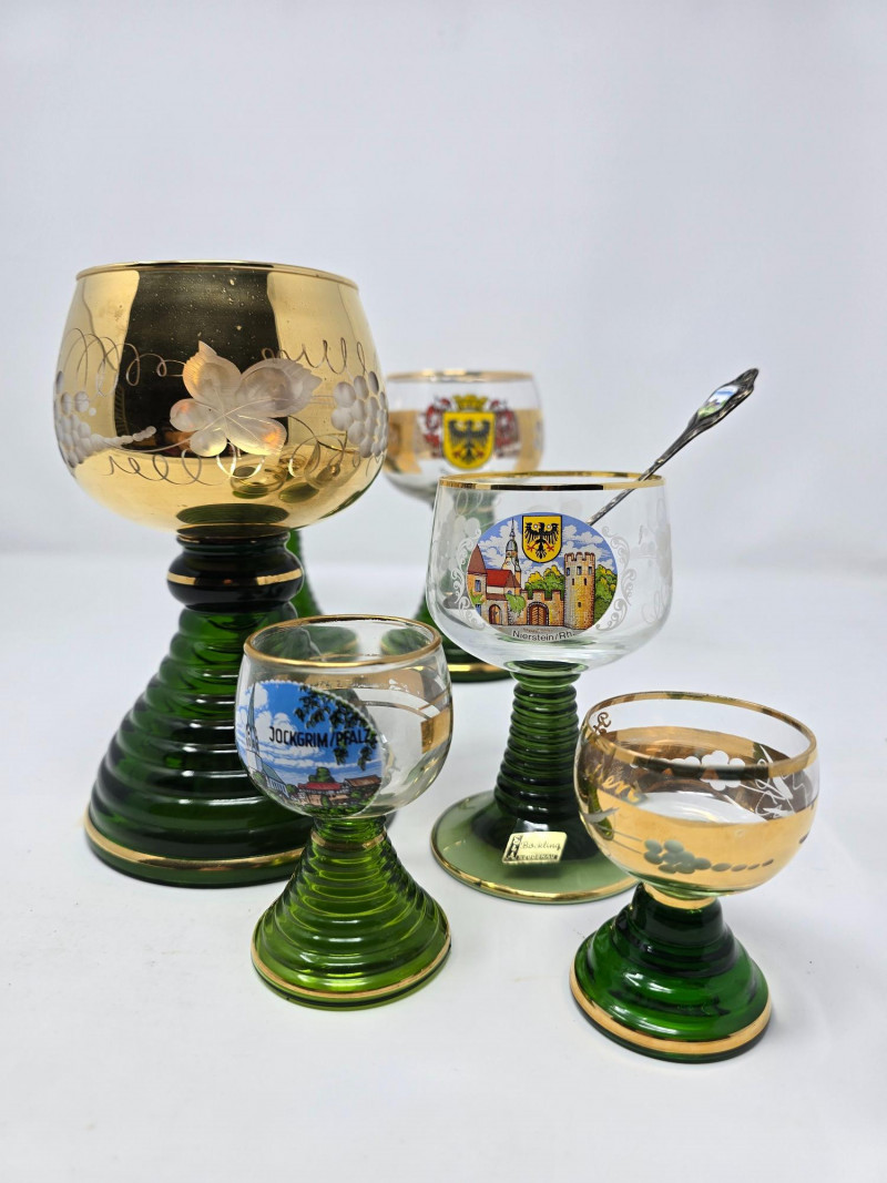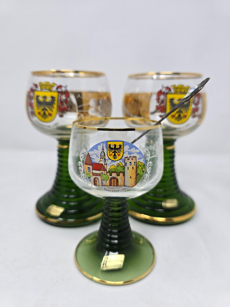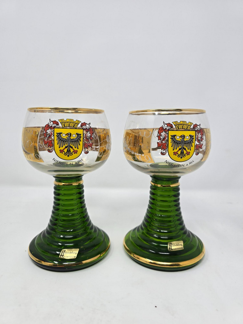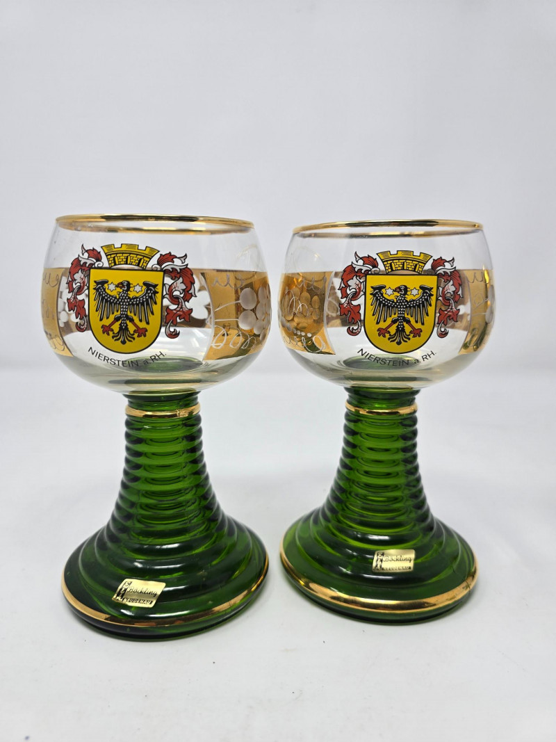 Römer, type of wineglass evolved in Germany, especially in the Rhineland, and the Netherlands over several centuries, reaching perfection in the 17th century. The shape of the Römer is a hemisphere superimposed on a cylinder, with a hollow foot built up by coiling threads of molten glass around a conical core. These examples are in fantastic condition and even exhibit the factory production stickers.