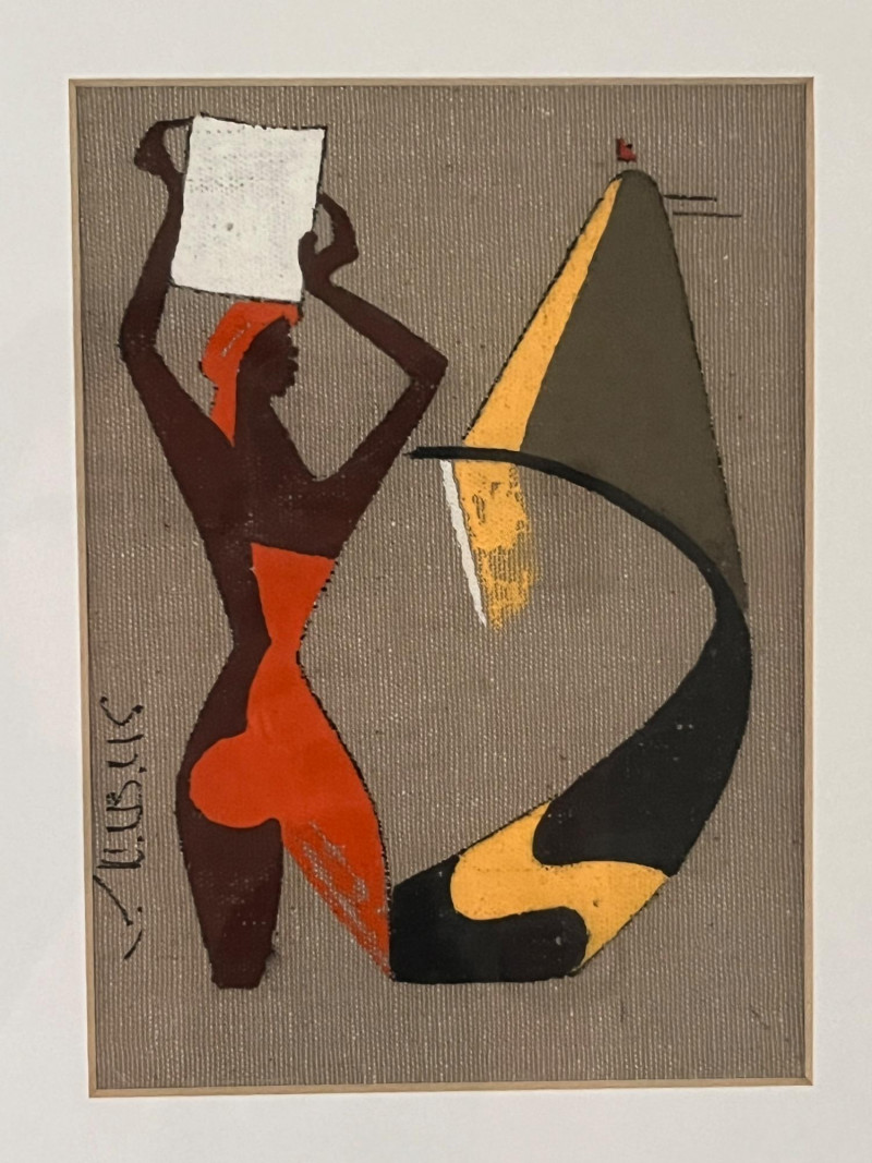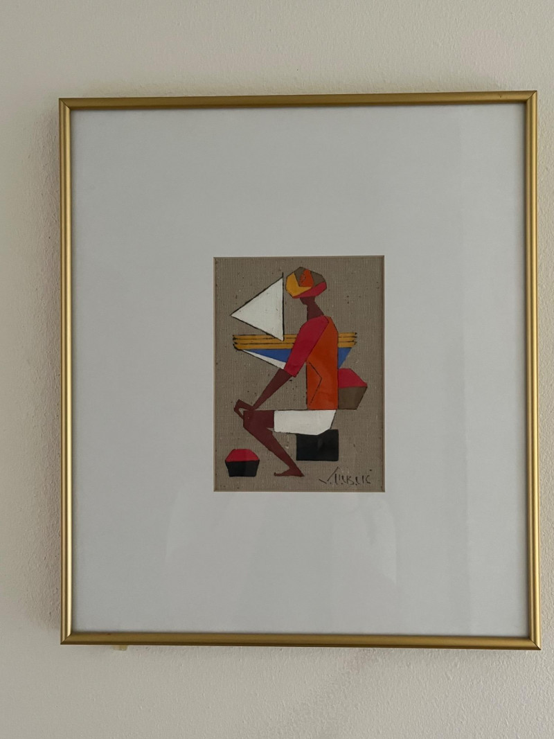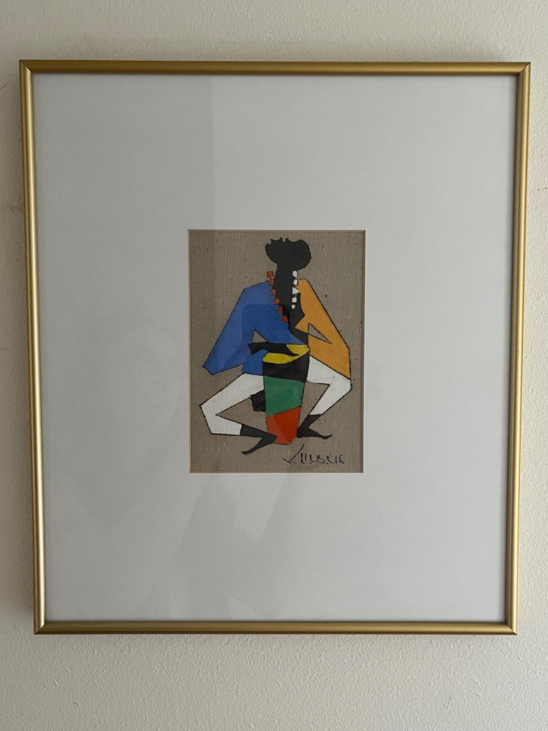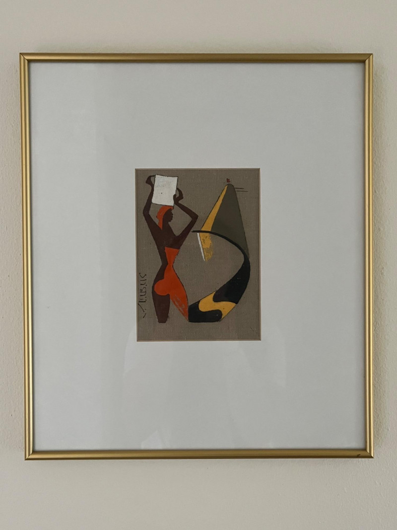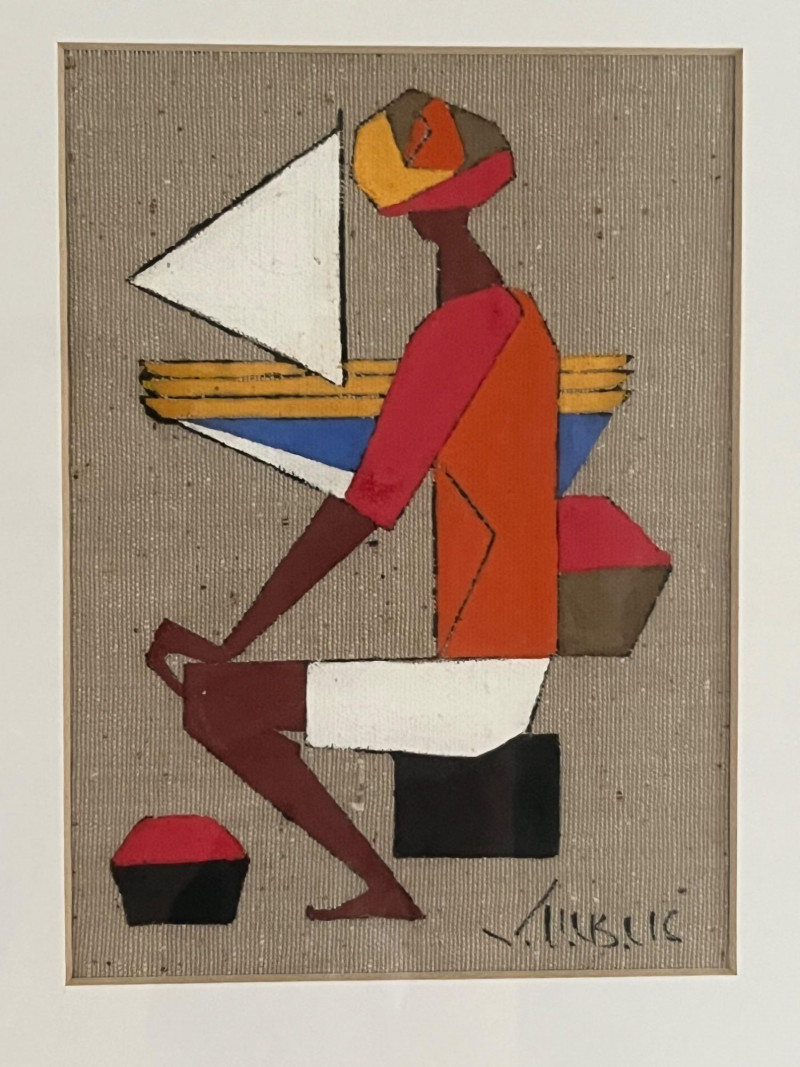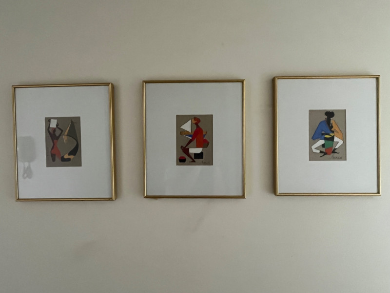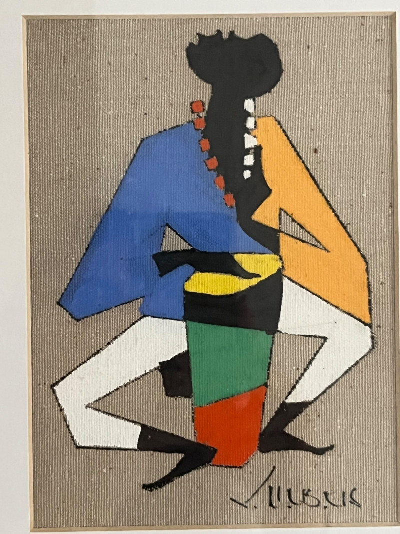 Lot of 3 framed paintings on linen by Brazilian artist Virgilio Nabais. Dated to be 1950s mid century folk art. Nabais creates vibrant gouache paintings on linen featuring people and scenes from his background in Brazil. One piece features a woman holding a sign or paper, another of a seated man, and a colorfully dressed drummer. Each lien art is framed and signed by the artist. Estimated value for each piece varies from $50-$150. Don't miss the chance to liven up an entryway or create a gallery of vintage international art!