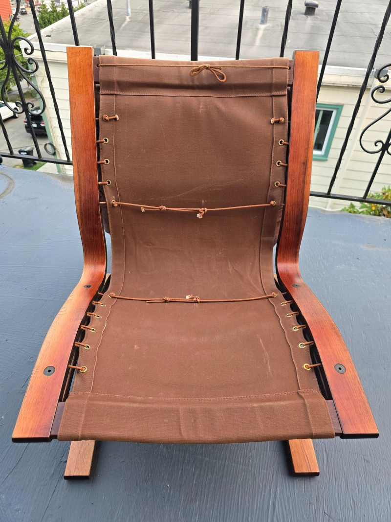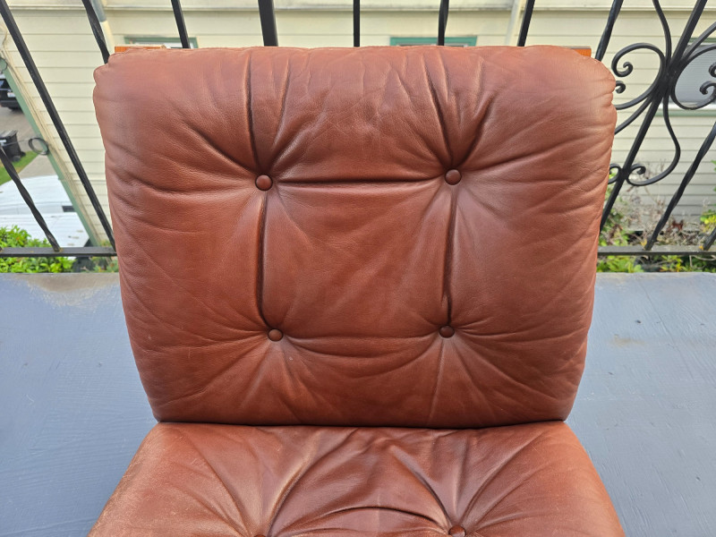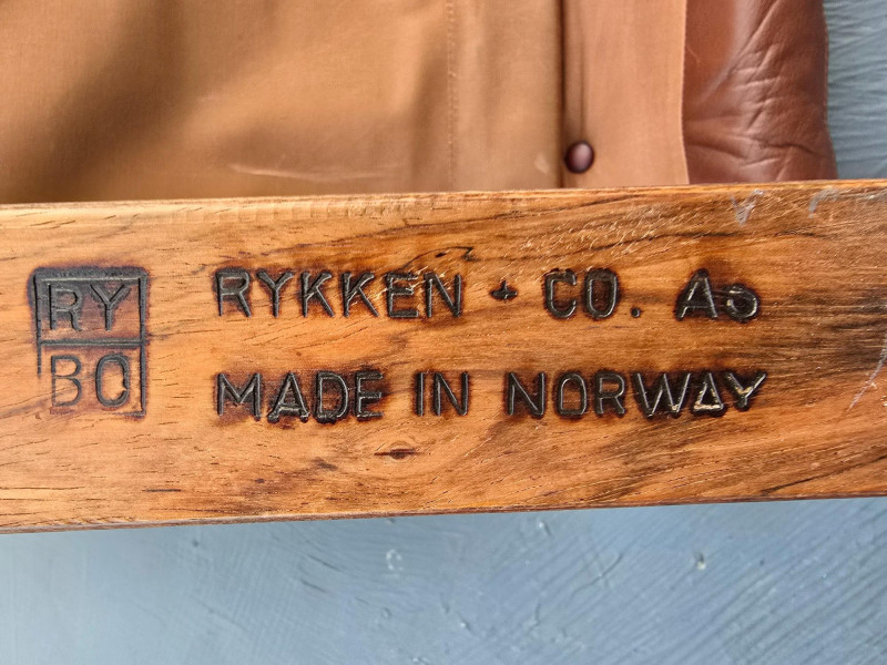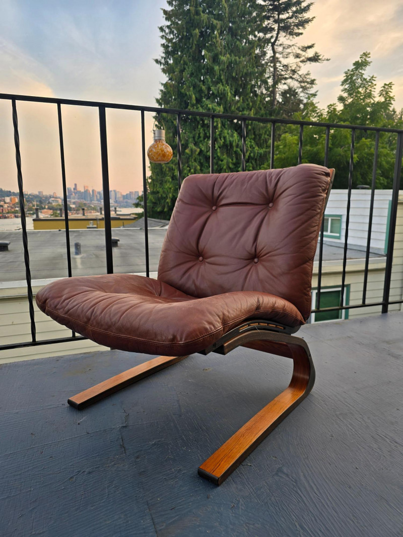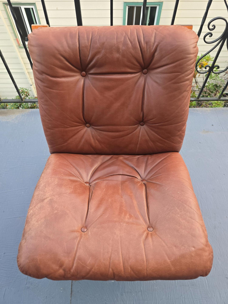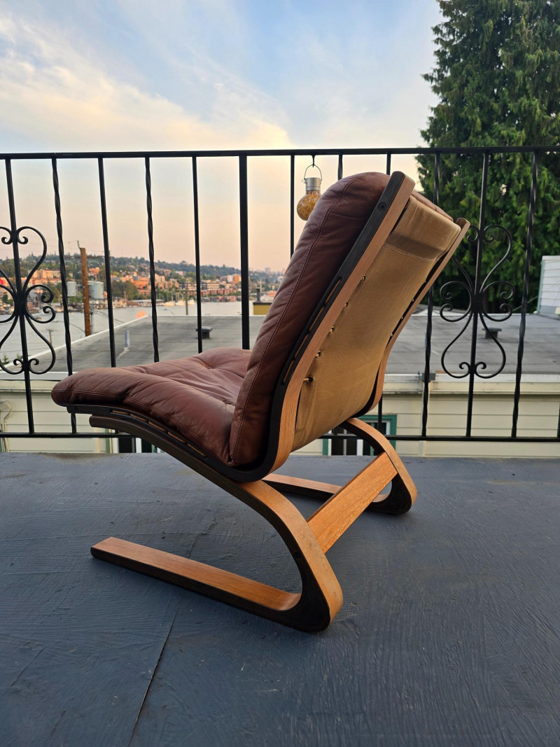 Lovely vintage example of the "Kengu" Lounge chair by Norwegian company RYBO RYKKEN. Plywood structure, leather, teak and Rosewood vineers, heavy canvas backing. Very comfortable and stylish furnature. One of two available in this sale. Both are need need of leather buffing, conditioning, and oil for the wood. Chair is in excellent condition.