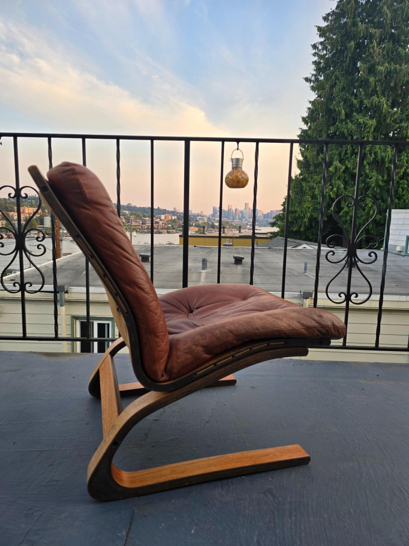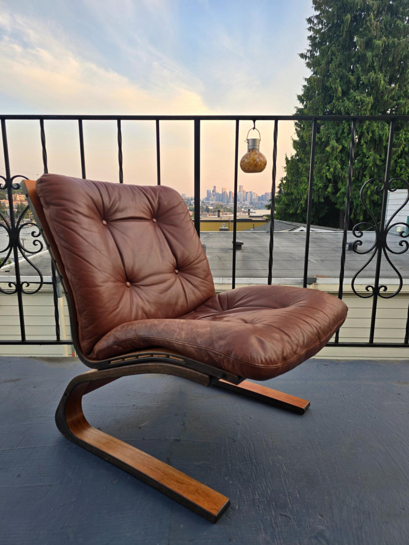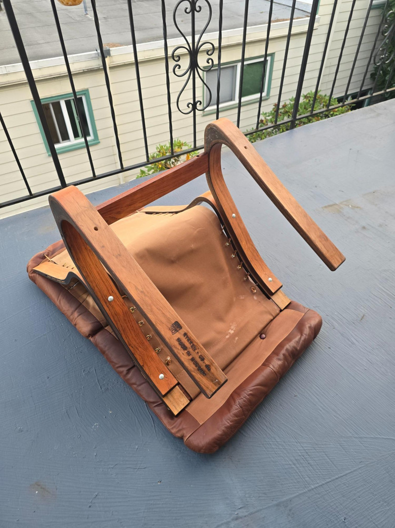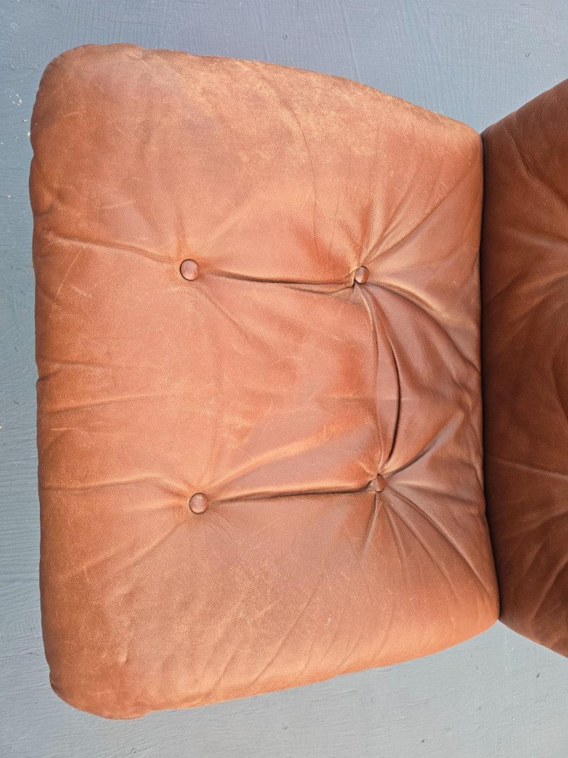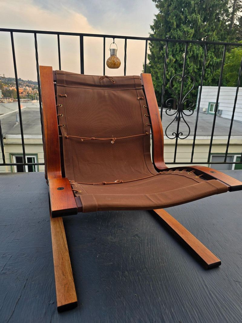 Lovely vintage example of the "Kengu" Lounge chair by Norwegian company RYBO RYKKEN. Plywood structure, leather, teak and Rosewood vineers, heavy canvas backing. Very comfortable and stylish furnature. One of two available in this sale. Both are need need of leather buffing, conditioning, and oil for the wood. Chair is in excellent condition.