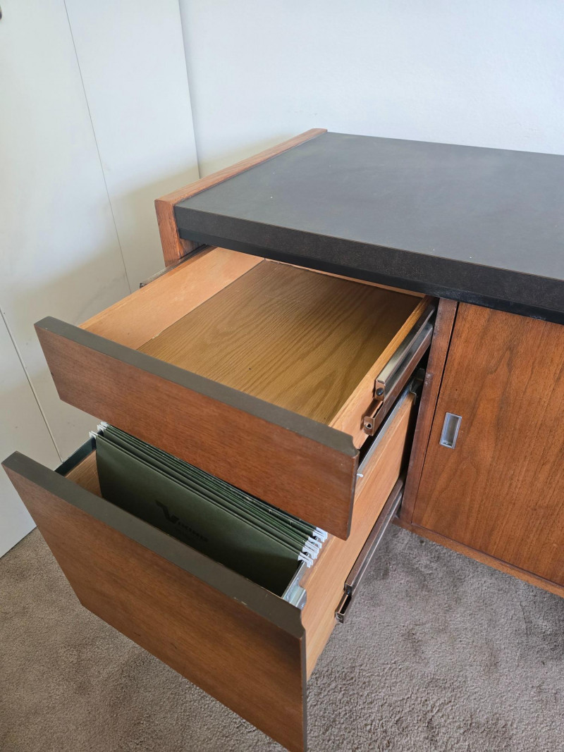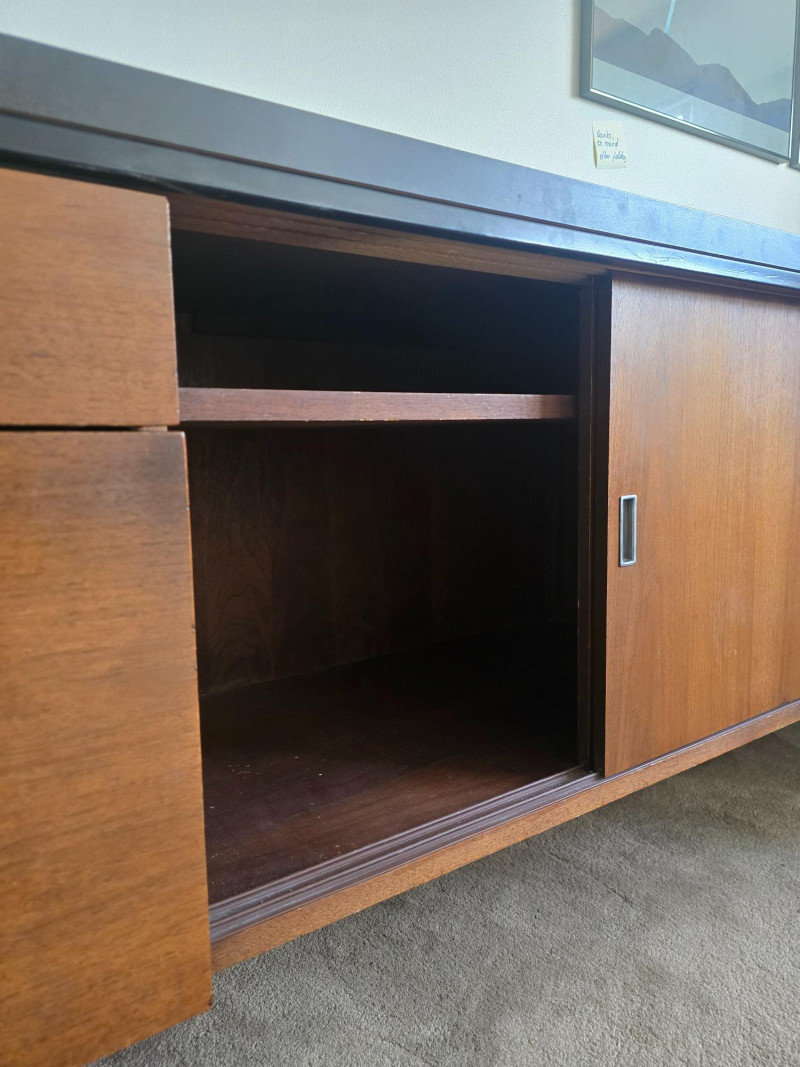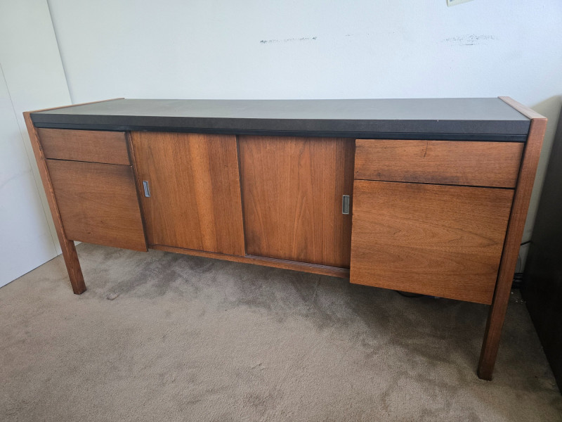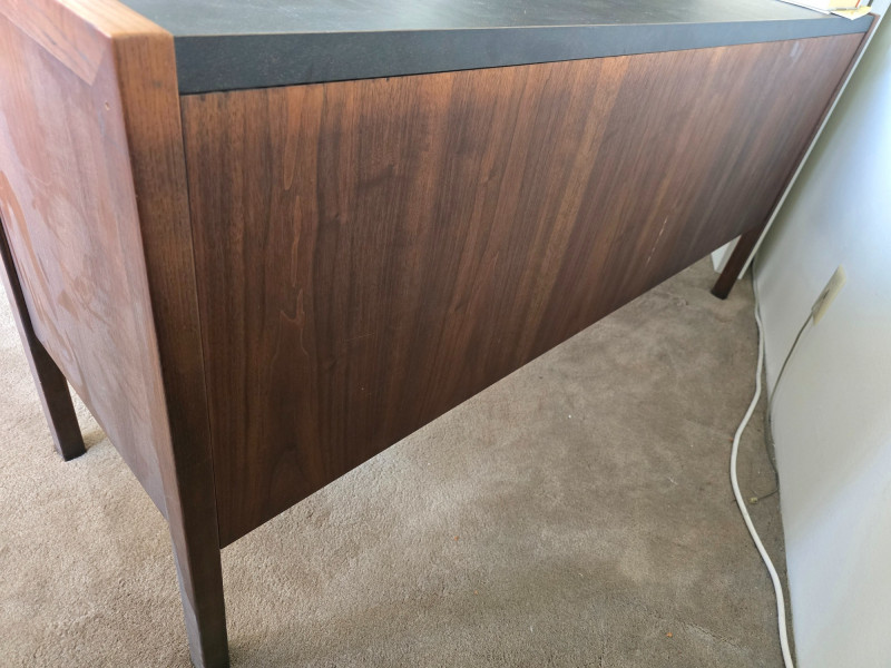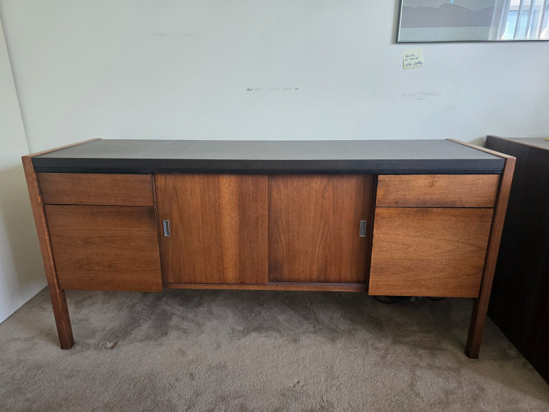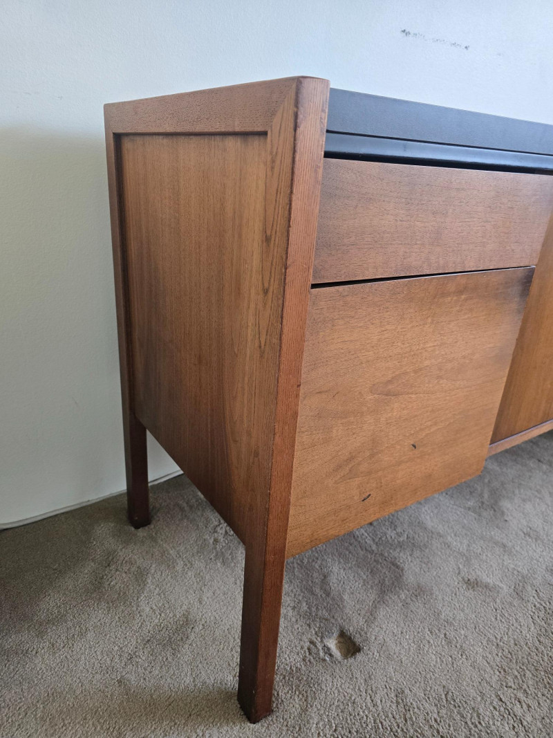 Walnut office credenza by Biltrite of Canada. Fully finished backside is ideal so you don’t have to place it against a wall. The unit has two small drawers and two larger, filing drawers. Two sliding doors open to reveal an open storage area. Black accenting along front edge is in excellent condition, and thick, wear-resistant laminate top surface. This piece is a true office credenza with two file drawers and ample storage at center. Ideal for a home or commercial office. The unit was mounted to a wall or other piece of furnature. And has screw holes noticeable on the right hand side. As well as a scratch in the center of the unit on the backside.