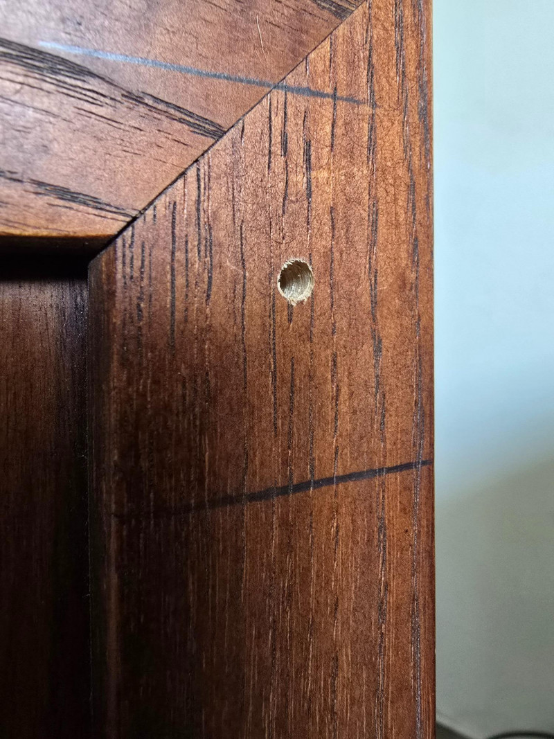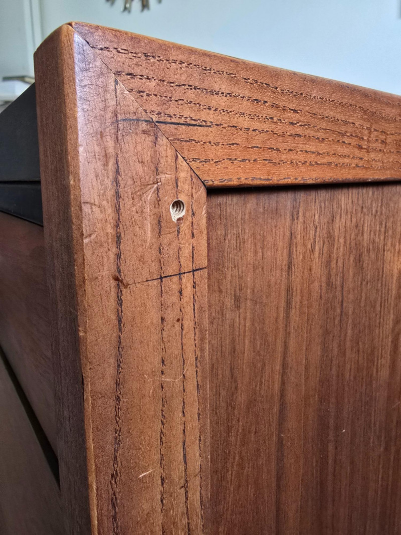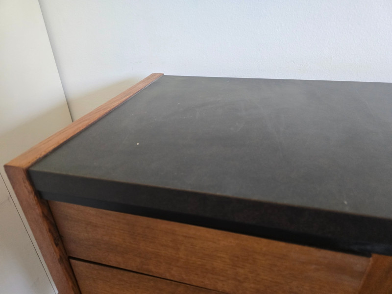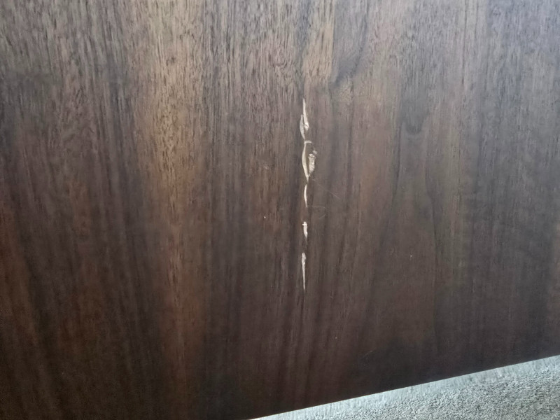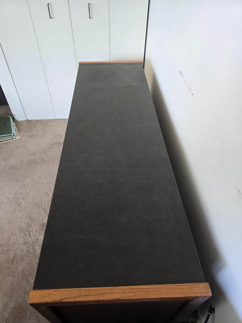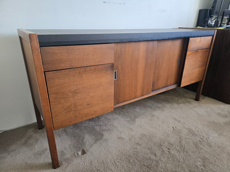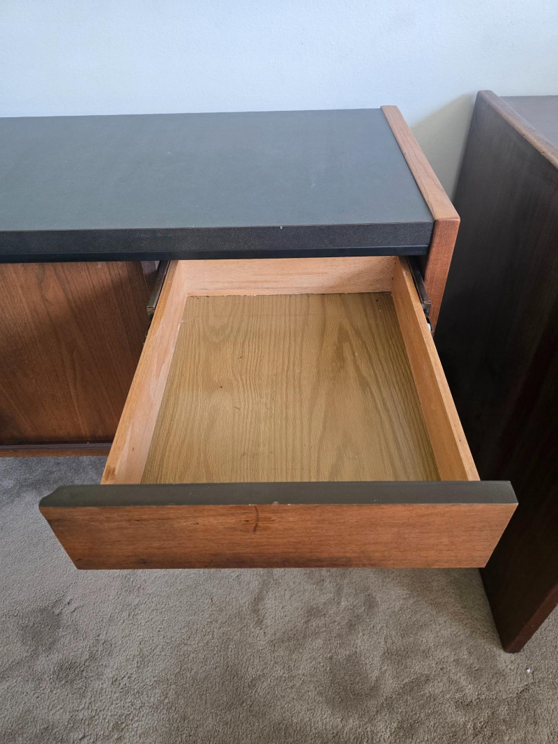 Walnut office credenza by Biltrite of Canada. Fully finished backside is ideal so you don’t have to place it against a wall. The unit has two small drawers and two larger, filing drawers. Two sliding doors open to reveal an open storage area. Black accenting along front edge is in excellent condition, and thick, wear-resistant laminate top surface. This piece is a true office credenza with two file drawers and ample storage at center. Ideal for a home or commercial office. The unit was mounted to a wall or other piece of furnature. And has screw holes noticeable on the right hand side. As well as a scratch in the center of the unit on the backside.