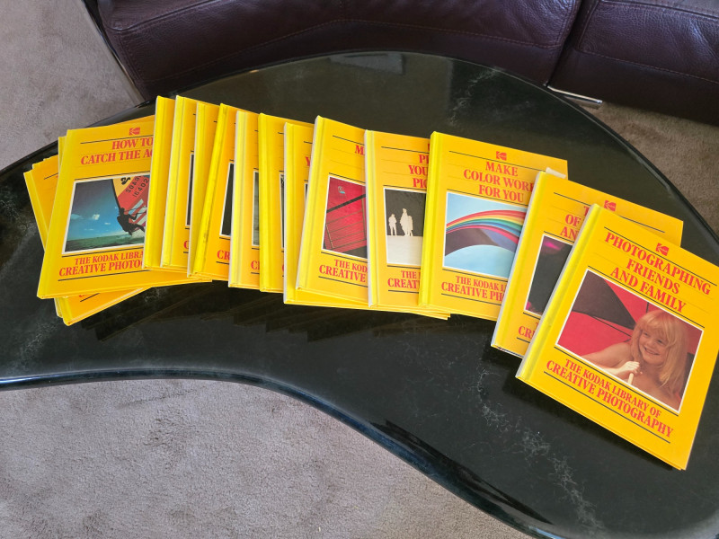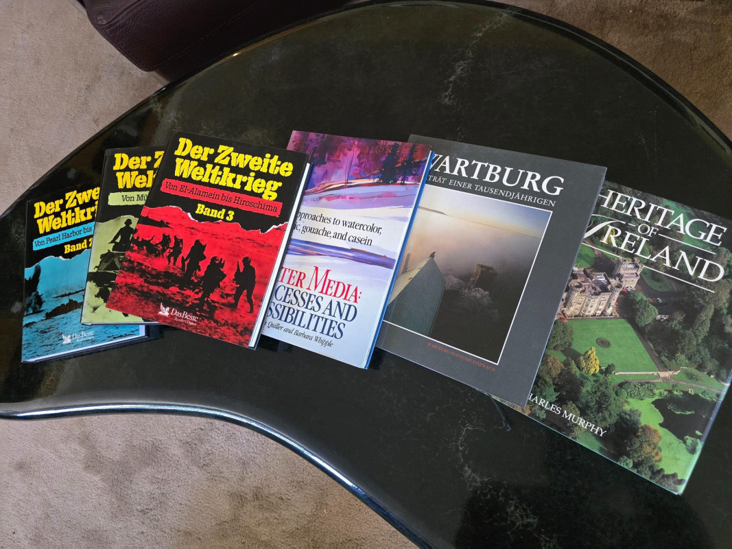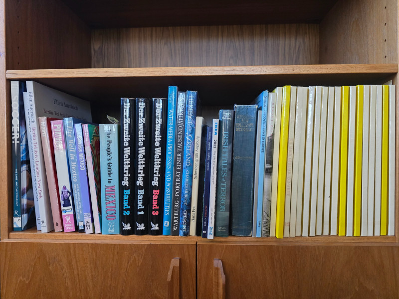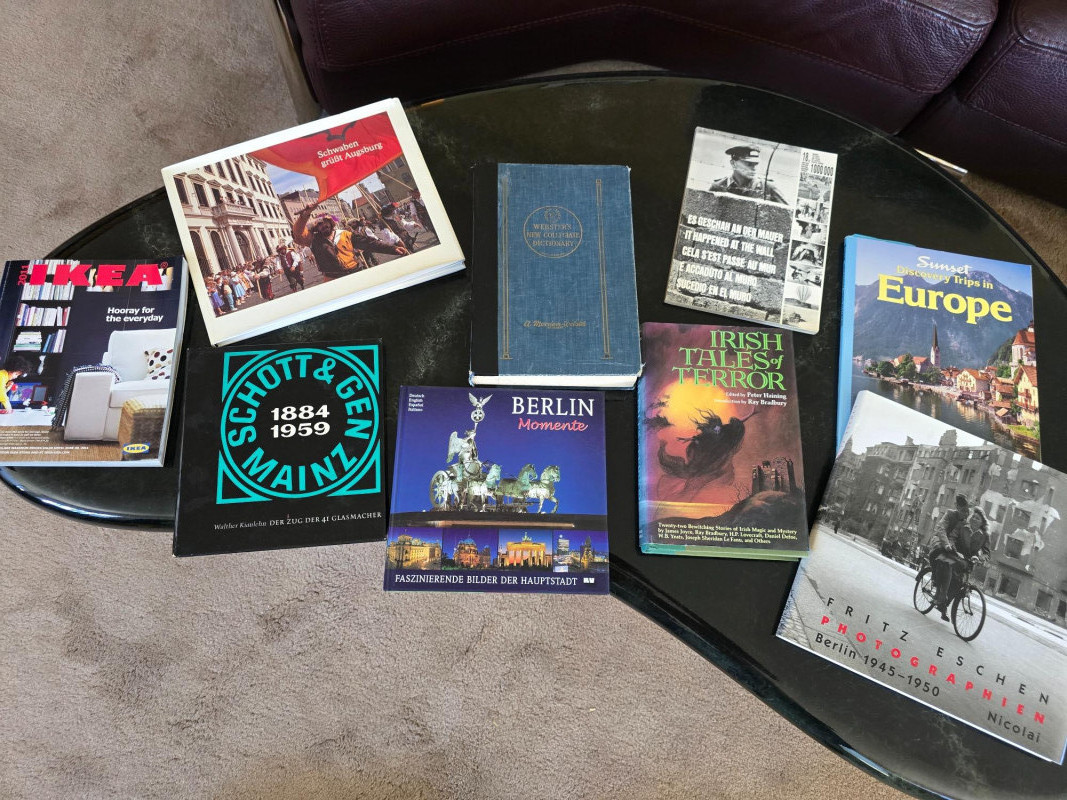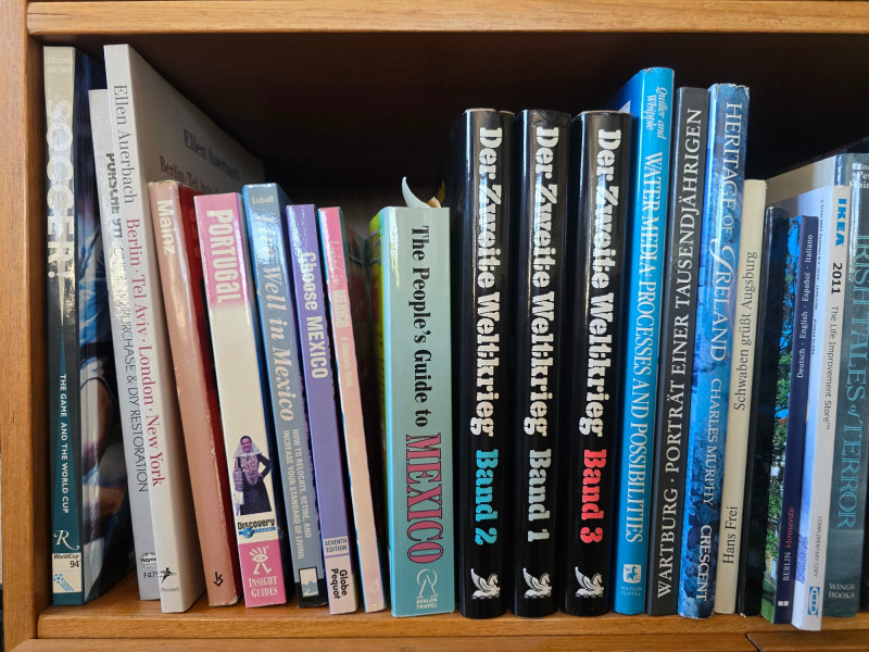 Lot of books on traveling and photography. Travel books are global, but have many European themes. Some books are in the German language.