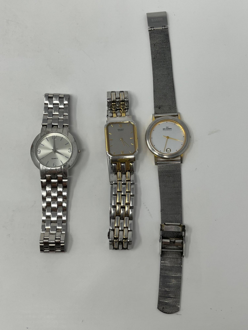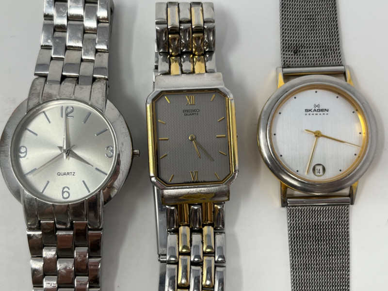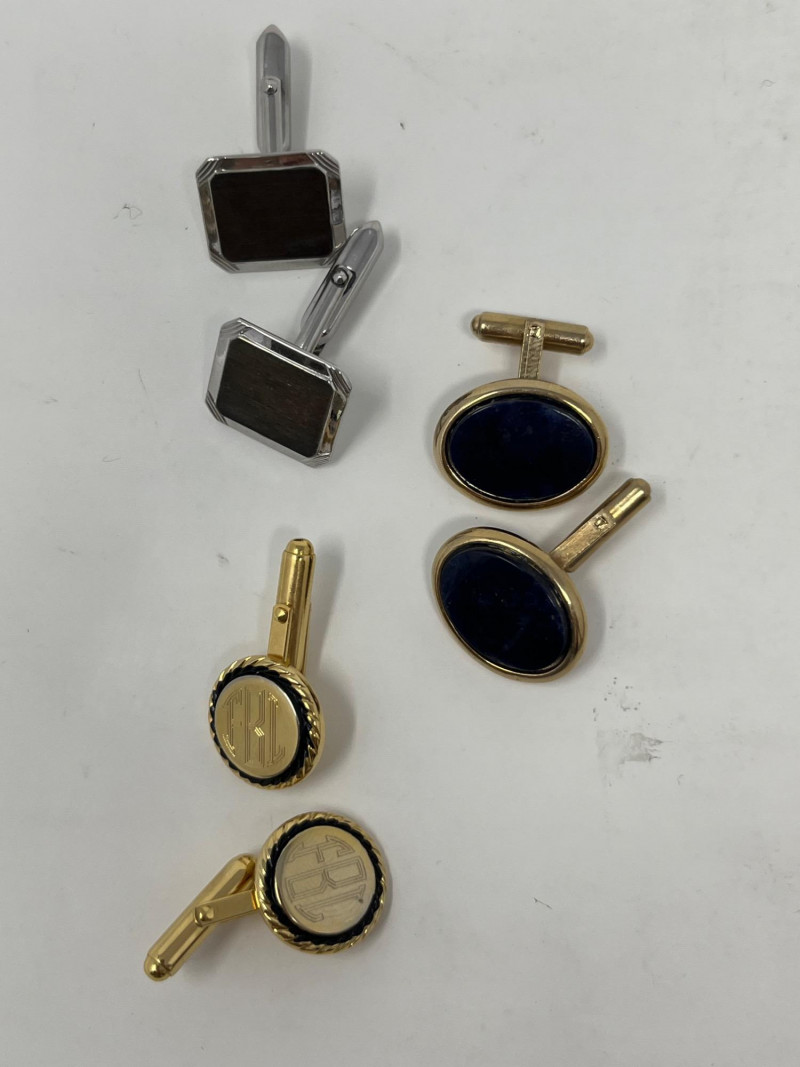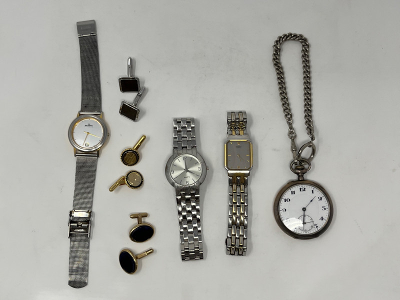 Lot of mens accessories. Lot includes 3 pairs of cufflinks, 3 wristwatches, and a pocket watch.