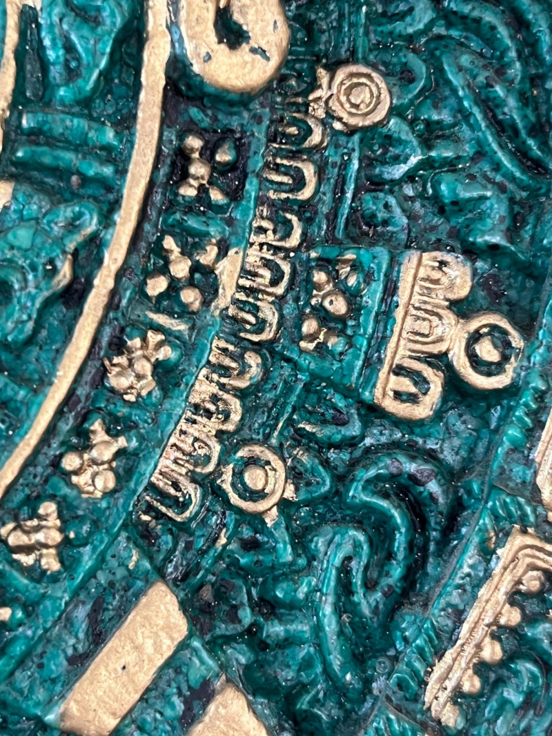 Vintage malachite plaque in the design of an Aztec calendar. Intricate carved detail throughout the surface of the piece with geometric and organic patterns. The gold is mostly in tact, but has worn somewhat in spots, giving a further antiqued handmade style. Unmarked and undated felt back with hole for hooking onto the wall.