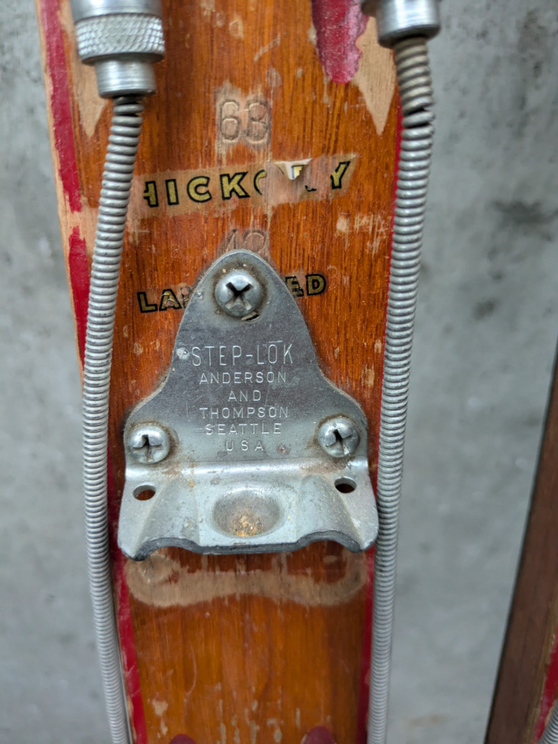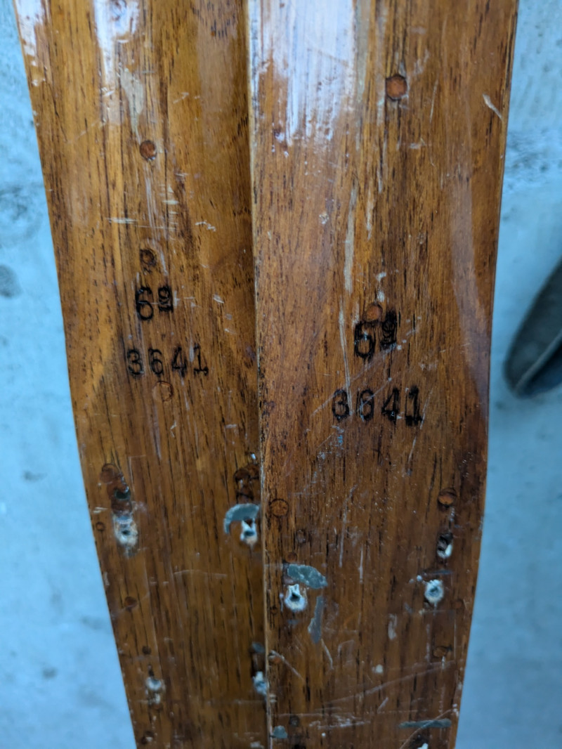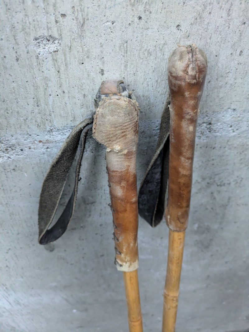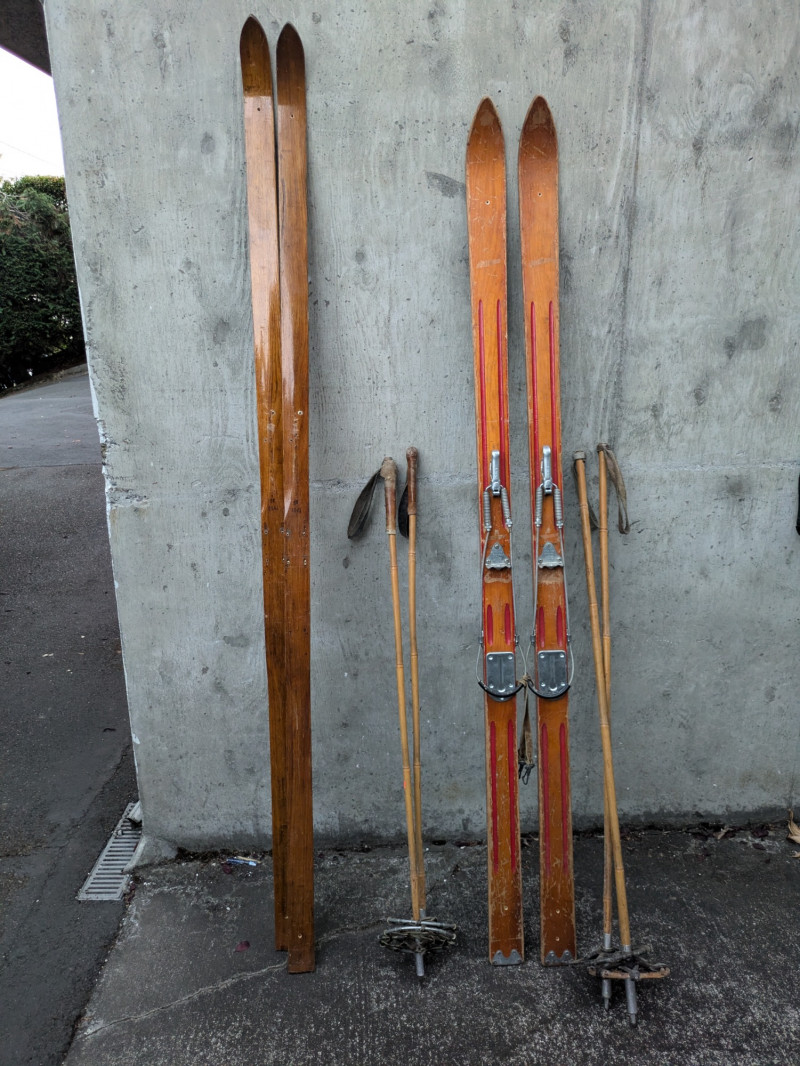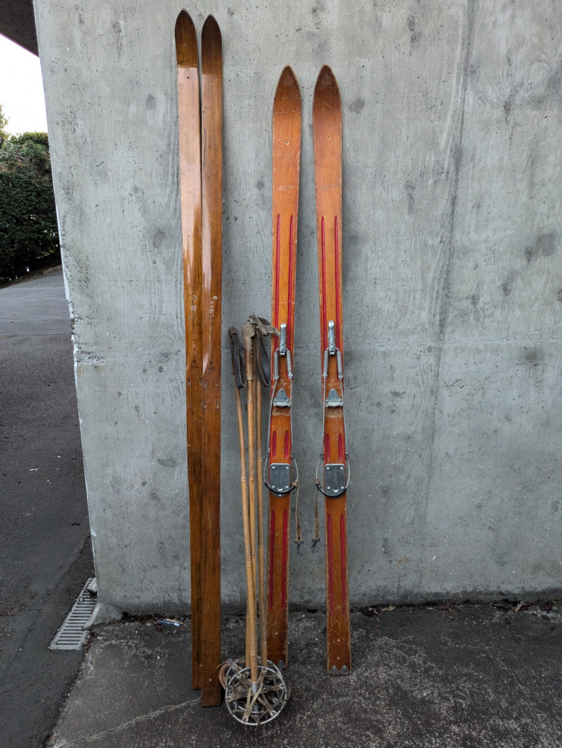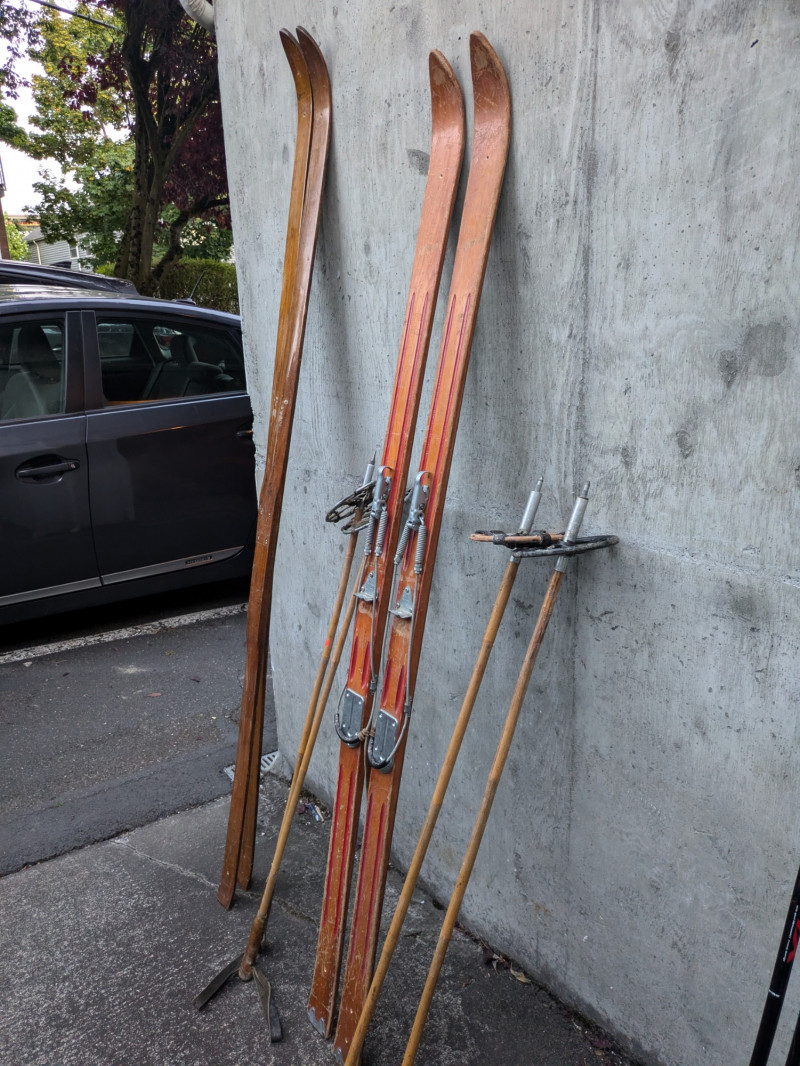 Lot of vintage skis and poles- wood with stainless steel hardware that has preserved well. Not recommended for regular use. Makes a great decor piece for any winter sports lover or holiday cabin.