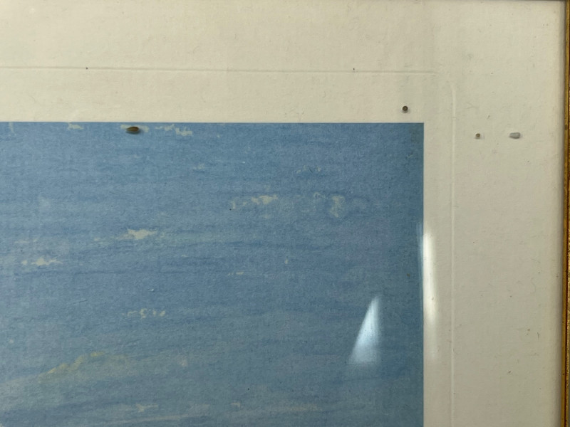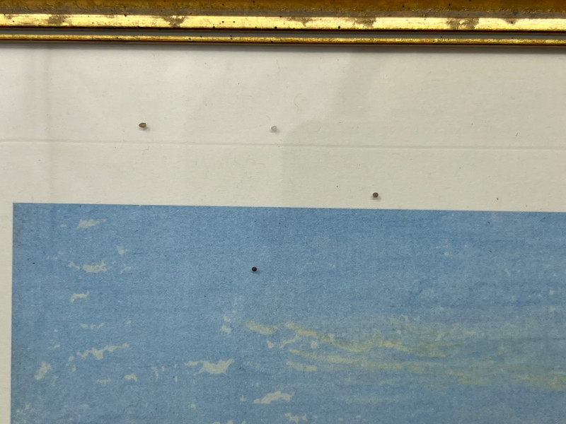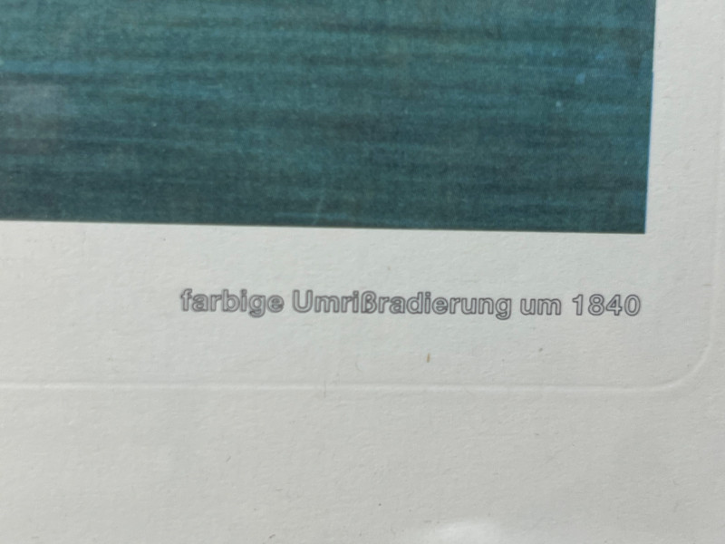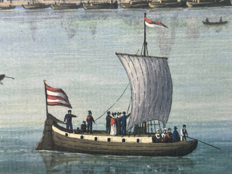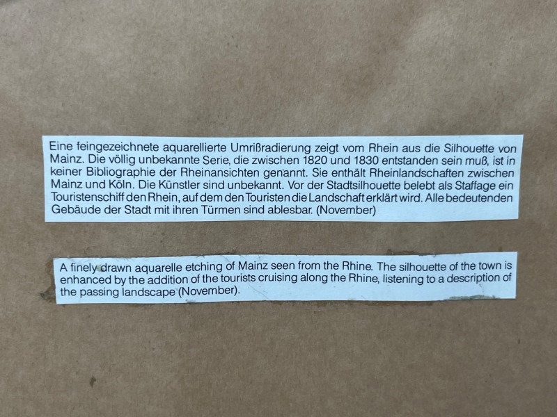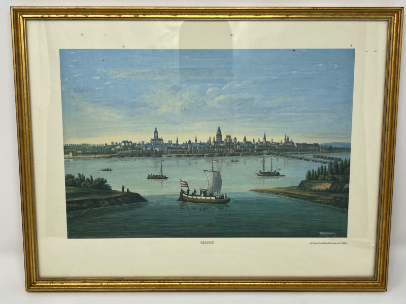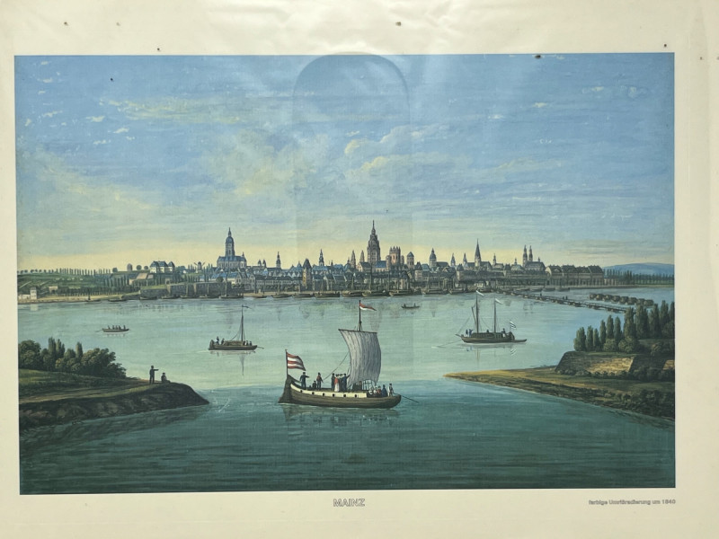 Beautifully illustrated print of a panoramic scene of Mainz, Germany in 1840. Situated along the Rhine river, this print shows ships crossing along the river passing along the 19th century Mainz cityline. No date or signature on this piece. The back of the frame has the following information typed in English "A finely drawn aquarelle etching of Mainz seen from the Rhine. The silhouette of the town is enhanced by the addition of the tourists cruising along the Rhine, listening to a description of the passing landscape (November)." Matted and framed, this is a great piece for any historian or collector of German art and history. The glass on the frame has some blemishes, but the piece itself is perfectly preserved.