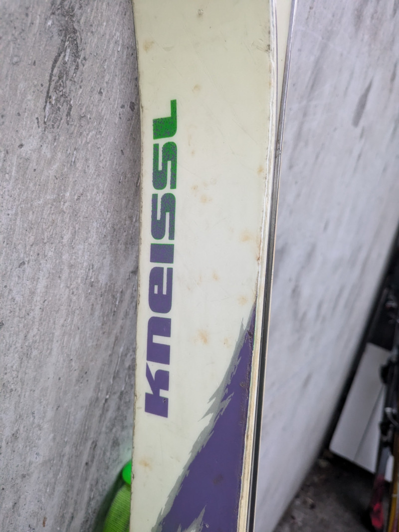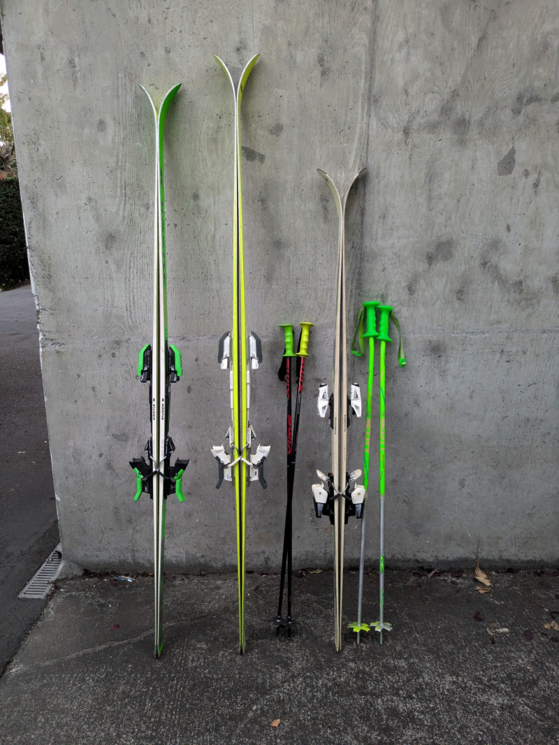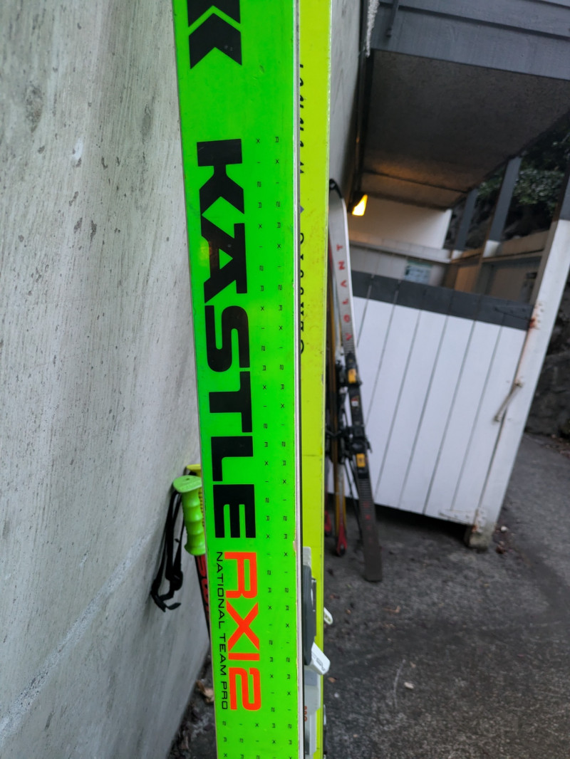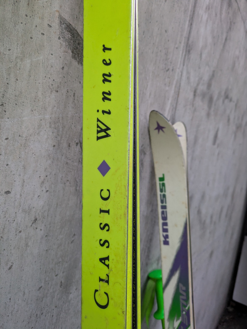 Lot of neon green ski equipment. Great condition and ready for the upcoming winter season. Brands visible are Kastle, Kneissl, among others. Enough to take the whole family skiing!