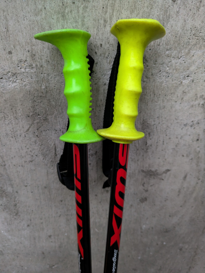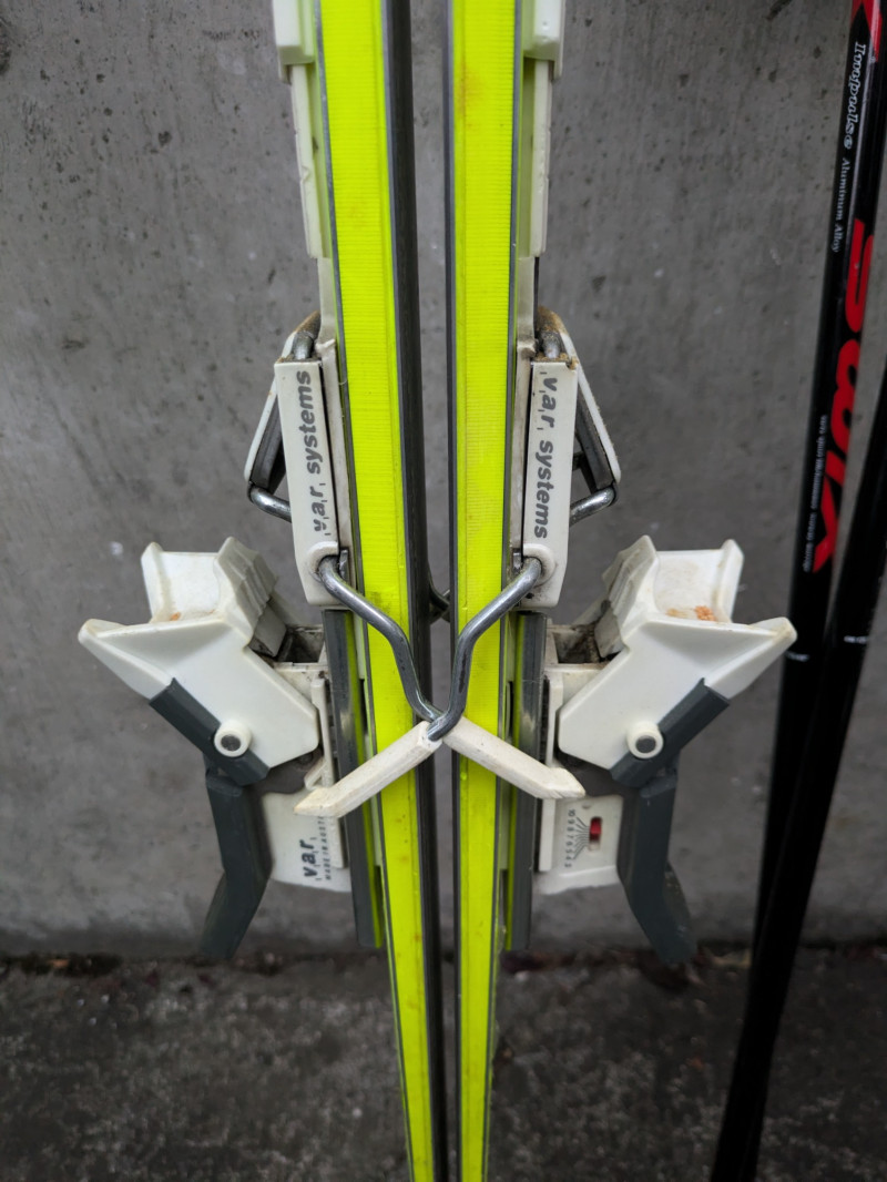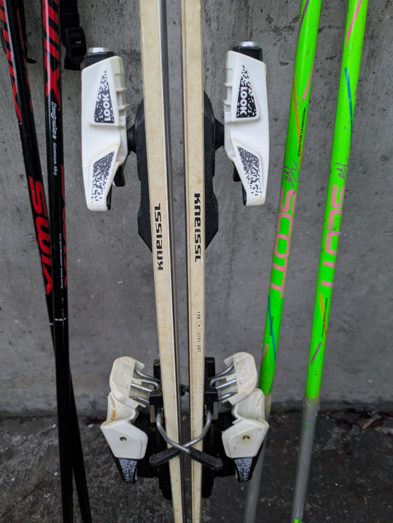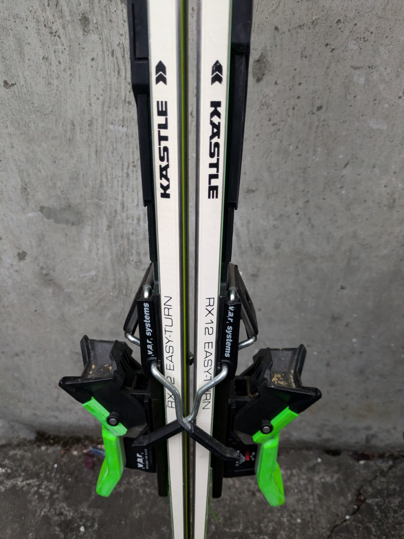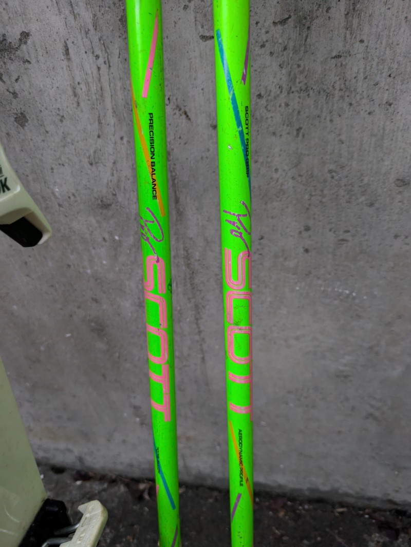 Lot of neon green ski equipment. Great condition and ready for the upcoming winter season. Brands visible are Kastle, Kneissl, among others. Enough to take the whole family skiing!