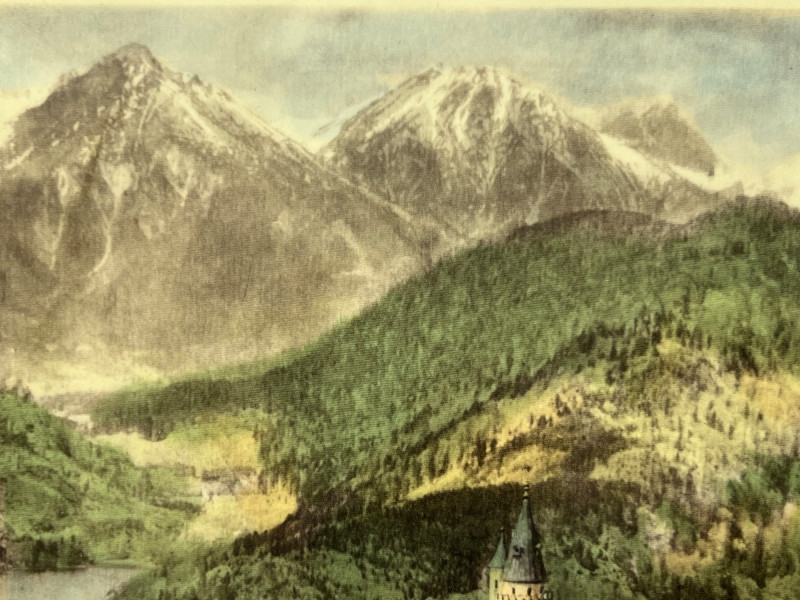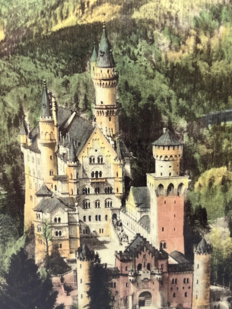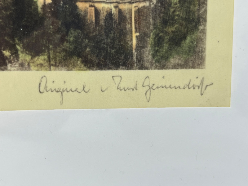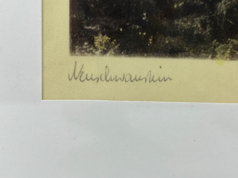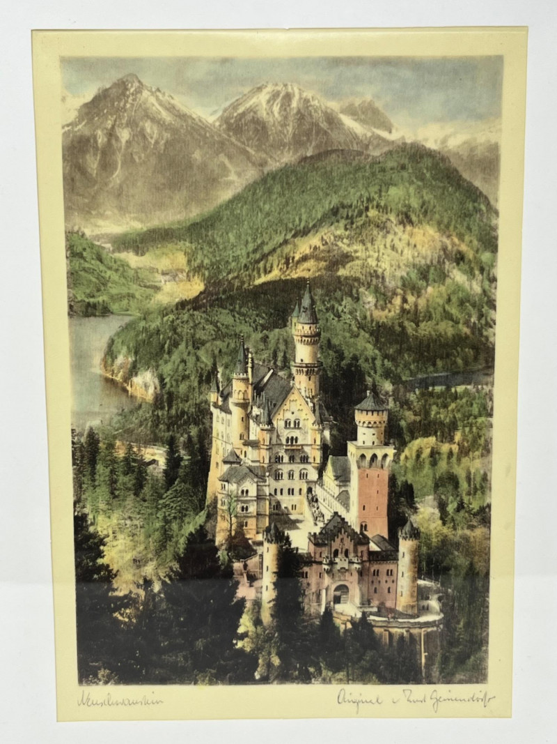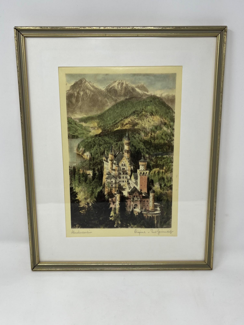 Framed print on silk of Neuschwanstein Castle in Bavaria, Germany. One of the many historic castles of Germany, this 19th century Romanesque Revival palace is a stately piece for any office or library space. Lower left corner is handwritten cursive identifying the castle as Neuschwanstein, while the lower right corner stating "Original Paul Geissler". Paul Geissler (1881-1965) was one of the foremost German etchers of his time. Known for landscapes, figures, and street scenes from around the world. Come home to Bavaria with this piece hung proudly on your wall.