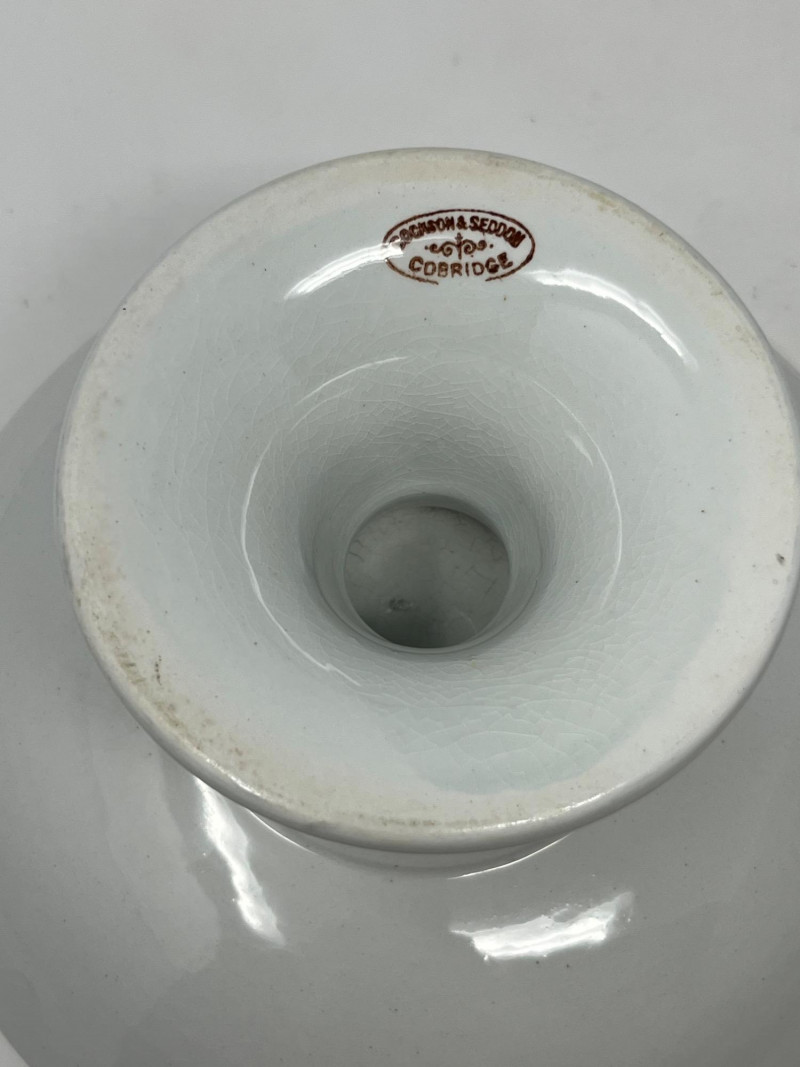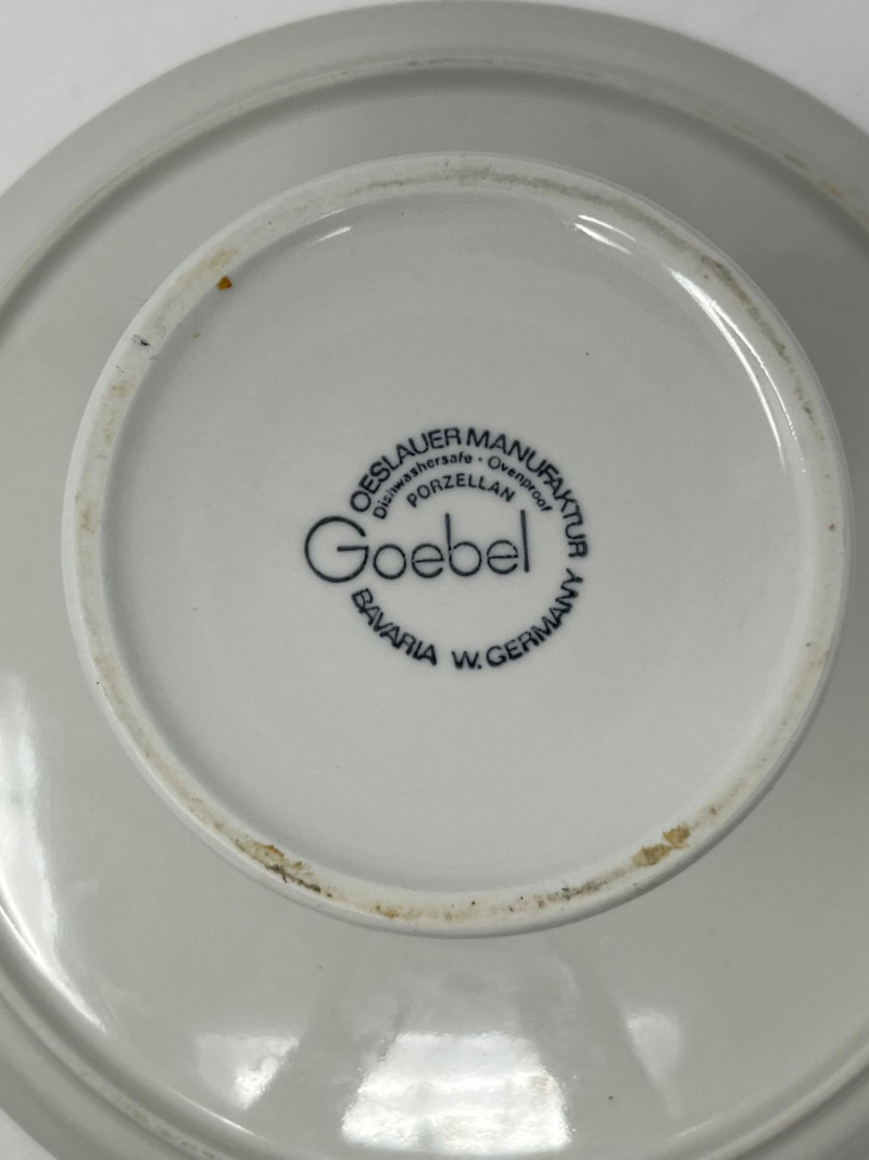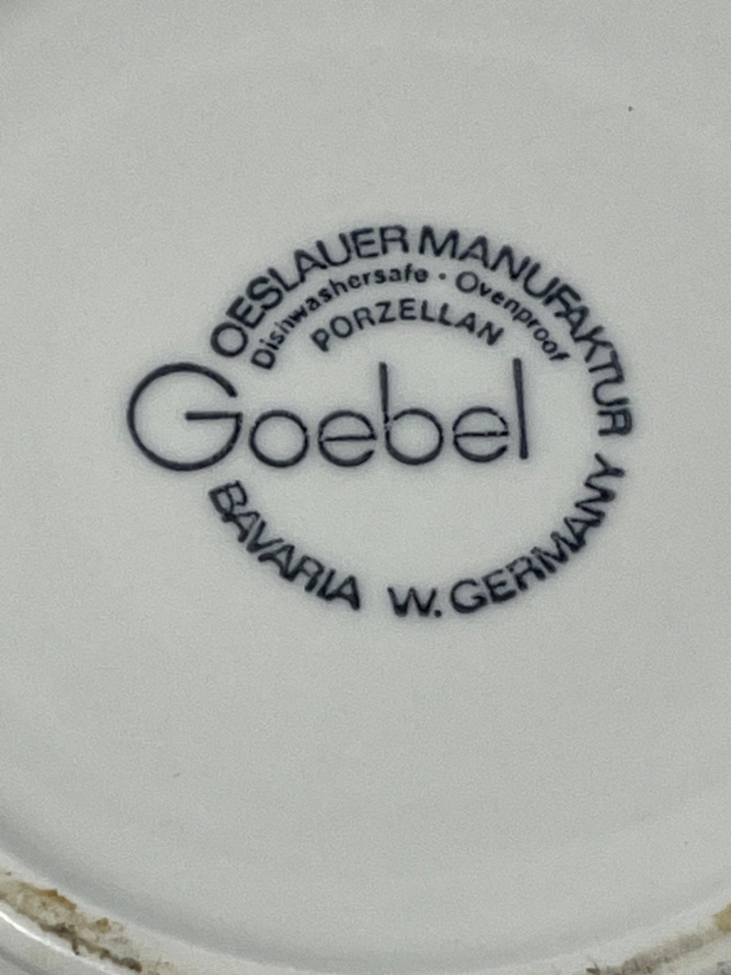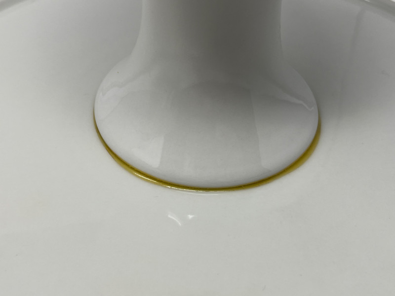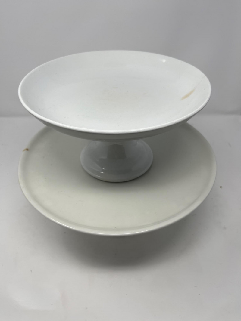 Lot of 2 cake stands. Great for showing off your baking skills, or decorating for a party. Both are branded, with the smaller being labeled John Edward Cobridge and the larger labeled as Goebel West Germany. The smaller of the two has a small design that looks like the end of wheat. Both are in great condition with no chips or dents.
