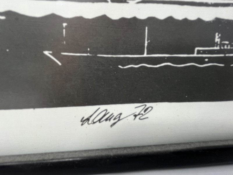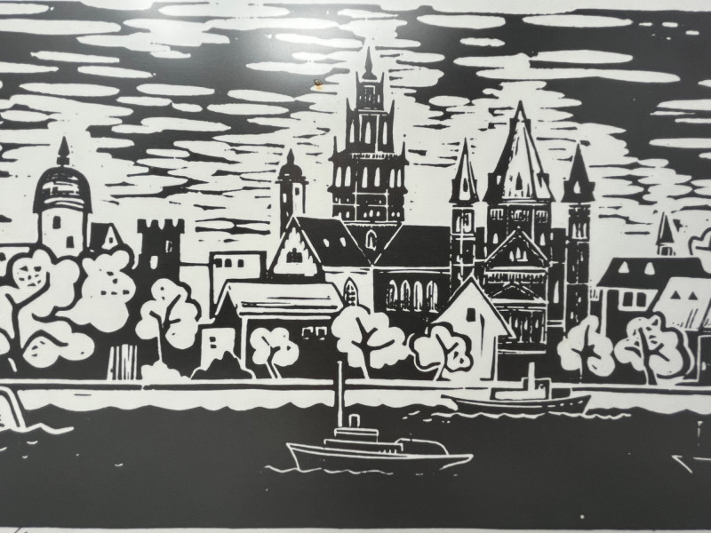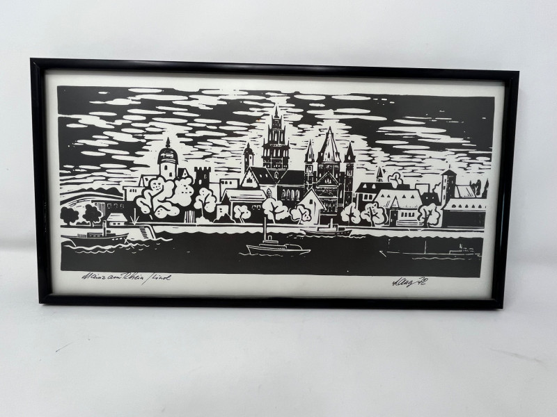 Panorama of Mainz, Germany from the Rhine river. Bottom left corner has the title of the piece written in cursive. The bottom right corner has a signature and the date '72.