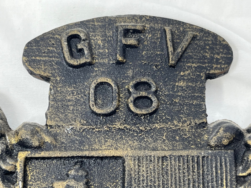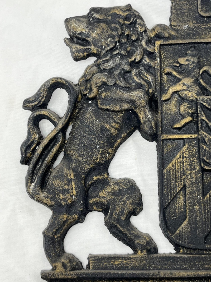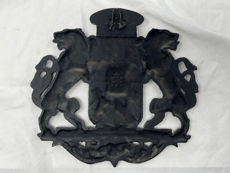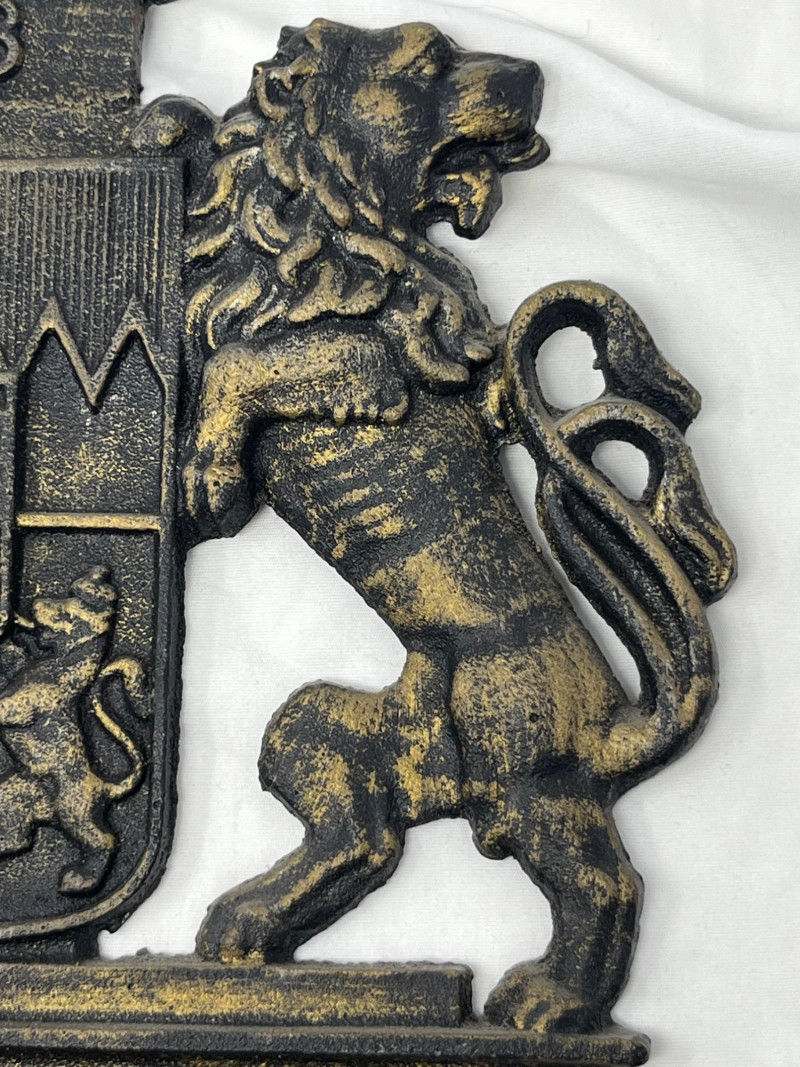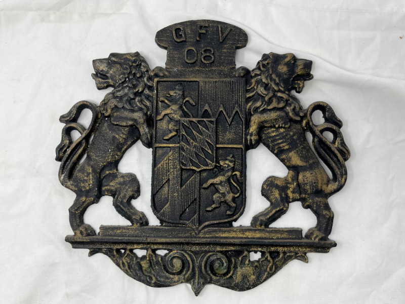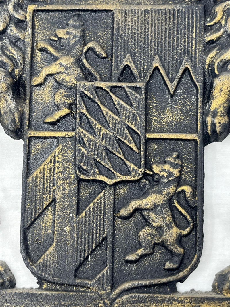 Vintage metal wall hanging of the Bavarian coat of arms. Back of the piece has a makers mark. Each section of the coat of arms has significant meaning: Franconian Rake: Refers to three regions of Franconia and first appeared as the sign of the bishopric Würzburg. Blue Panther: Symbolizes Upper and Lower Bavaria and was once associated with the Ortenburg family. Three Stacked Lions: Represent Swabia and were the coat of arms of the Staufers (Hohenstaufen family). Heart Shield (blue and white lozenges): This central element symbolizes Bavaria as a whole and is also seen on the Bavarian flag.